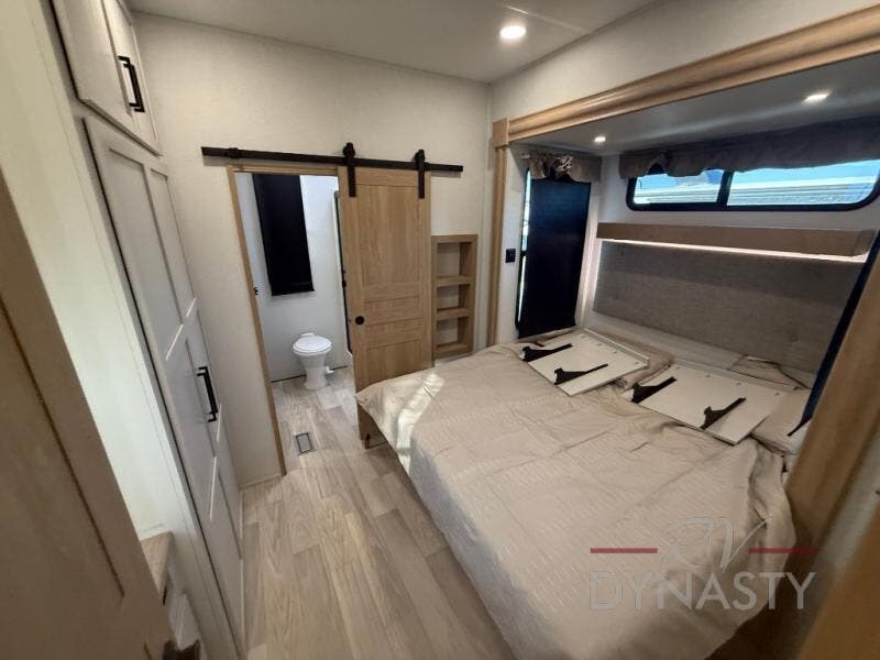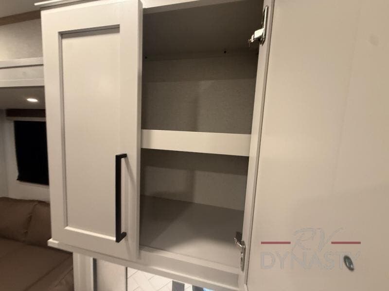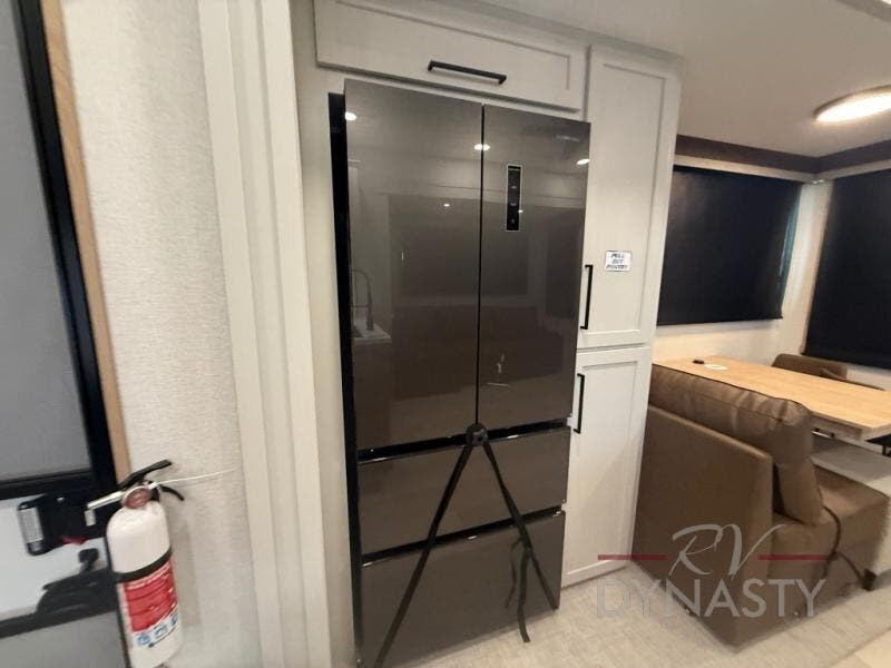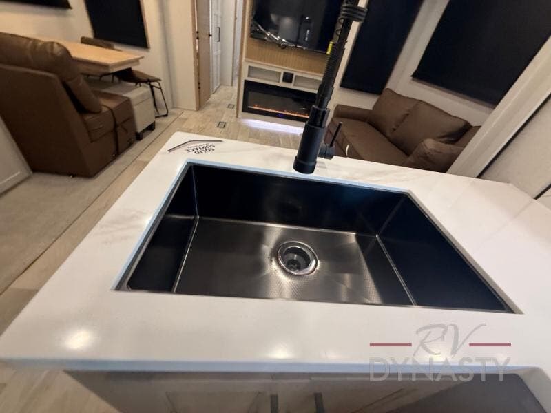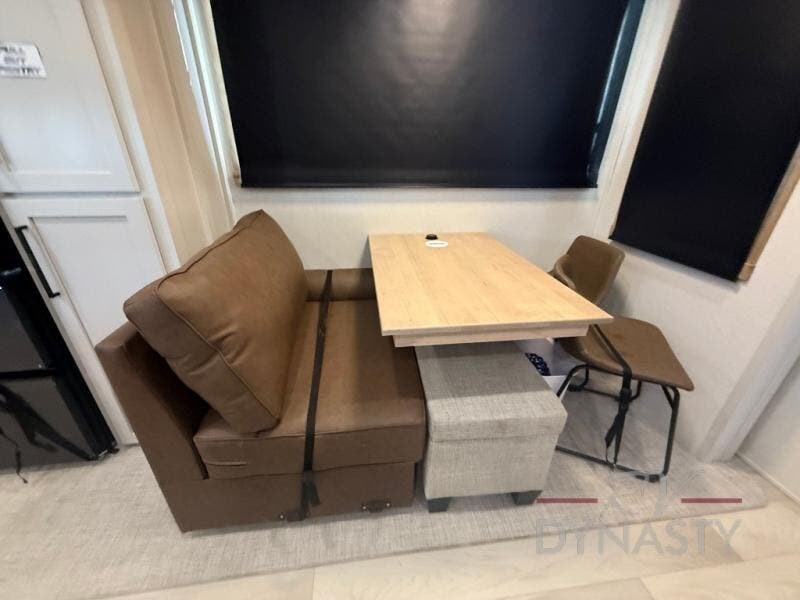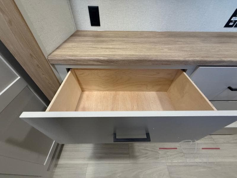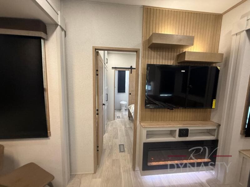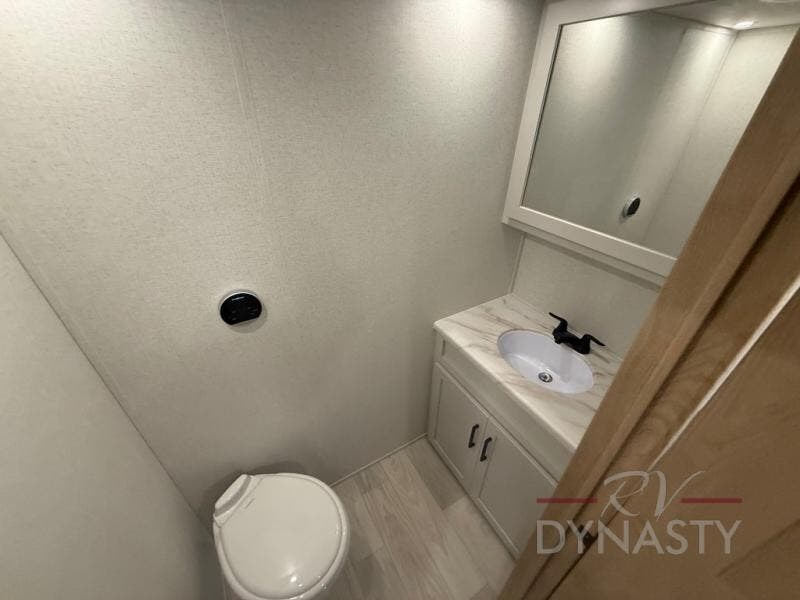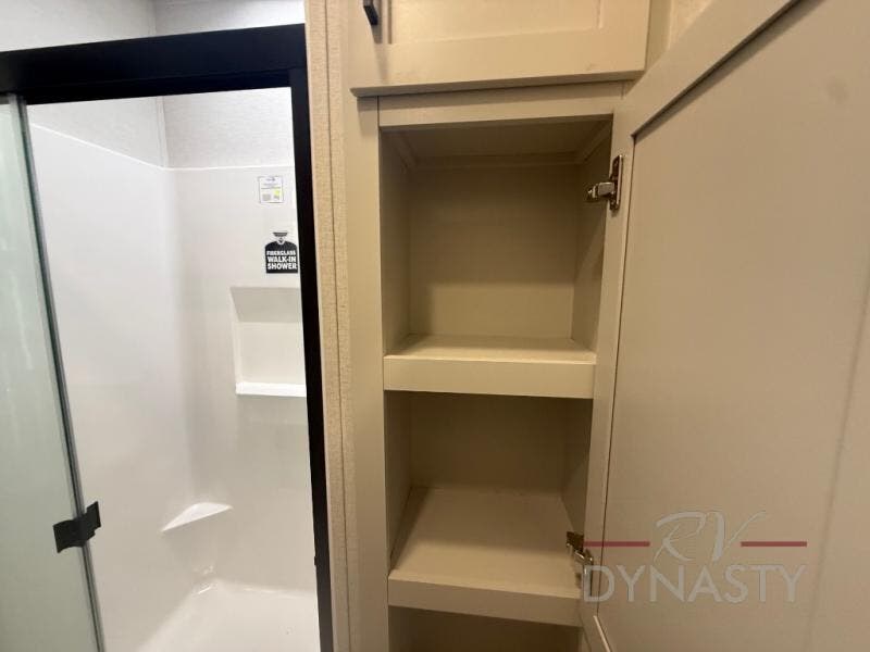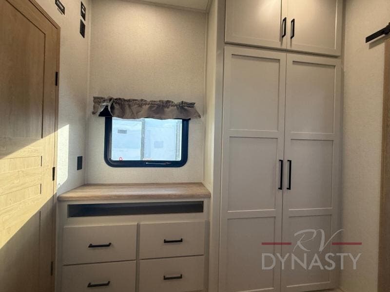 This fifth wheel is thoughtfully designed for comfort and convenience, starting with a spacious front bunkhouse perfect for accommodating guests. It features two flip-up bunks, 28" x 74" and 32" x 74" and a 60" x 74" fold-out lounge, along with a wardrobe, dresser, and additional storage to keep essentials organized. A nearby half bath adds easy access and extra convenience. At the center of the unit, the kitchen offers everything you need to prepare meals, including a stainless-steel sink, three-burner cooktop, and a generous 16 cu. ft. refrigerator. Meals can be enjoyed at the free-standing dinette, or you can unwind on the sectional sofa while enjoying the fireplace or entertainment center. At the rear, you'll find the private main bedroom with a roomy 66" x 80" RV king bed, plus its own wardrobe and dresser. Just steps away is the full bathroom featuring a one-piece fiberglass shower, sink with medicine cabinet, linen storage, and even washer/dryer prep for extended stays.