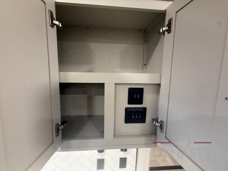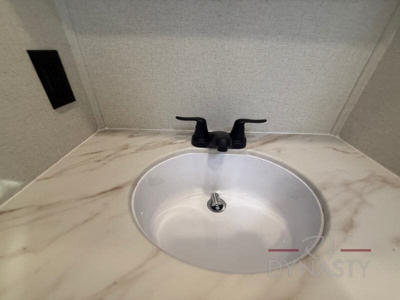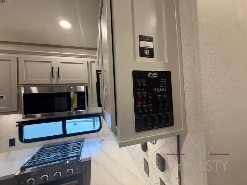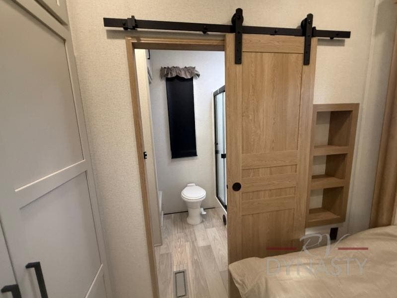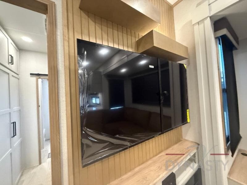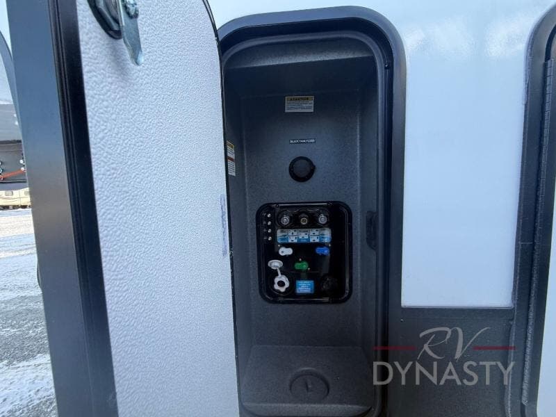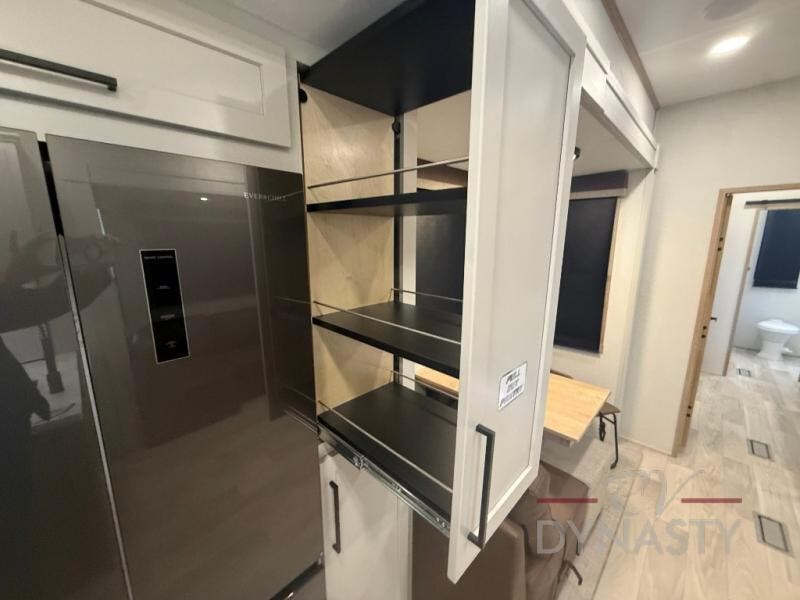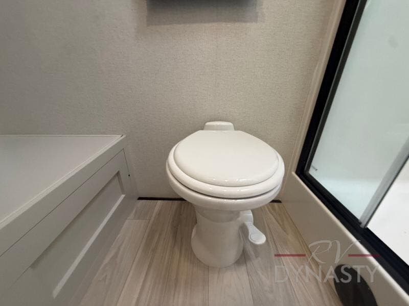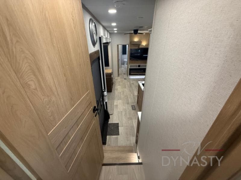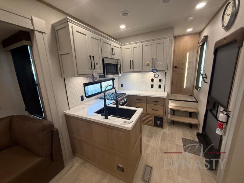 This fifth wheel is thoughtfully designed for comfort and convenience, starting with a spacious front bunkhouse perfect for accommodating guests. It features two flip-up bunks, 28" x 74" and 32" x 74" and a 60" x 74" fold-out lounge, along with a wardrobe, dresser, and additional storage to keep essentials organized. A nearby half bath adds easy access and extra convenience. At the center of the unit, the kitchen offers everything you need to prepare meals, including a stainless-steel sink, three-burner cooktop, and a generous 16 cu. ft. refrigerator. Meals can be enjoyed at the free-standing dinette, or you can unwind on the sectional sofa while enjoying the fireplace or entertainment center. At the rear, you'll find the private main bedroom with a roomy 66" x 80" RV king bed, plus its own wardrobe and dresser. Just steps away is the full bathroom featuring a one-piece fiberglass shower, sink with medicine cabinet, linen storage, and even washer/dryer prep for extended stays.