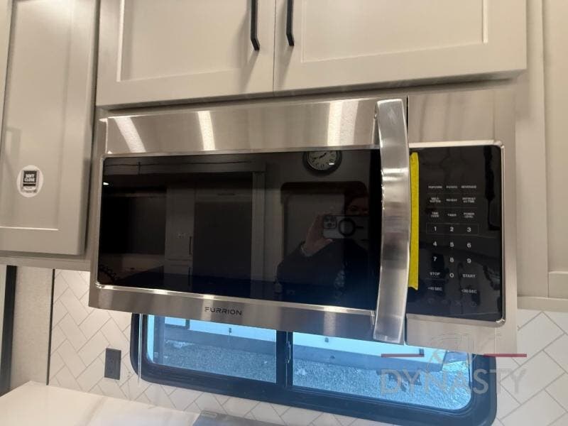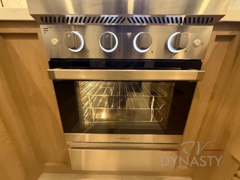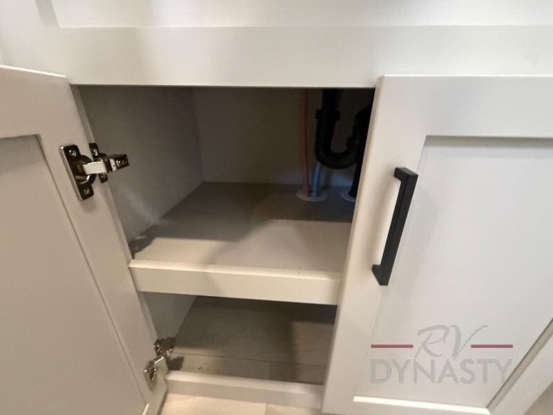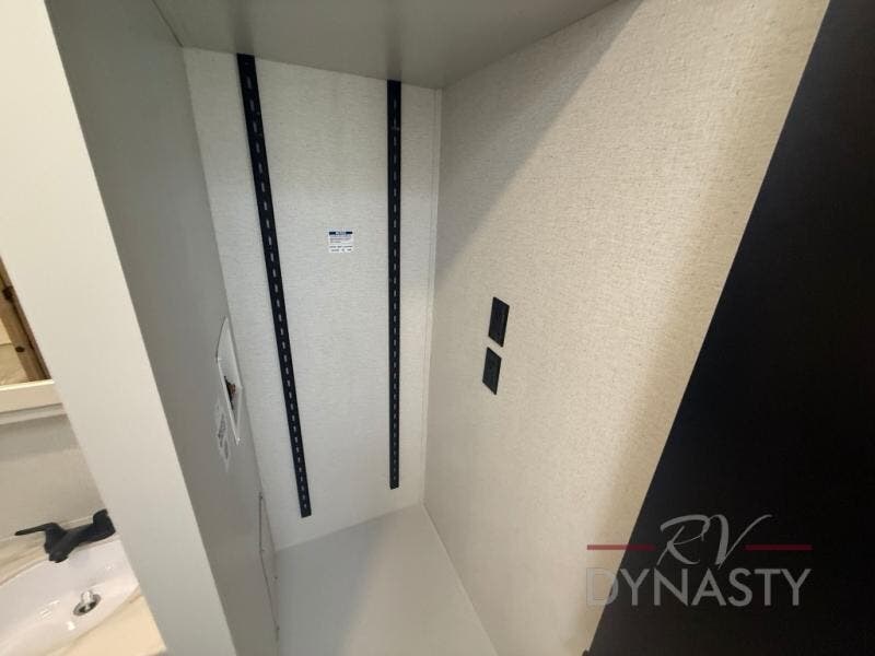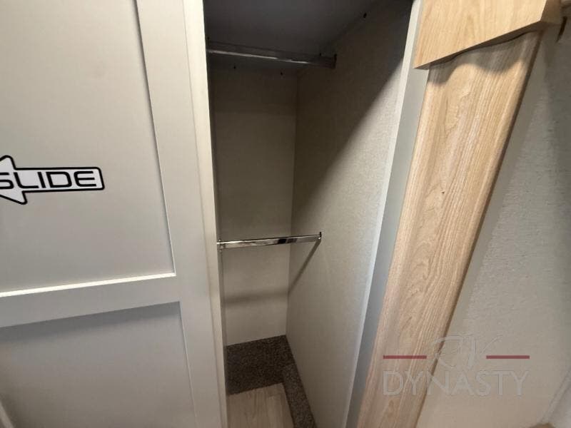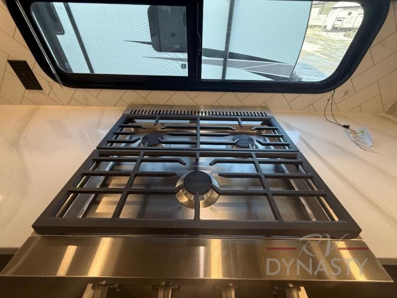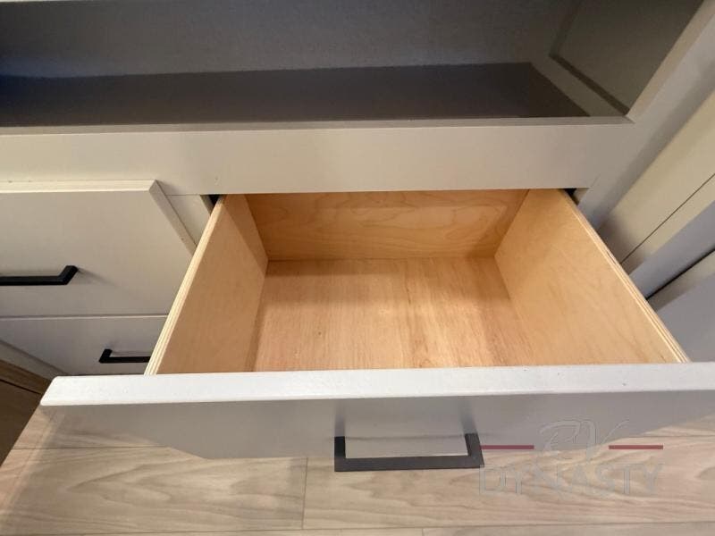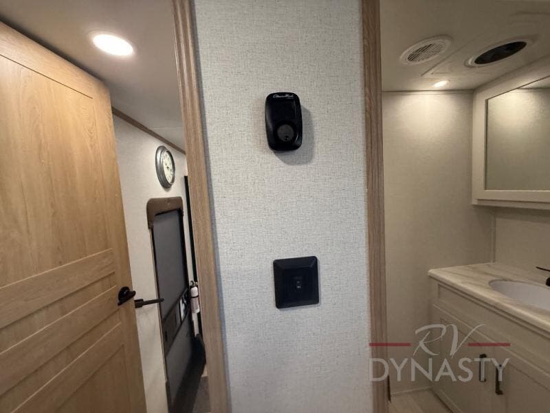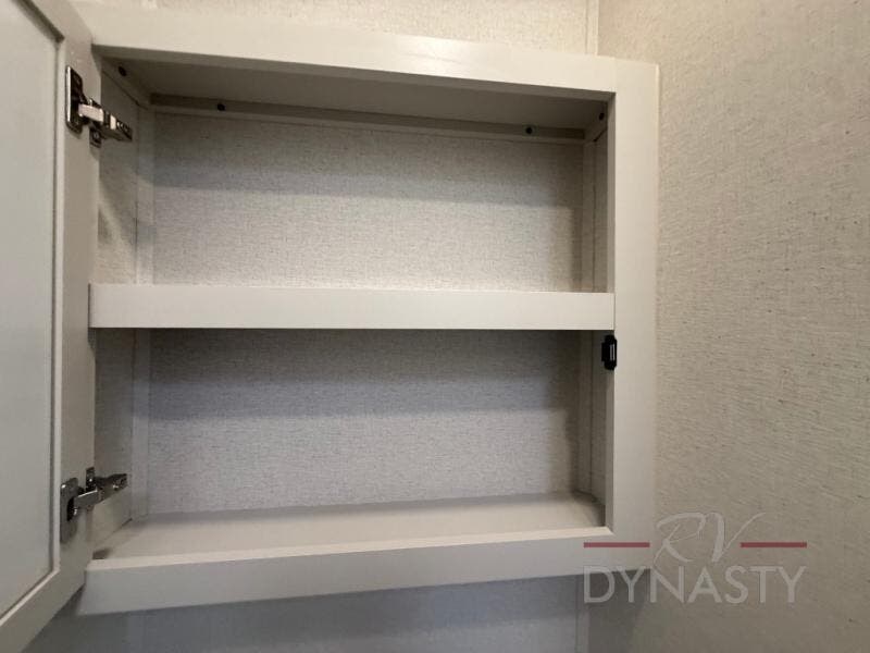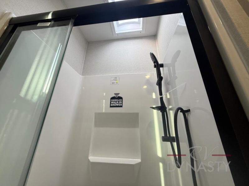 This fifth wheel is thoughtfully designed for comfort and convenience, starting with a spacious front bunkhouse perfect for accommodating guests. It features two flip-up bunks, 28" x 74" and 32" x 74" and a 60" x 74" fold-out lounge, along with a wardrobe, dresser, and additional storage to keep essentials organized. A nearby half bath adds easy access and extra convenience. At the center of the unit, the kitchen offers everything you need to prepare meals, including a stainless-steel sink, three-burner cooktop, and a generous 16 cu. ft. refrigerator. Meals can be enjoyed at the free-standing dinette, or you can unwind on the sectional sofa while enjoying the fireplace or entertainment center. At the rear, you'll find the private main bedroom with a roomy 66" x 80" RV king bed, plus its own wardrobe and dresser. Just steps away is the full bathroom featuring a one-piece fiberglass shower, sink with medicine cabinet, linen storage, and even washer/dryer prep for extended stays.