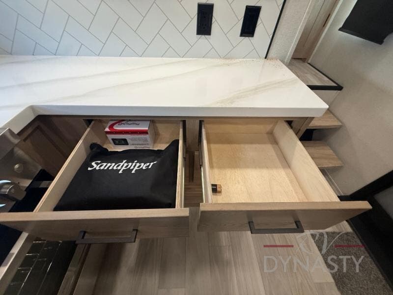 You will find the perfect balance of size, space, features, and luxury with any one of these Forest River Sandpiper fifth wheels! They have a cambered powder coated frame with rust prohibitor, and a fully enclosed underbelly for added protection against the elements. Also, the power front jacks with spring-loaded pins enhance the convenience, speed, and safety. The large, tinted windows come with a 80/20 UV prohibitors. Some hassle-free amenities include a 60k BTU on-demand water heater, porcelain foot flush toilet(s), tire pressure monitor system, and an electric leveling system! Inside, you'll enjoy stainless steel kitchen package, solid surface kitchen countertops, Beachside Sundance Congoleum linoleum, recessed residential lighting, and many more comforts!