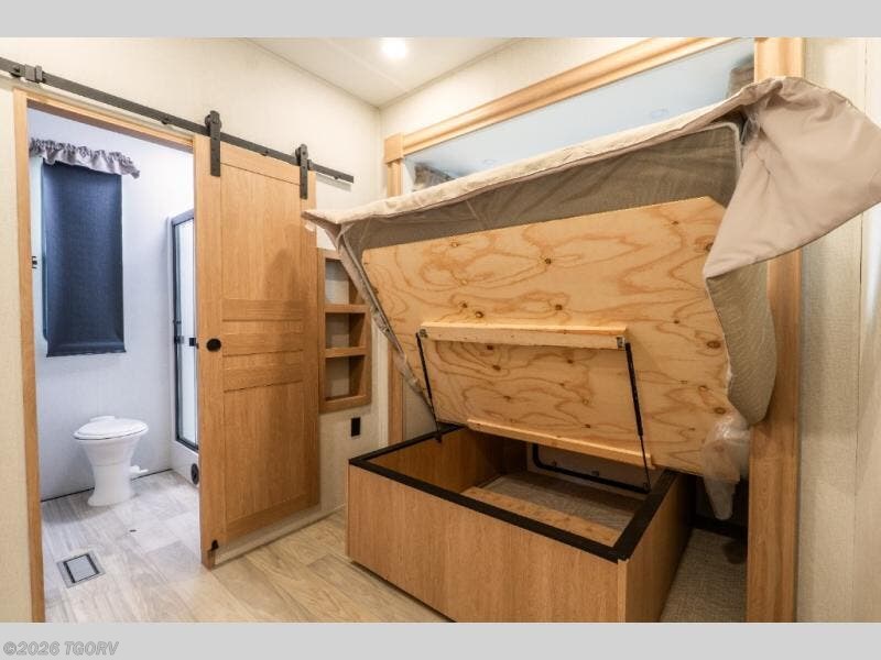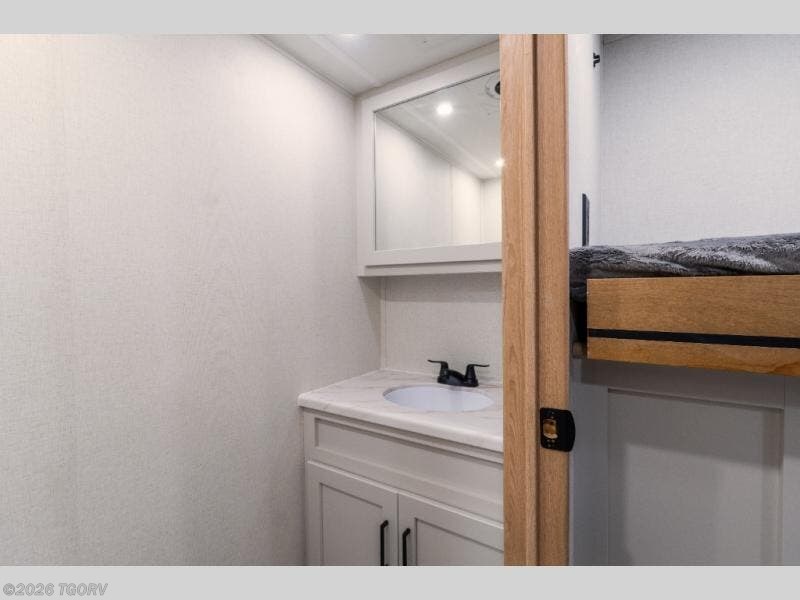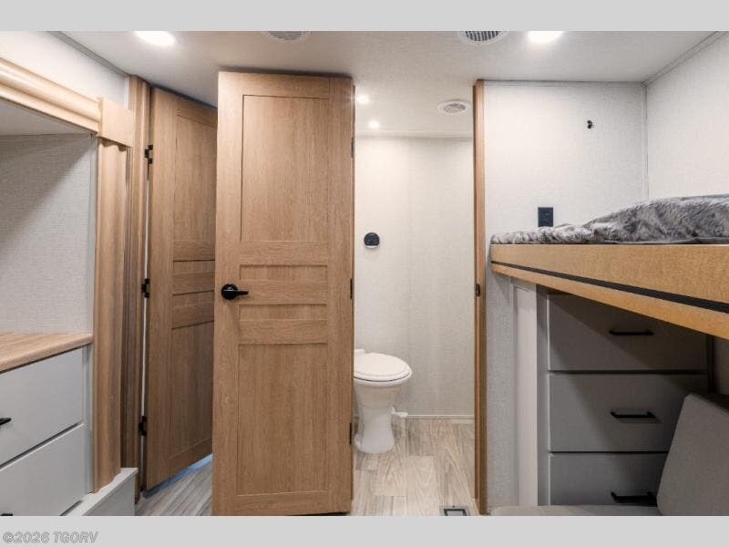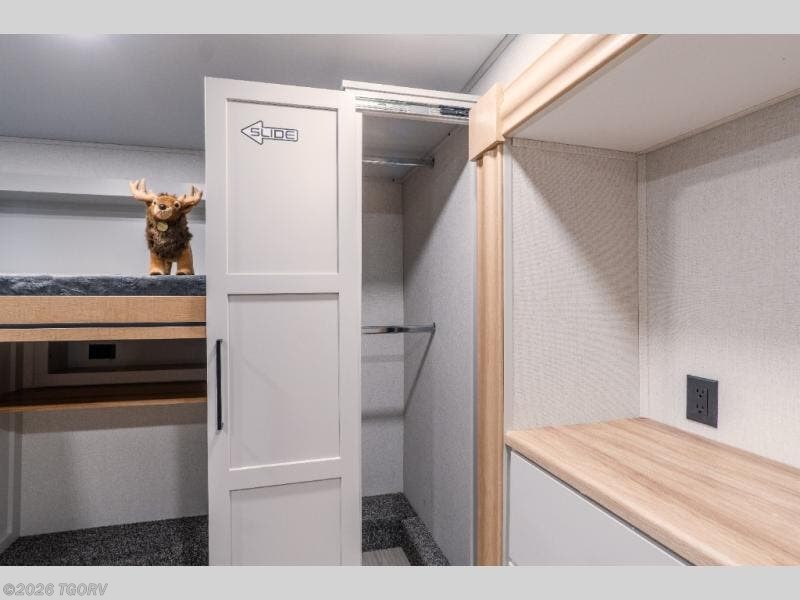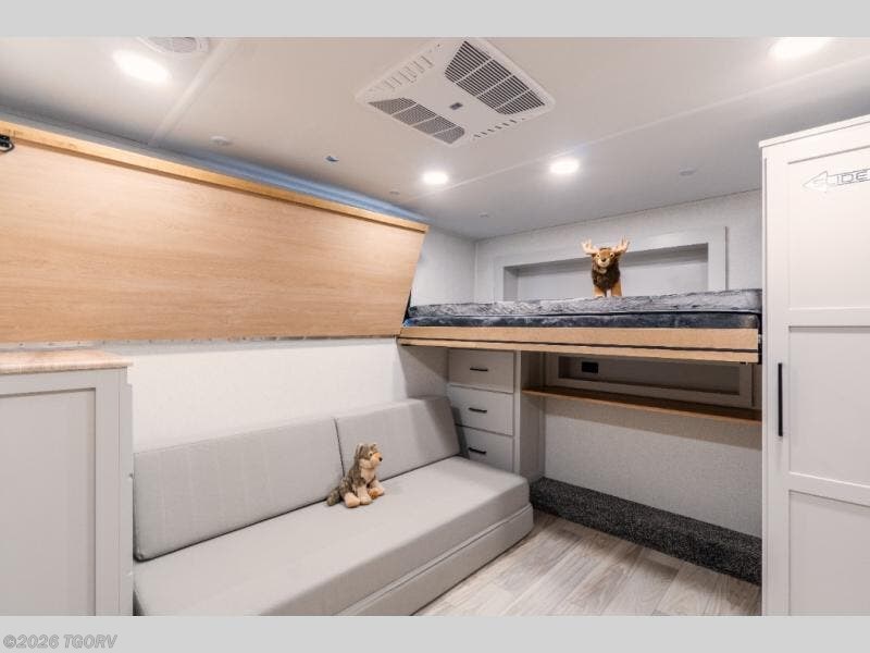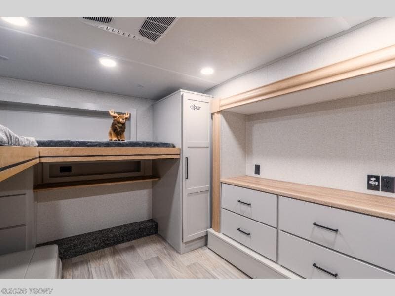 The spacious front bunkhouse is perfect for guests or kids, featuring two flip-up bunks (28" x 74" and 32" x 74"), a 60" x 74" fold-out lounge, wardrobe, dresser, and additional storage to keep everything organized. A nearby half bath adds convenience and easy access for those staying in this private space.