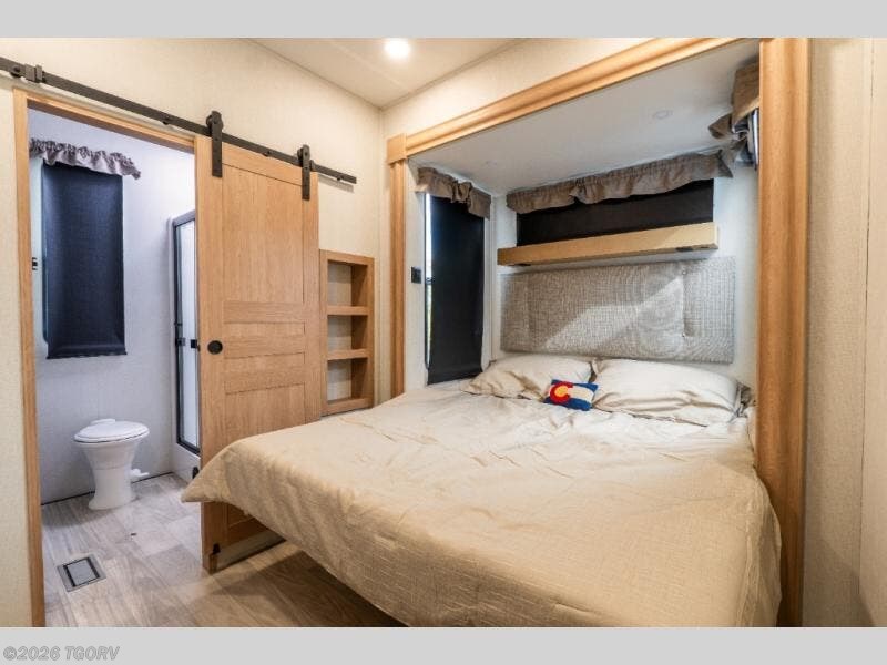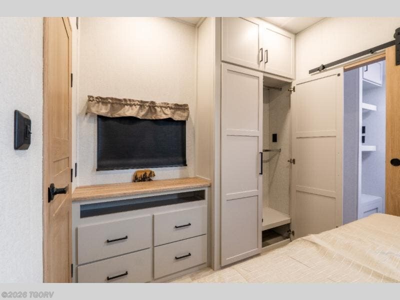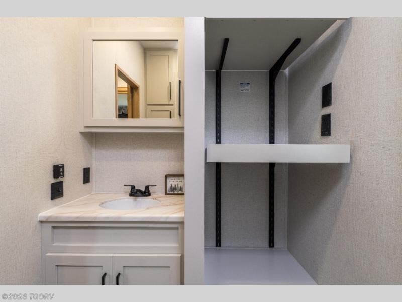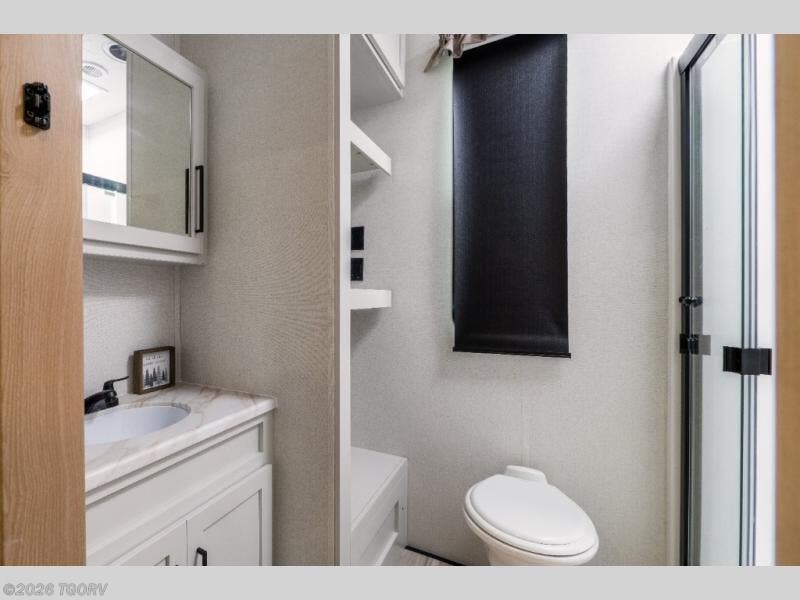 At the rear, the private main bedroom offers a roomy 66" x 80" RV king bed, along with its own wardrobe and dresser for added storage. Just steps away, the rear bathroom features a one-piece fiberglass shower, sink with medicine cabinet, linen storage, and washer/dryer prep — making this layout ideal for longer stays. The convenient bath and a half design ensures everyone has access to bathroom space when needed.