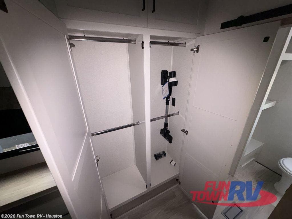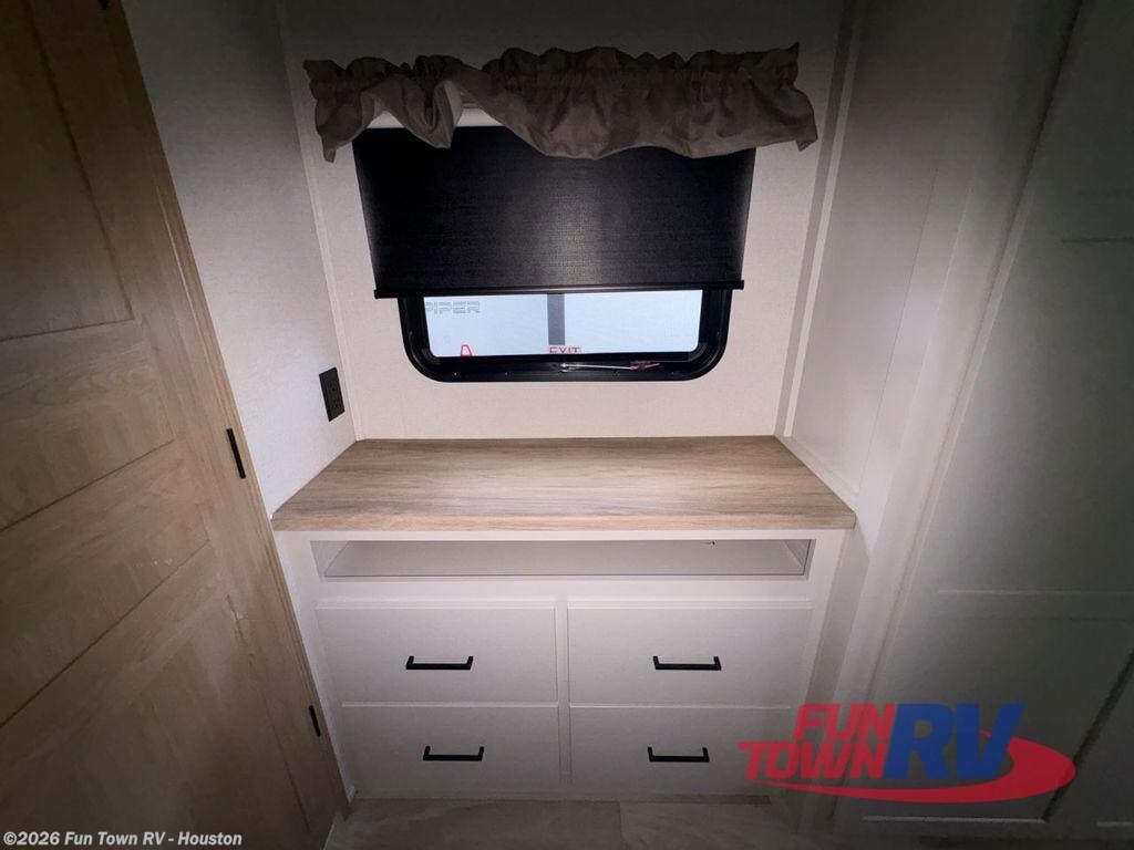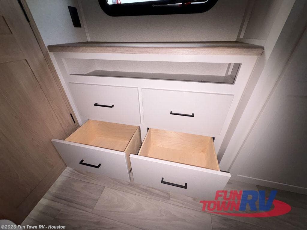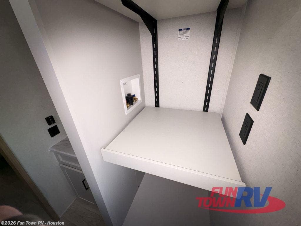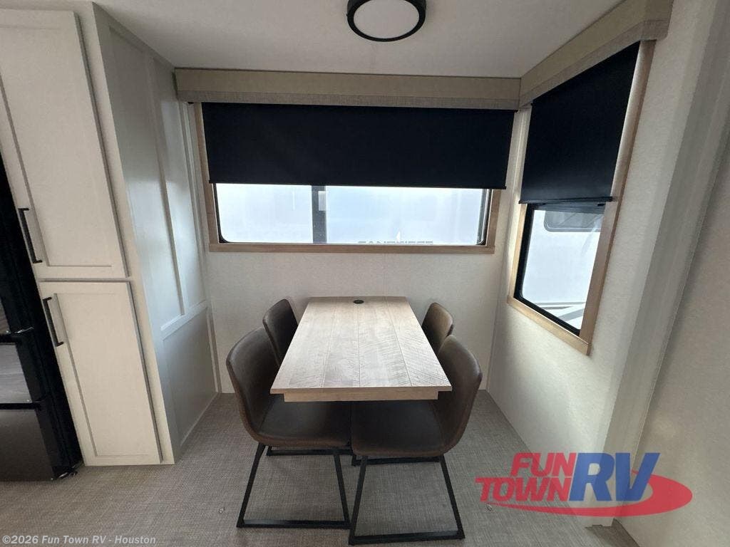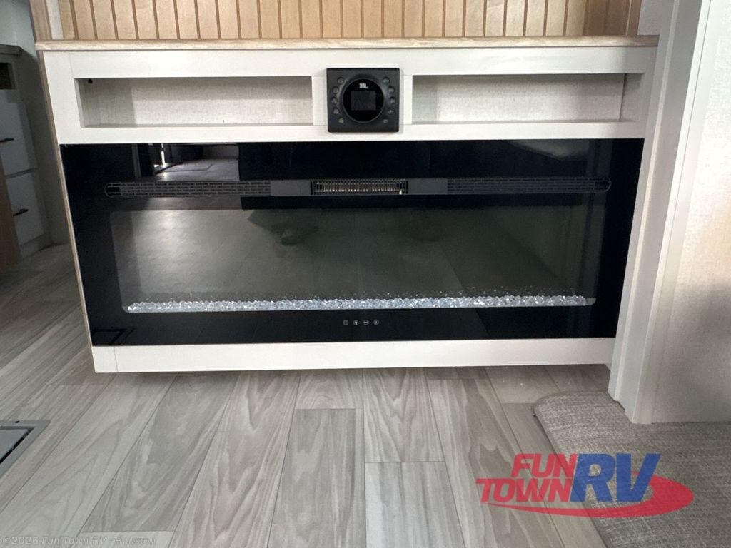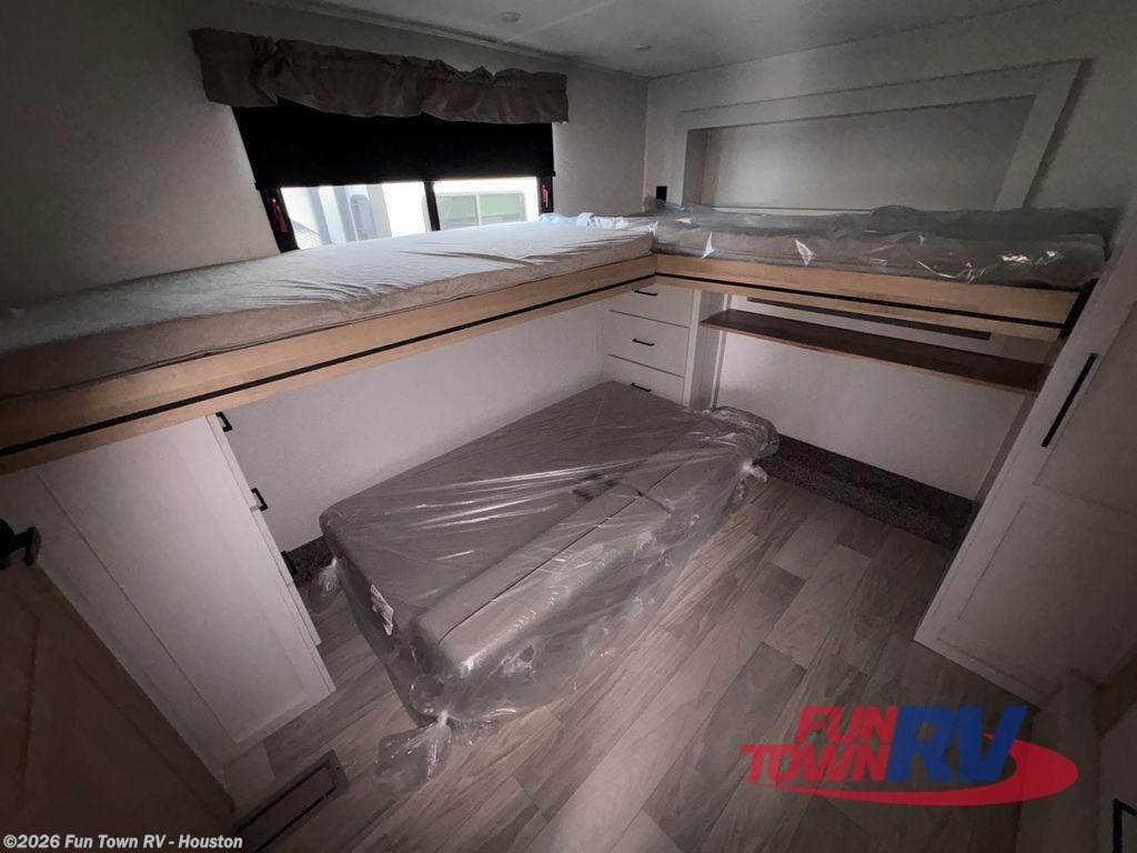 This fifth wheel is thoughtfully designed for comfort and convenience, starting with a spacious front bunkhouse perfect for accommodating guests. It features two flip-up bunks, 28" x 74" and 32" x 74" and a 60" x 74" fold-out lounge, along with a wardrobe, dresser, and additional storage to keep essentials organized. A nearby half bath adds easy access and extra convenience. At the center of the unit, the kitchen offers everything you need to prepare meals, including a stainless-steel sink, three-burner cooktop, and a generous 16 cu. ft. refrigerator. Meals can be enjoyed at the free-standing dinette, or you can unwind on the sectional sofa while enjoying the fireplace or entertainment center. At the rear, you'll find the private main bedroom with a roomy 66" x 80" RV king bed, plus its own wardrobe and dresser. Just steps away is the full bathroom featuring a one-piece fiberglass shower, sink with medicine cabinet, linen storage, and even washer/dryer prep for extended stays.