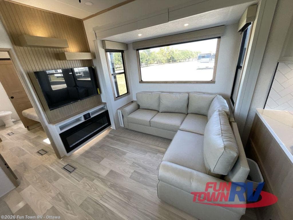 This fifth wheel is thoughtfully designed for comfort and convenience, starting with a spacious front bunkhouse perfect for accommodating guests. It features two flip-up bunks, 28" x 74" and 32" x 74" and a 60" x 74" fold-out lounge, along with a wardrobe, dresser, and additional storage to keep essentials organized. A nearby half bath adds easy access and extra convenience. At the center of the unit, the kitchen offers everything you need to prepare meals, including a stainless-steel sink, three-burner cooktop, and a generous 16 cu. ft. refrigerator. Meals can be enjoyed at the free-standing dinette, or you can unwind on the sectional sofa while enjoying the fireplace or entertainment center. At the rear, you'll find the private main bedroom with a roomy 66" x 80" RV king bed, plus its own wardrobe and dresser. Just steps away is the full bathroom featuring a one-piece fiberglass shower, sink with medicine cabinet, linen storage, and even washer/dryer prep for extended stays.