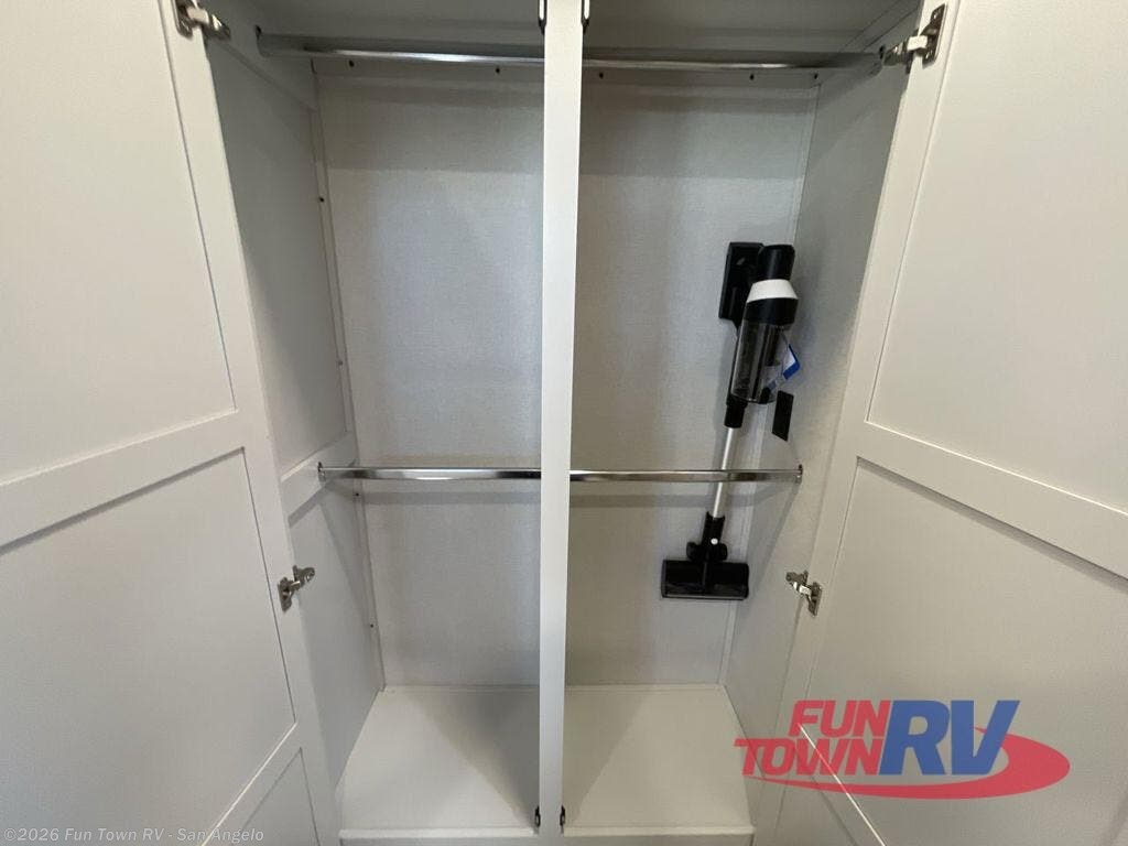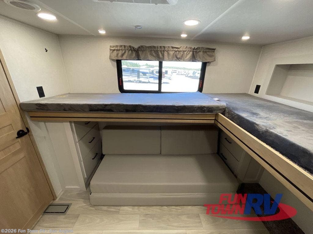 This fifth wheel is thoughtfully designed for comfort and convenience, starting with a spacious front bunkhouse perfect for accommodating guests. It features two flip-up bunks, 28" x 74" and 32" x 74" and a 60" x 74" fold-out lounge, along with a wardrobe, dresser, and additional storage to keep essentials organized. A nearby half bath adds easy access and extra convenience. At the center of the unit, the kitchen offers everything you need to prepare meals, including a stainless-steel sink, three-burner cooktop, and a generous 16 cu. ft. refrigerator. Meals can be enjoyed at the free-standing dinette, or you can unwind on the sectional sofa while enjoying the fireplace or entertainment center. At the rear, you'll find the private main bedroom with a roomy 66" x 80" RV king bed, plus its own wardrobe and dresser. Just steps away is the full bathroom featuring a one-piece fiberglass shower, sink with medicine cabinet, linen storage, and even washer/dryer prep for extended stays.