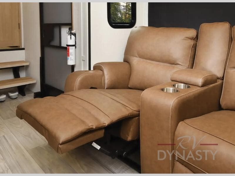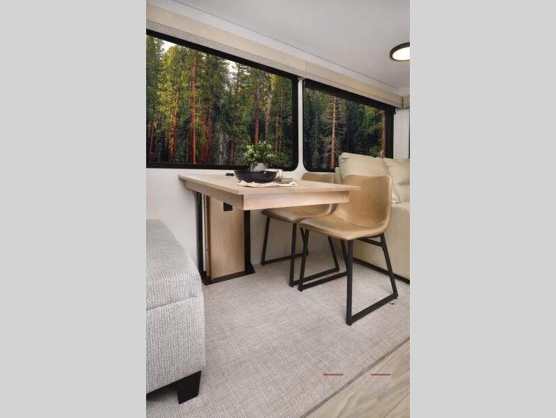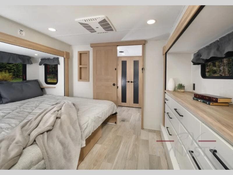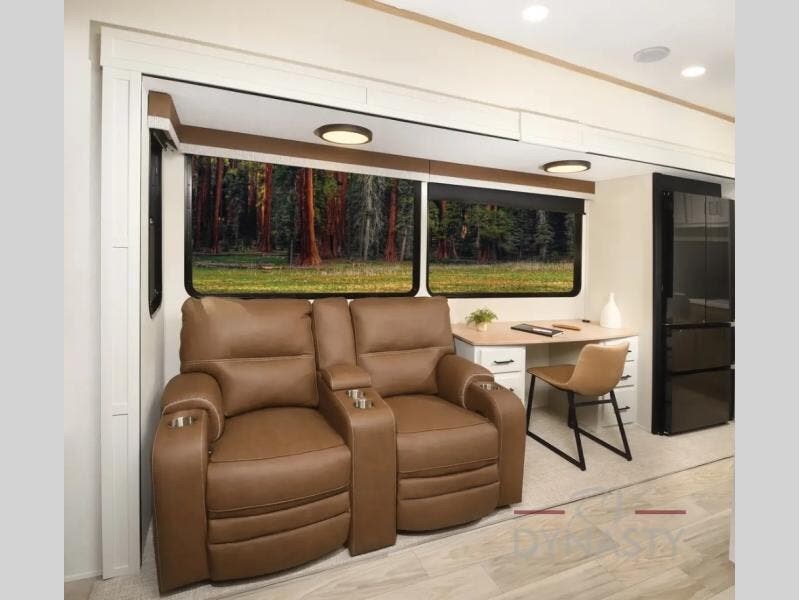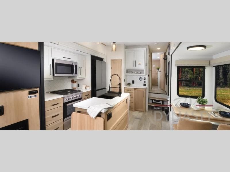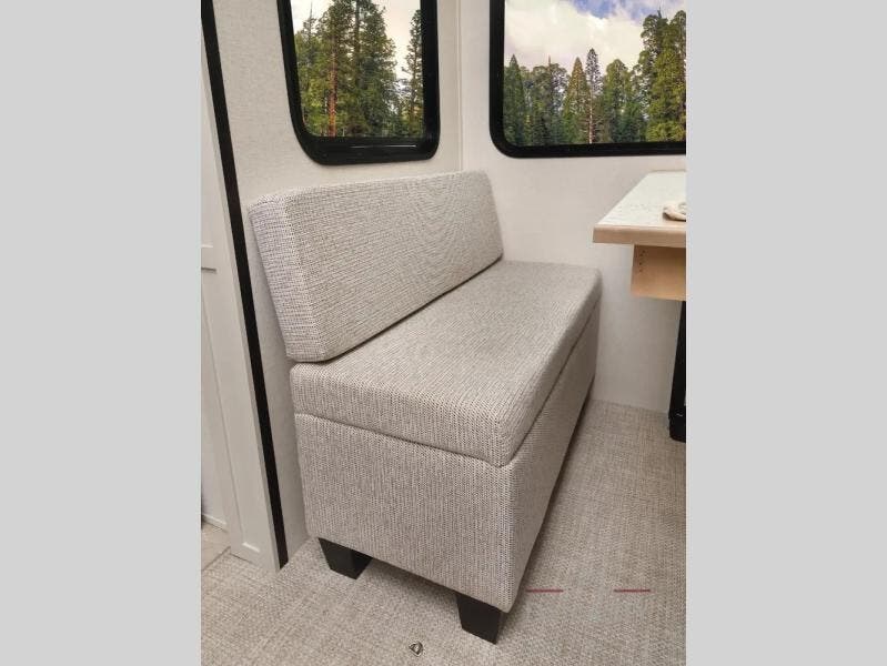 If you're looking to go full-time RVing, this fifth wheel is packed with convenient features! The master bedroom includes a king bed slide out with USB ports on either side of the bed so you both can charge your phones, and there is a dresser for your folded clothes. You will love the front bathroom with dual bath sinks, a shower with a seat, plus a walk-in closet with shelves, rods to hand clothes, and baskets for laundry! There is a unique middle utility room with washer and dryer prep and a rod to hang clothes that will make a perfect laundry room, or you can utilize this space for storage! Head to the main living area to relax on the theater seating or hide-a-bed sofa, and if you have guests stay over, they can sleep here. There is also an entertainment center with a 50" flat screen TV, but you might just leave that off if you're working at the desk with a chair that is provided. We've saved the best part for last; the kitchen! Here, you'll find ample counter space to prep home-cooked meals, a three burner high output range with a 22" oven, plus a large counter with barstools where you can enjoy breakfast at each morning. Choosing this fifth wheel is a no-brainer!