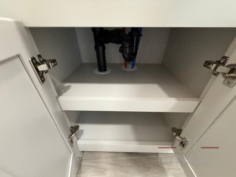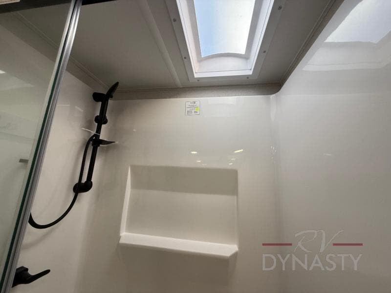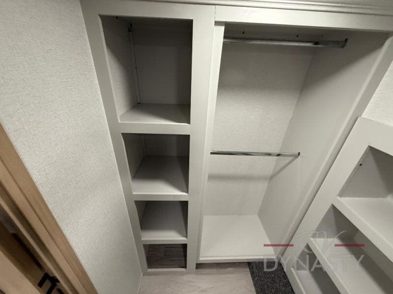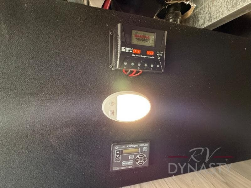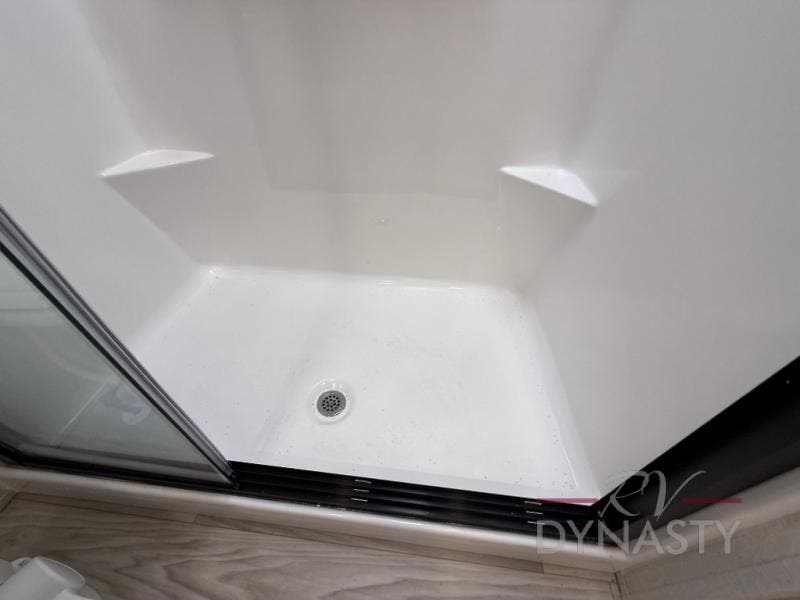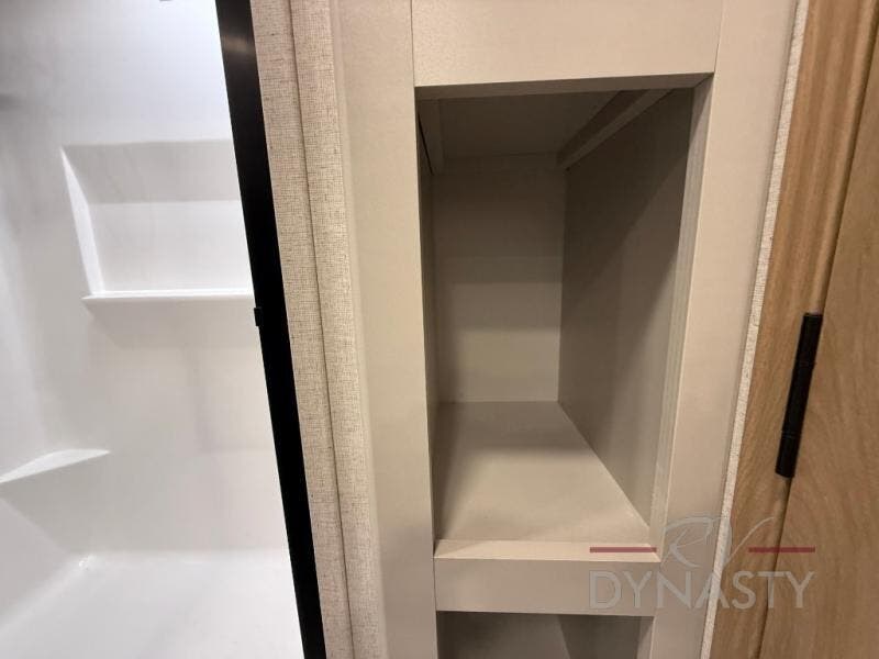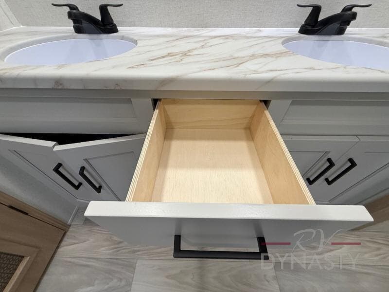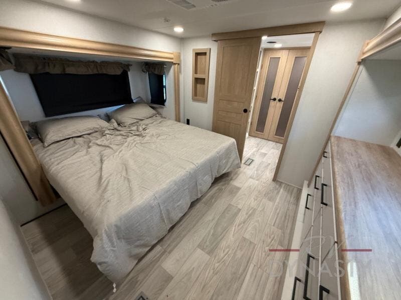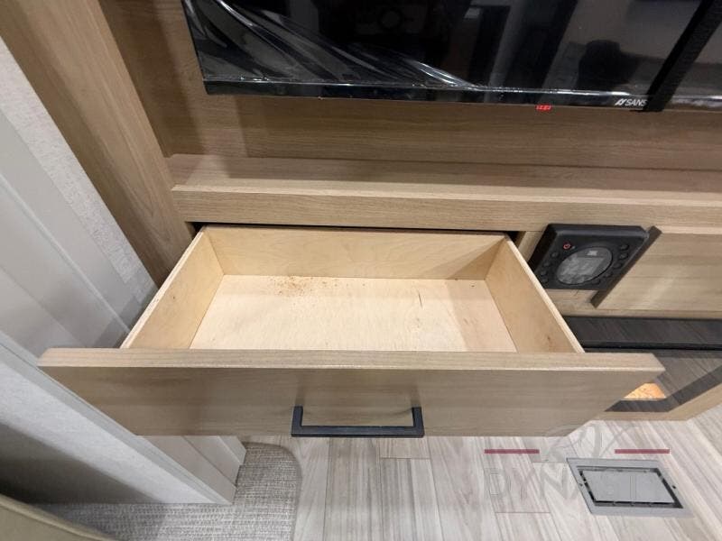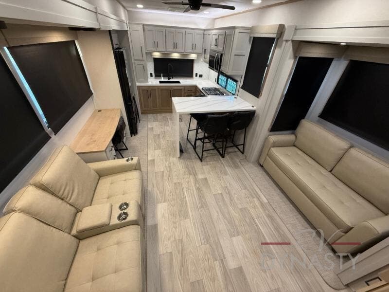 This fifth wheel is packed with convenient features to make your travels more comfortable and enjoyable! The master bedroom includes a king bed slide out with USB ports on either side of the bed so you both can charge your phones, and there is a dresser for your folded clothes. You will love the front bathroom with dual bath sinks, a fiberglass one-piece shower, plus a walk-in closet with shelves and rods to hang clothes! There is a unique middle utility room with washer and dryer prep if you want to add these, a Washer and dryer counter and a rod to hang clothes that will make a perfect laundry room, or you can utilize this space for storage! Head to the main living area to relax on the theater seating or hide-a-bed sofa, and if you have guests stay over, they can sleep here. There is also an entertainment center with a 50" flat screen TV, but you might just leave that off if you're working at the desk with a chair that is provided. We've saved the best part for last, the kitchen! Here, you'll find ample counter space to prep home-cooked meals, a three-burner range with a 24" oven, plus a large counter with barstools where you can enjoy breakfast at each morning. Choosing this fifth wheel is a no-brainer!