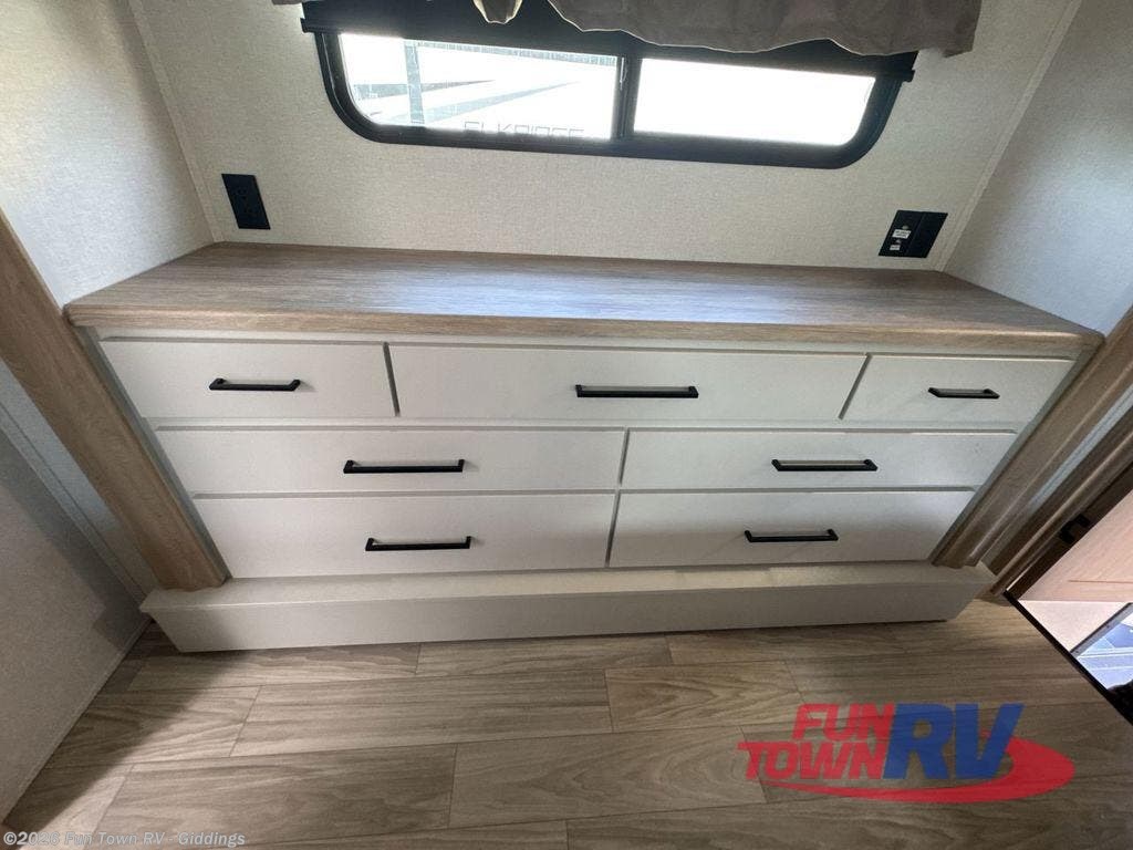 This fifth wheel is packed with convenient features to make your travels more comfortable and enjoyable! The master bedroom includes a king bed slide out with USB ports on either side of the bed so you both can charge your phones, and there is a dresser for your folded clothes. You will love the front bathroom with dual bath sinks, a fiberglass one-piece shower, plus a walk-in closet with shelves and rods to hang clothes! There is a unique middle utility room with washer and dryer prep if you want to add these, a Washer and dryer counter and a rod to hang clothes that will make a perfect laundry room, or you can utilize this space for storage! Head to the main living area to relax on the theater seating or hide-a-bed sofa, and if you have guests stay over, they can sleep here. There is also an entertainment center with a 50" flat screen TV, but you might just leave that off if you're working at the desk with a chair that is provided. We've saved the best part for last, the kitchen! Here, you'll find ample counter space to prep home-cooked meals, a three-burner range with a 24" oven, plus a large counter with barstools where you can enjoy breakfast at each morning. Choosing this fifth wheel is a no-brainer!