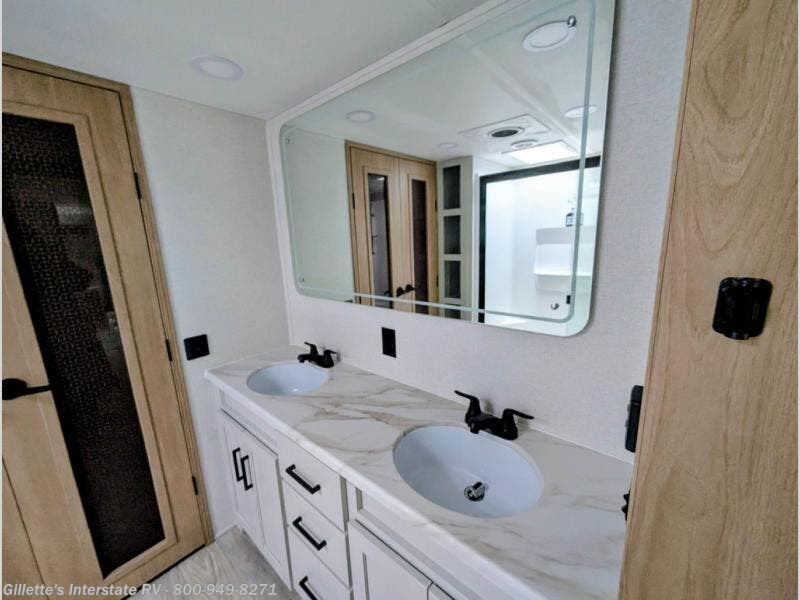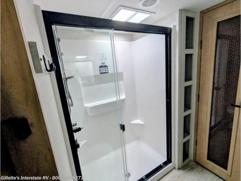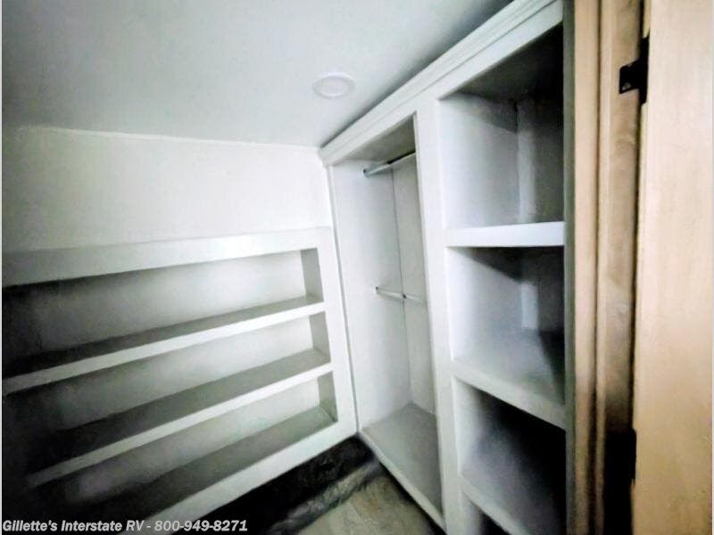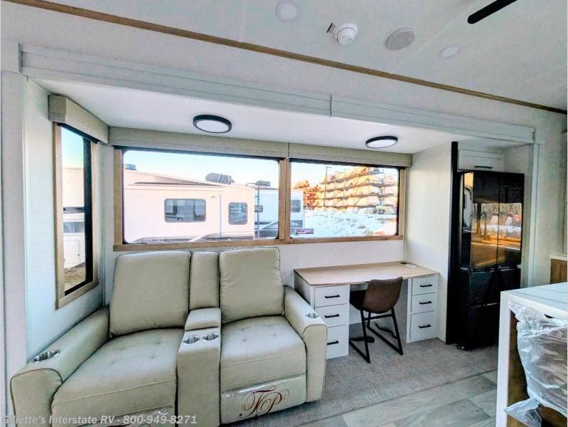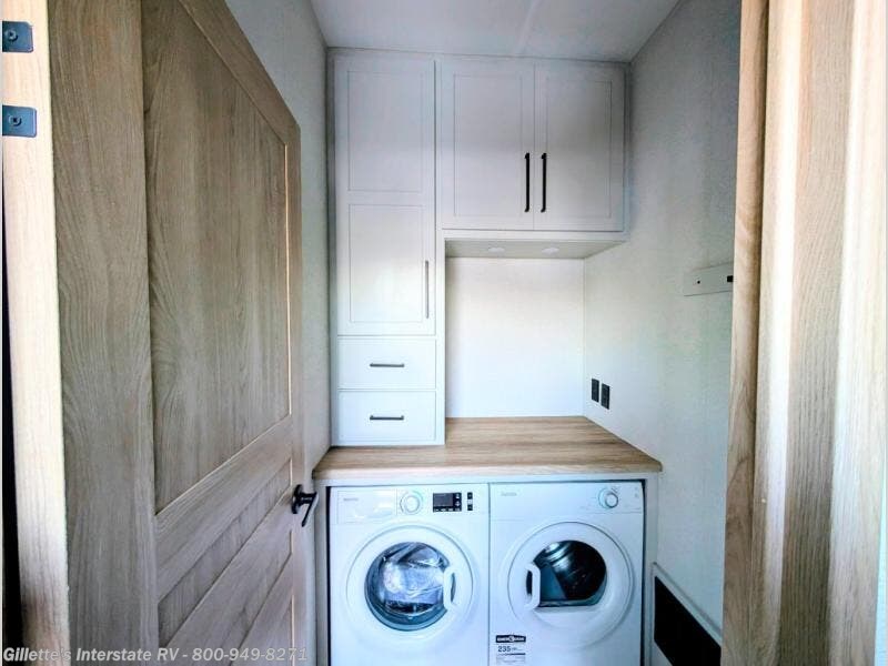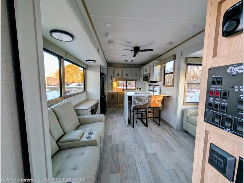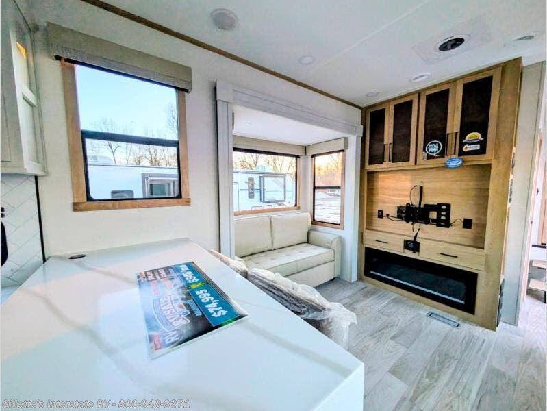 This fifth wheel is packed with convenient features to make your travels more comfortable and enjoyable! The master bedroom includes a king bed slide out with USB ports on either side of the bed so you both can charge your phones, and there is a dresser for your folded clothes. You will love the front bathroom with dual bath sinks, a fiberglass one-piece shower, plus a walk-in closet with shelves and rods to hang clothes! There is a unique middle utility room with washer and dryer prep if you want to add these, a Washer and dryer counter and a rod to hang clothes that will make a perfect laundry room, or you can utilize this space for storage! Head to the main living area to relax on the theater seating or hide-a-bed sofa, and if you have guests stay over, they can sleep here. There is also an entertainment center with a 50" flat screen TV, but you might just leave that off if you're working at the desk with a chair that is provided. We've saved the best part for last, the kitchen! Here, you'll find ample counter space to prep home-cooked meals, a three-burner range with a 24" oven, plus a large counter with barstools where you can enjoy breakfast at each morning. Choosing this fifth wheel is a no-brainer!