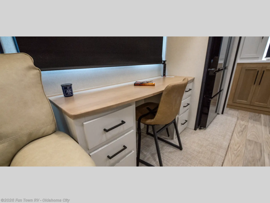 If you're looking to go full-time RVing, this fifth wheel is packed with convenient features! The master bedroom includes a king bed slide out with USB ports on either side of the bed so you both can charge your phones, and there is a dresser for your folded clothes. You will love the front bathroom with dual bath sinks, a shower with a seat, plus a walk-in closet with shelves! There is a unique middle utility room with washer and dryer prep and a counter that will make a perfect laundry room, or you can utilize this space for storage! Head to the main living area to relax on the theater seating or hide-a-bed sofa, and if you have guests stay over, they can sleep here. There is also an entertainment center with a 50" flat screen TV, but you might just leave that off if you're working at the desk with a chair that is provided. We've saved the best part for last; the kitchen! Here, you'll find ample counter space to prep home-cooked meals, a three burner range with a 24" oven, plus a large counter with barstools where you can enjoy breakfast at each morning. Choosing this fifth wheel is a no-brainer!