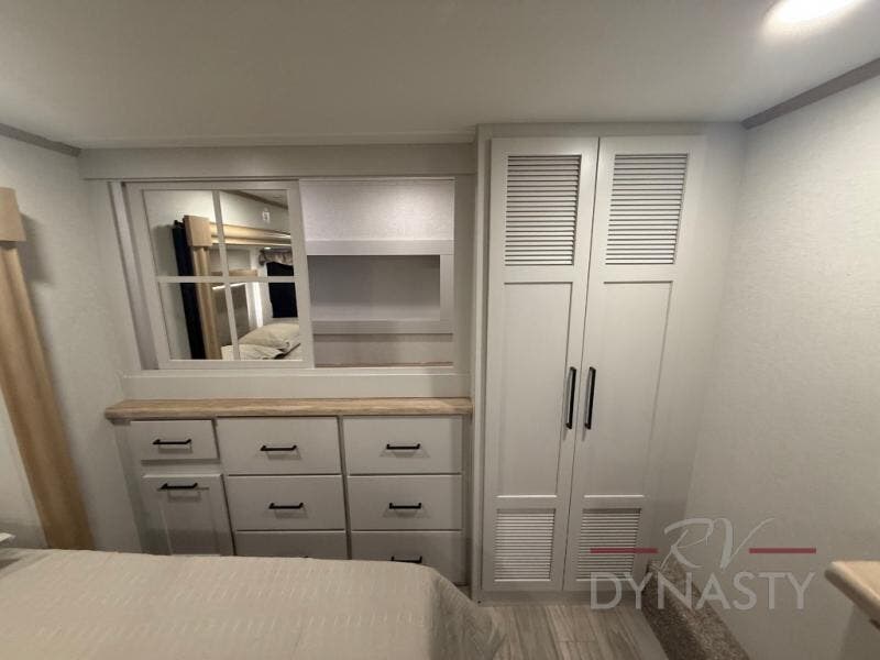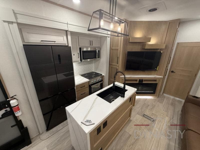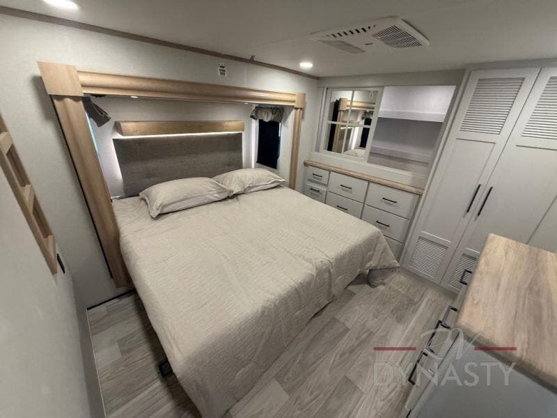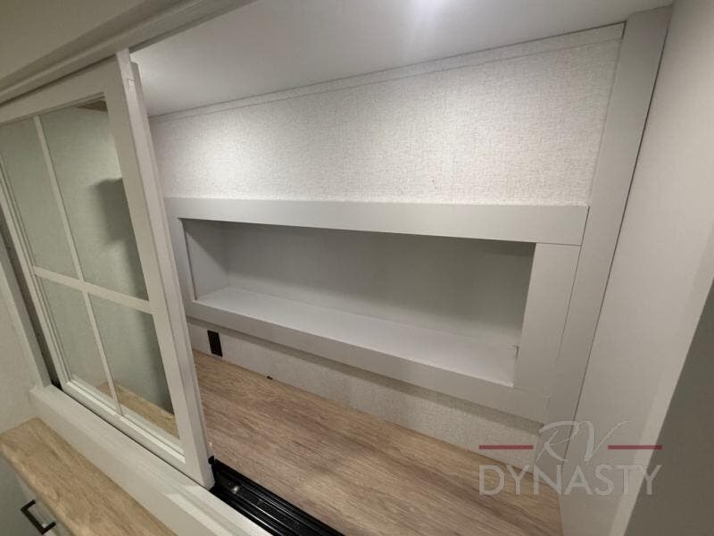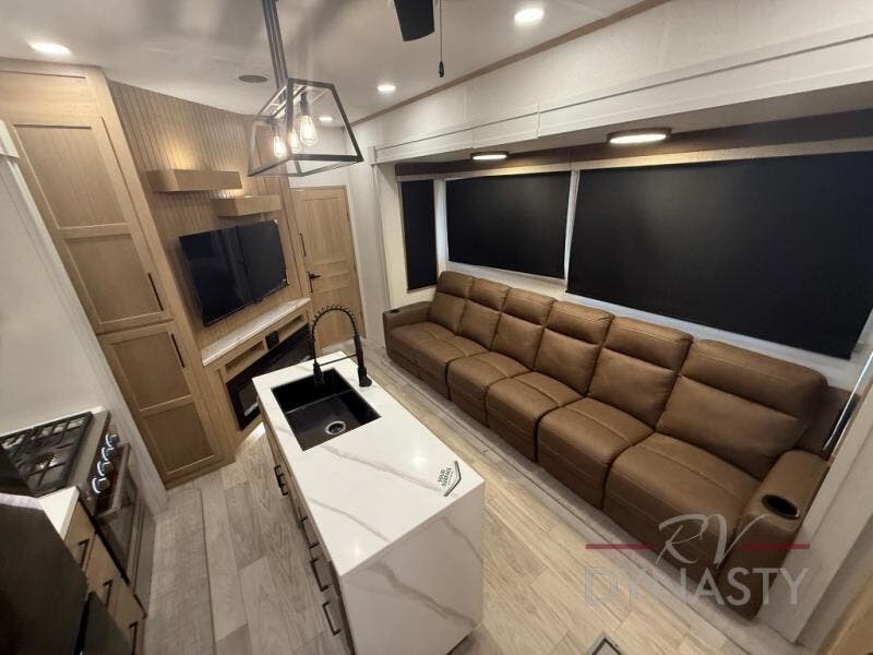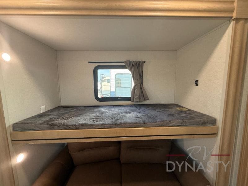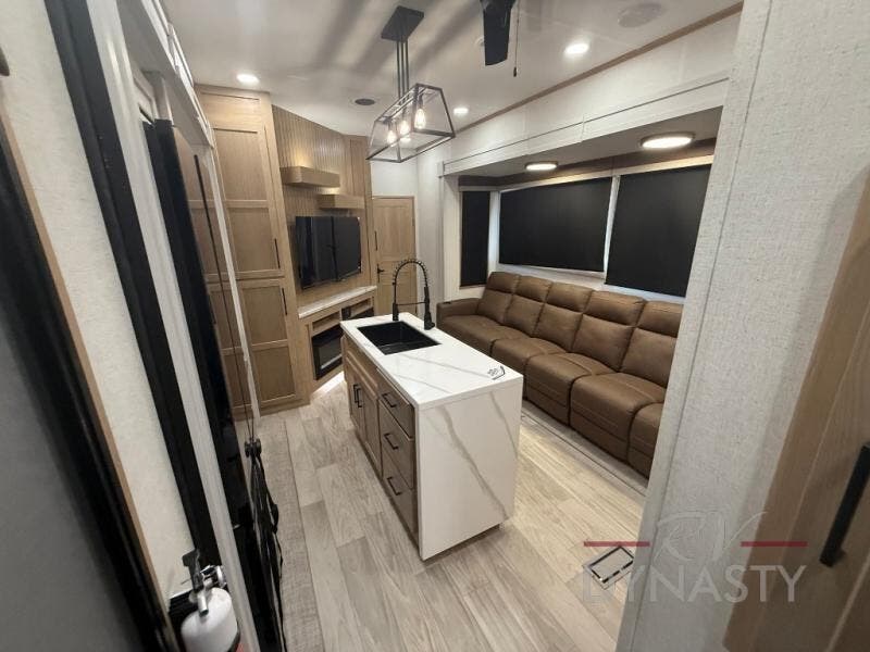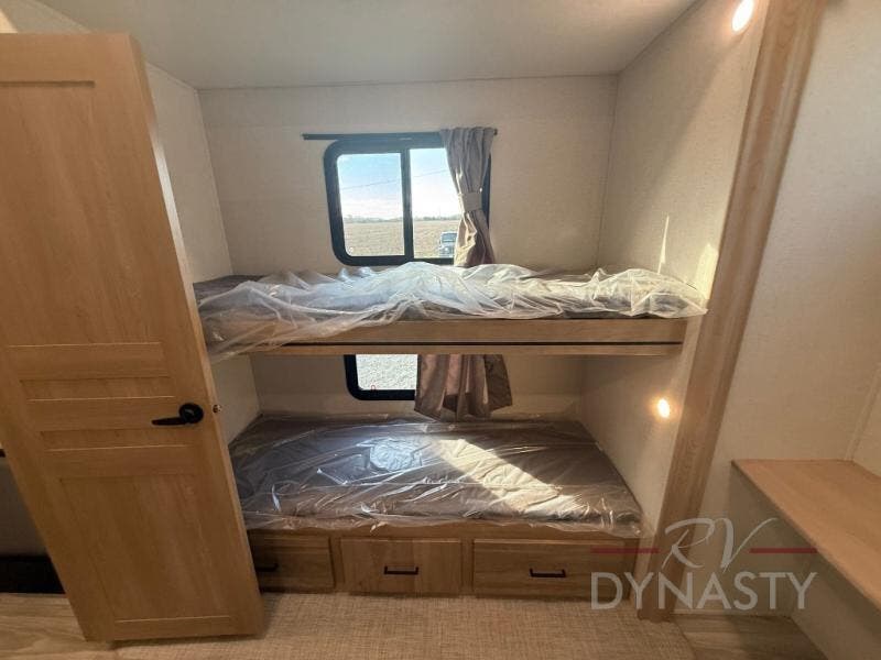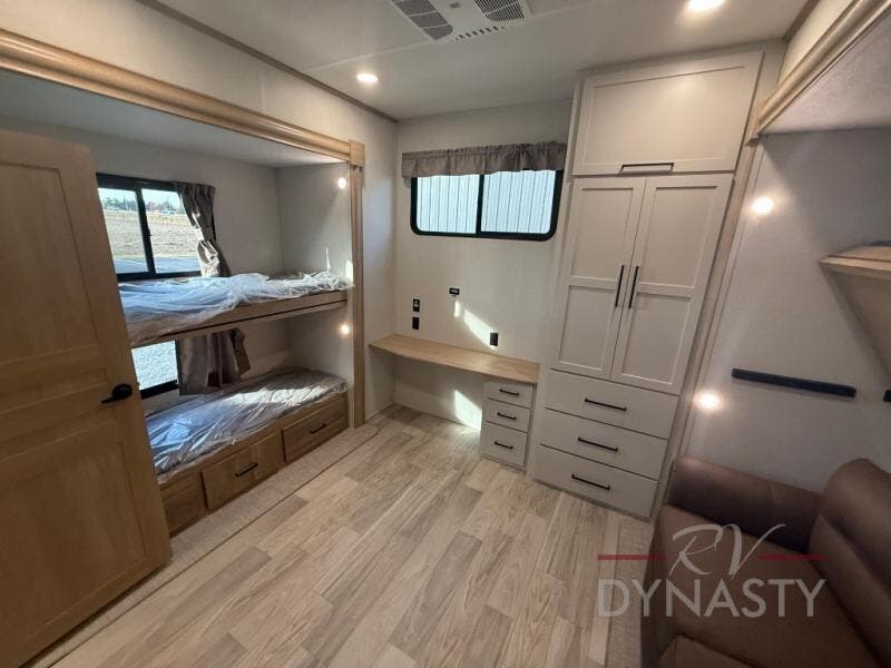 This spacious fifth wheel is designed for comfort and functionality from front to back. The front bedroom offers a king-size 72" x 80" bed, a dresser, and a wardrobe with shelves for all your storage needs. Adjacent to the bedroom is a full bathroom featuring a one-piece fiberglass shower, linen shelves, overhead cabinet, and a medicine cabinet. In the center, the main living area includes a large sofa in the expansive slide-out, perfect for relaxing or gathering, along with a kitchen island, a 3-burner range, a 16-cu. ft. refrigerator, and a butler pantry for added storage. At the rear, the bunkhouse provides generous sleeping space with two 32" x 74" bunks and a table on one side, a flip-up bunk and tri-fold sofa on the other, plus a built-in desk and wardrobe. This space also features its own half bath and a second entry door for added convenience.