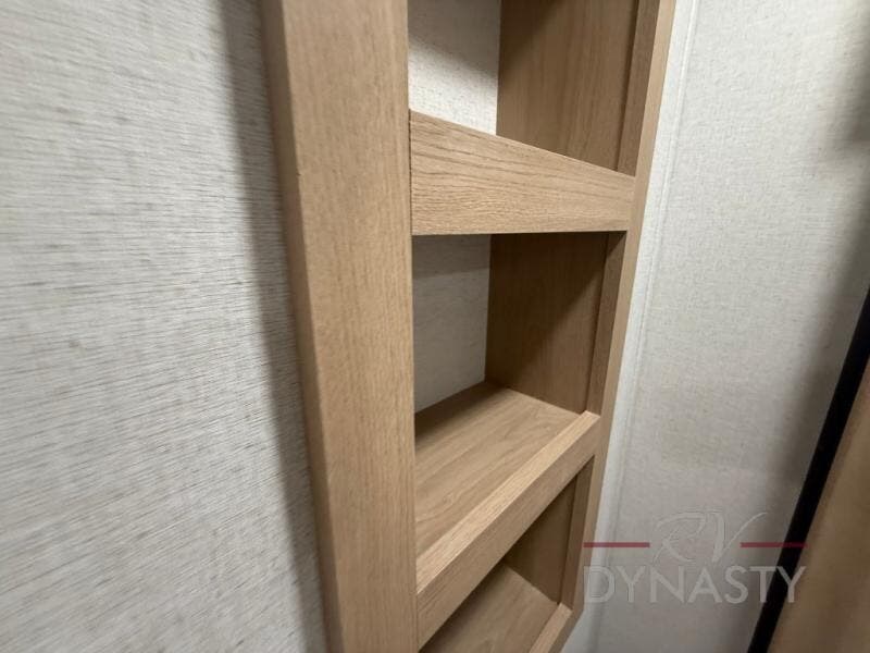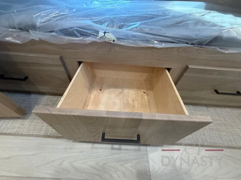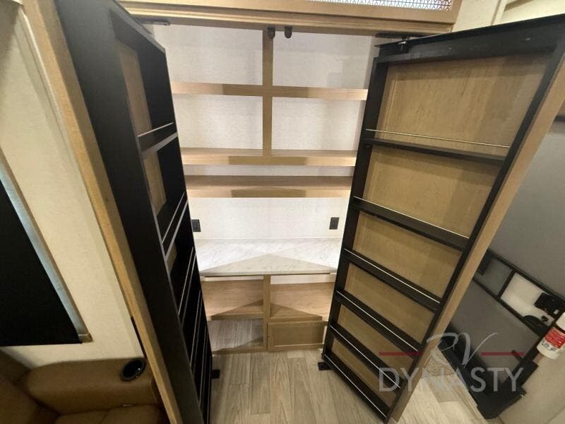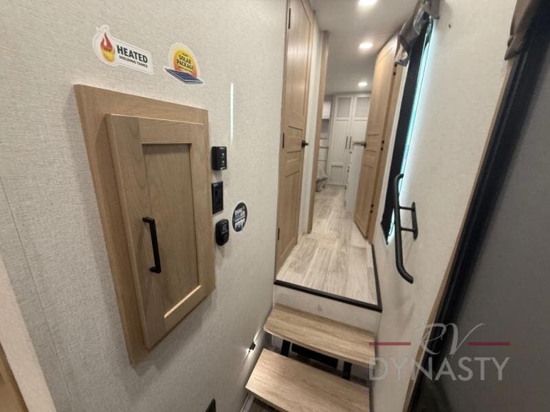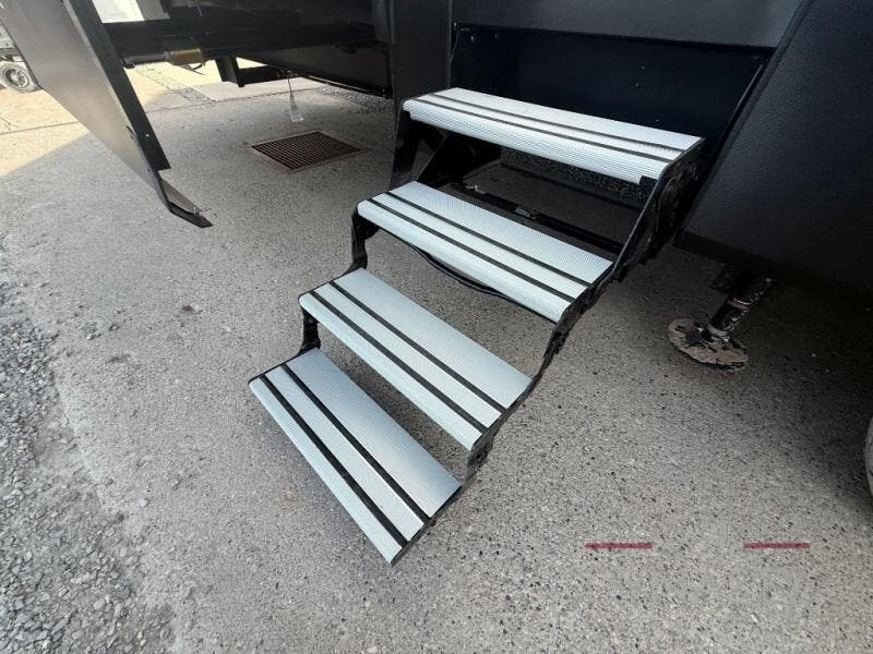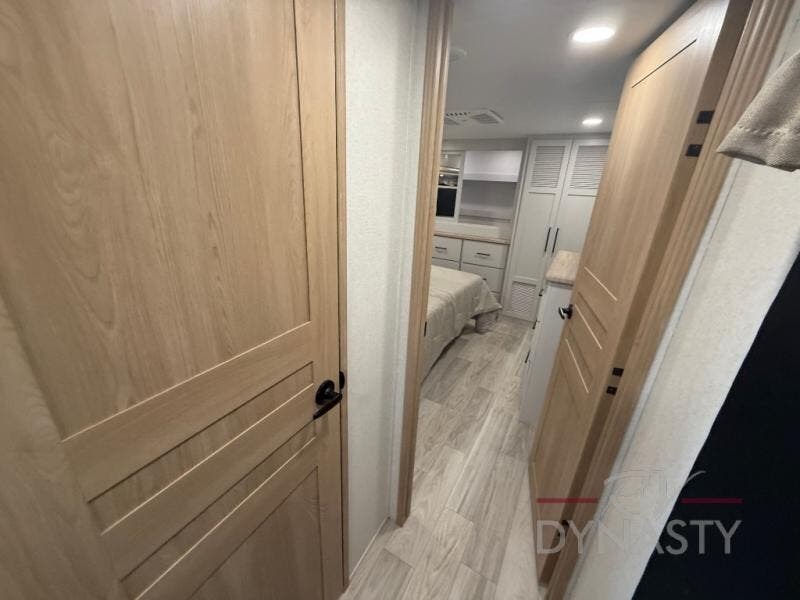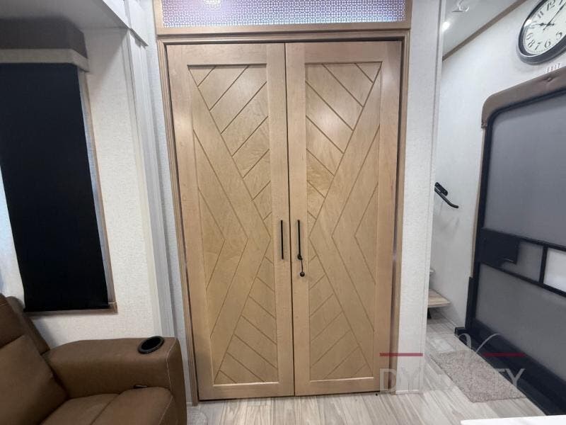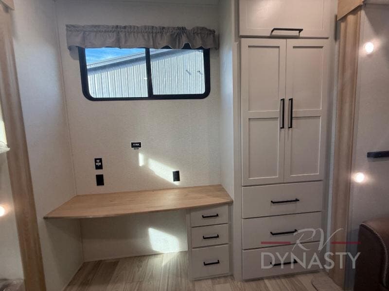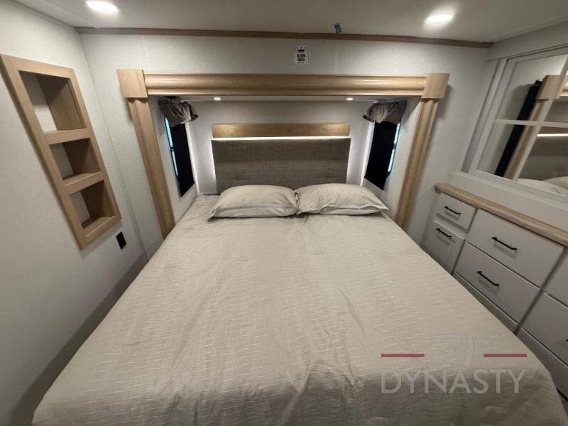 This spacious fifth wheel is designed for comfort and functionality from front to back. The front bedroom offers a king-size 72" x 80" bed, a dresser, and a wardrobe with shelves for all your storage needs. Adjacent to the bedroom is a full bathroom featuring a one-piece fiberglass shower, linen shelves, overhead cabinet, and a medicine cabinet. In the center, the main living area includes a large sofa in the expansive slide-out, perfect for relaxing or gathering, along with a kitchen island, a 3-burner range, a 16-cu. ft. refrigerator, and a butler pantry for added storage. At the rear, the bunkhouse provides generous sleeping space with two 32" x 74" bunks and a table on one side, a flip-up bunk and tri-fold sofa on the other, plus a built-in desk and wardrobe. This space also features its own half bath and a second entry door for added convenience.