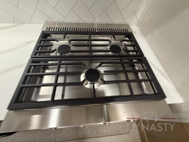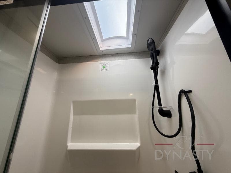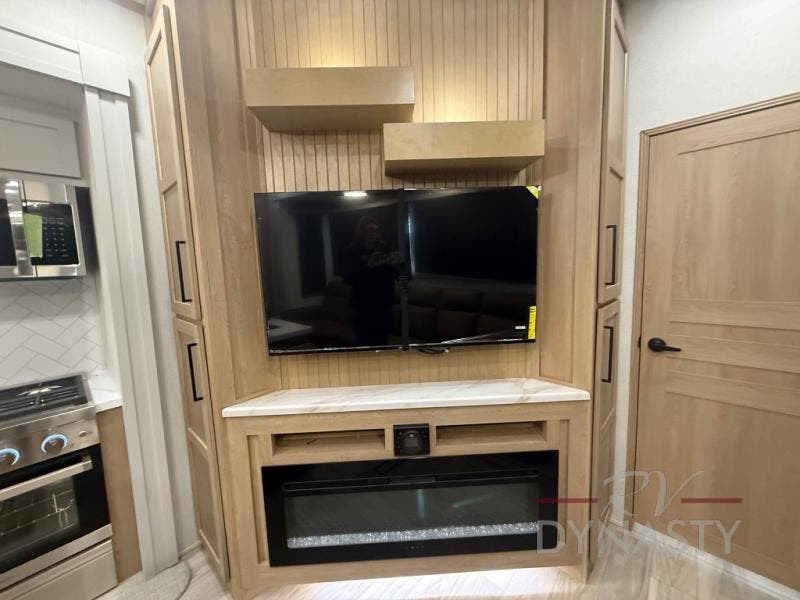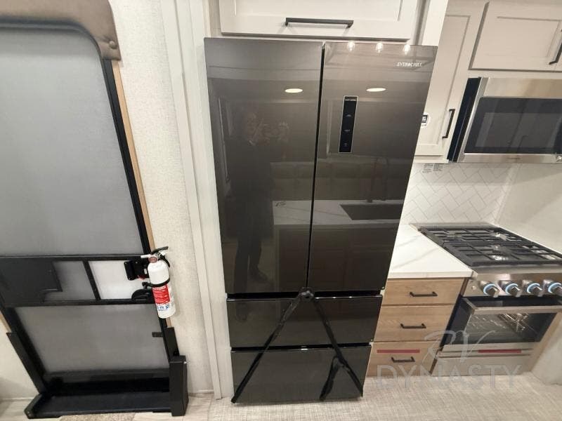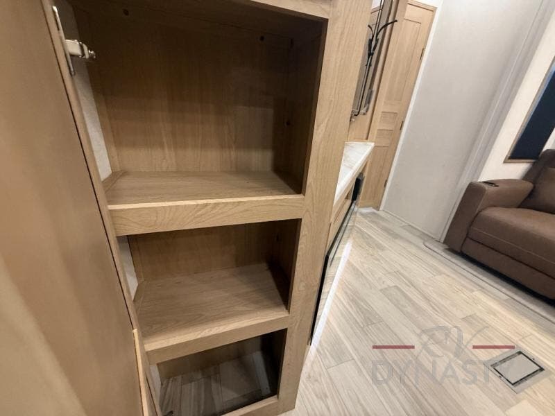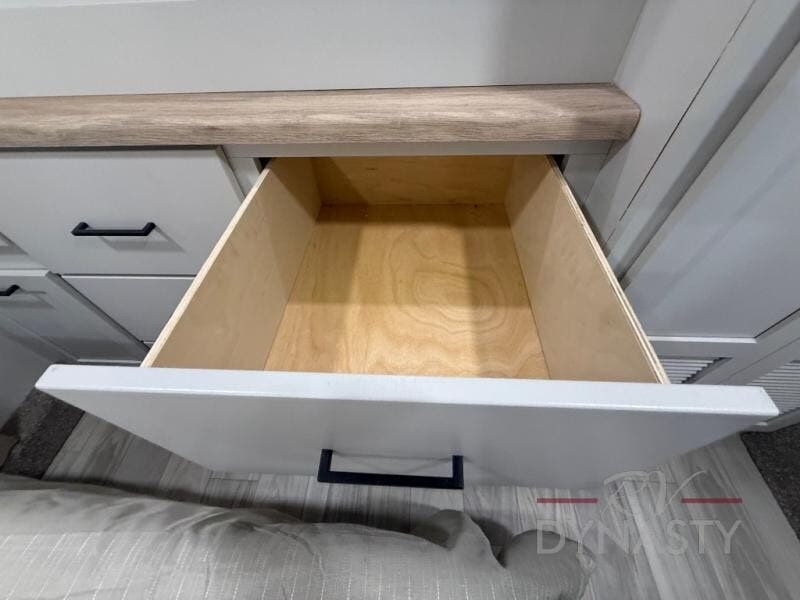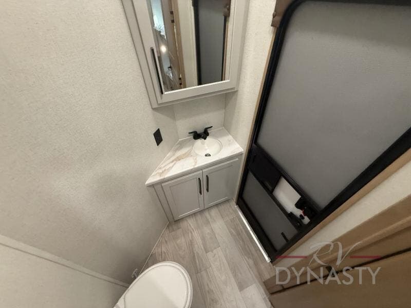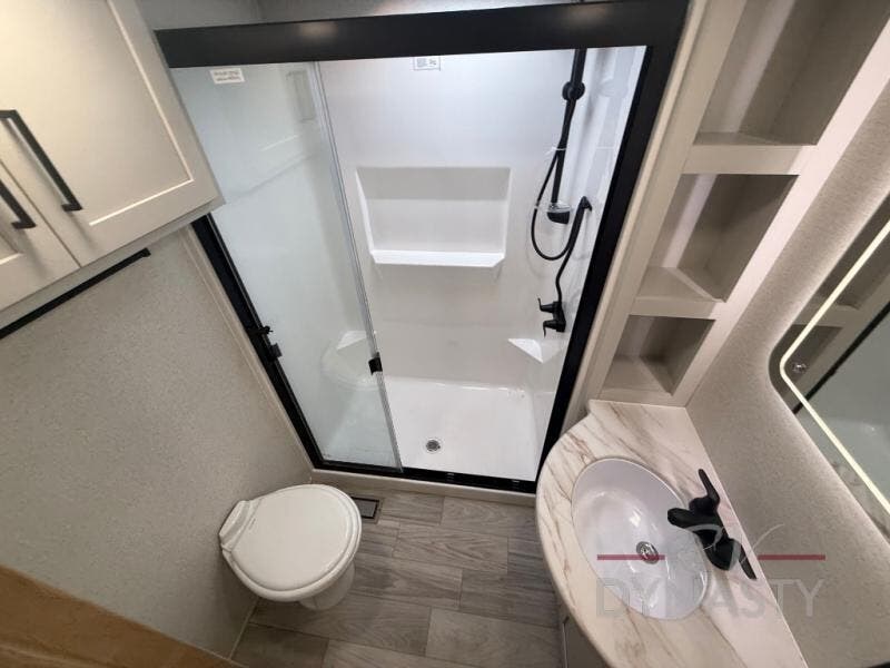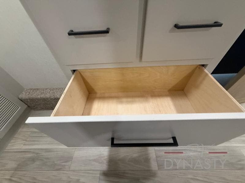 This spacious fifth wheel is designed for comfort and functionality from front to back. The front bedroom offers a king-size 72" x 80" bed, a dresser, and a wardrobe with shelves for all your storage needs. Adjacent to the bedroom is a full bathroom featuring a one-piece fiberglass shower, linen shelves, overhead cabinet, and a medicine cabinet. In the center, the main living area includes a large sofa in the expansive slide-out, perfect for relaxing or gathering, along with a kitchen island, a 3-burner range, a 16-cu. ft. refrigerator, and a butler pantry for added storage. At the rear, the bunkhouse provides generous sleeping space with two 32" x 74" bunks and a table on one side, a flip-up bunk and tri-fold sofa on the other, plus a built-in desk and wardrobe. This space also features its own half bath and a second entry door for added convenience.