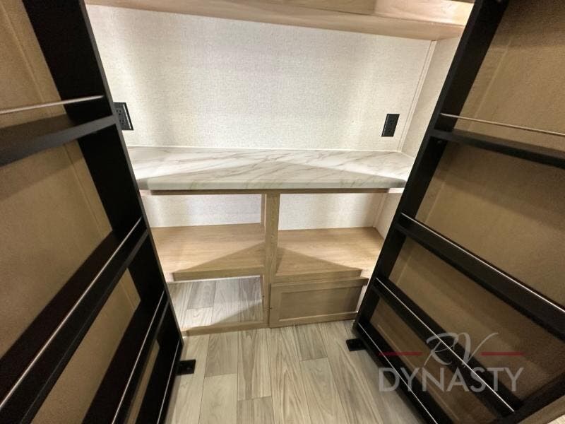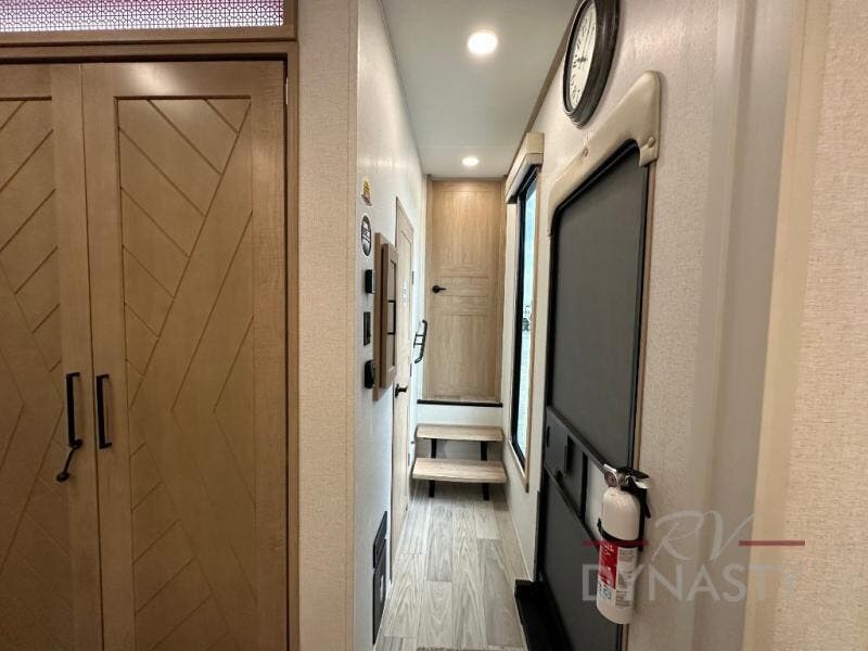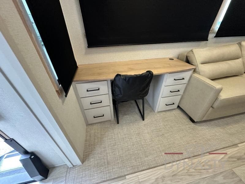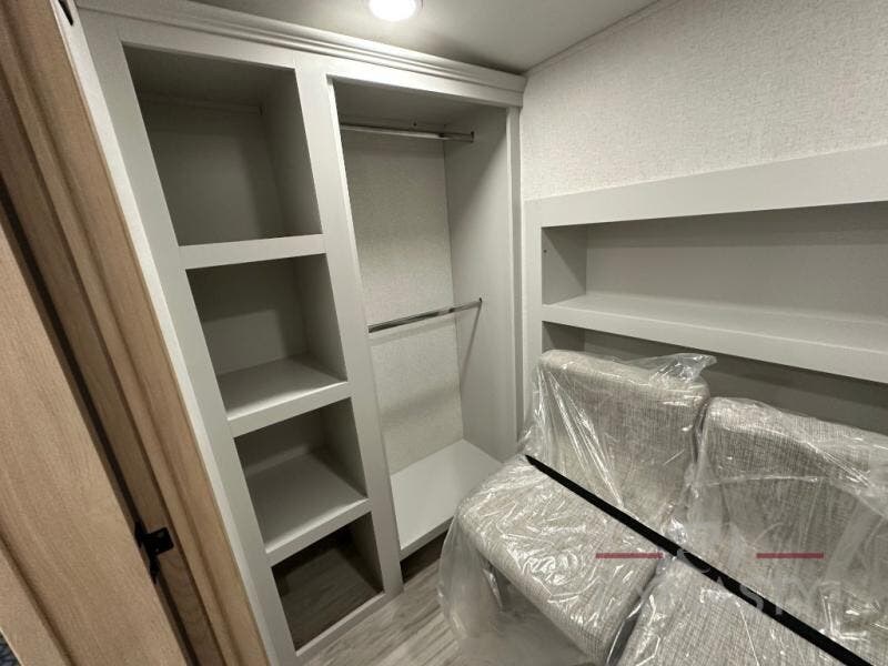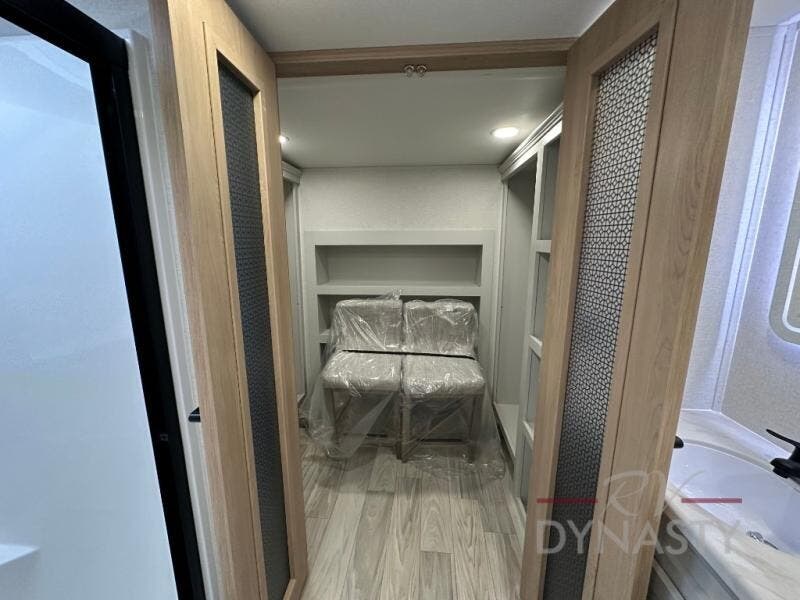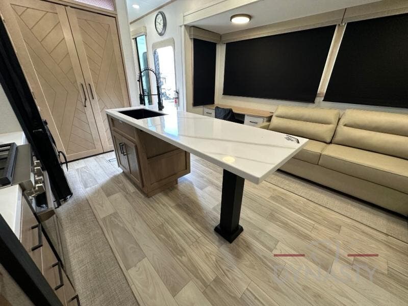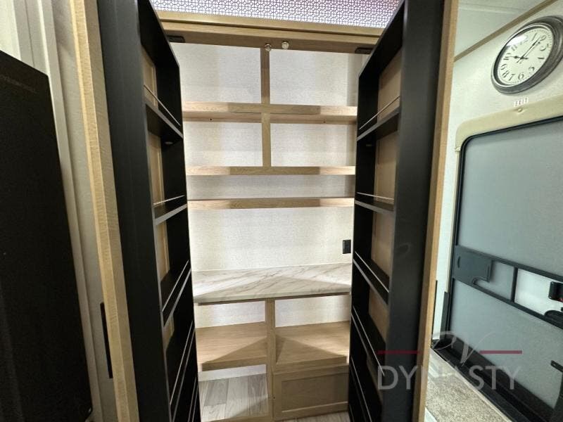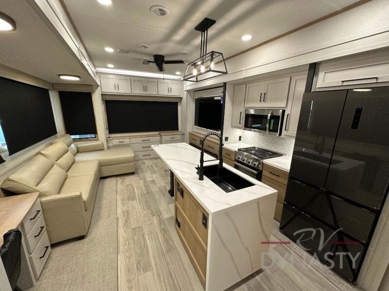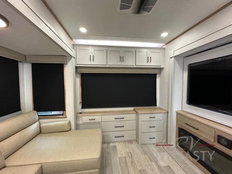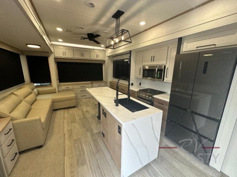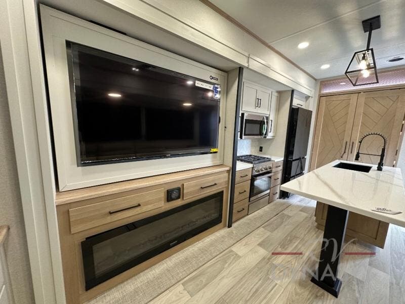 This fifth wheel is perfect for those seeking a comfortable, feature-rich home on wheels. Upon entering, you'll find a spacious rear living room, ideal for relaxation and entertainment. The room features a comfortable chase lounge, sofa, and an entertainment center with a cozy fireplace. For added convenience, there's a hidden pantry, desk with a chair, and a shelf and cabinet for storage. The kitchen is well-appointed with a stylish kitchen island featuring a beautiful waterfall edge. Overhead cabinets provide ample storage, while the microwave, 12V refrigerator, and four-burner cooktop make meal preparation a breeze. Plus, a butler pantry offers additional storage for kitchen essentials. A convenient half bath is located nearby, complete with a stackable washer and dryer prep if you want the option to add these appliances. The bedroom retreat features a comfortable king bed, a small dresser, and a tall dresser with a TV hookup. The adjacent walk-in bathroom closet boasts a one-piece fiberglass shower with a seat, dual sink, medicine cabinet, linen closet, and ample storage thanks to the various shelves, perfect for keeping your belongings organized. Exterior features include two awnings, one 12’ and the other 18’, providing ample shade and protection.