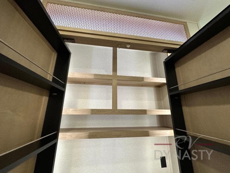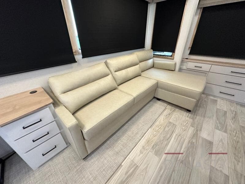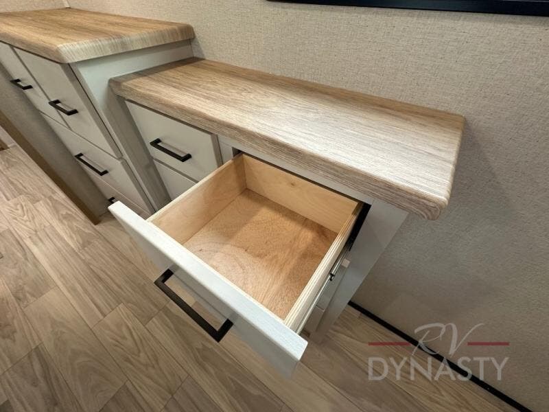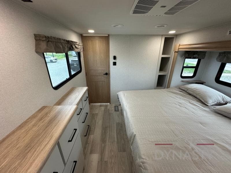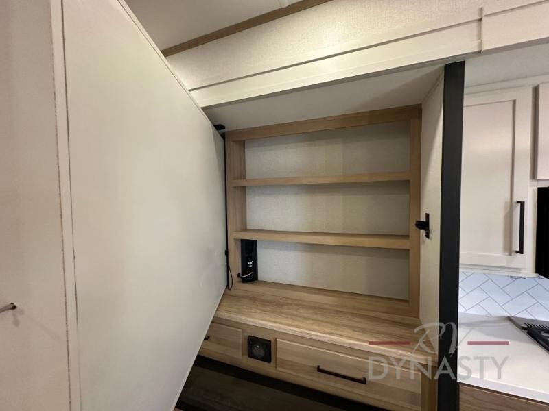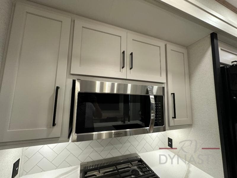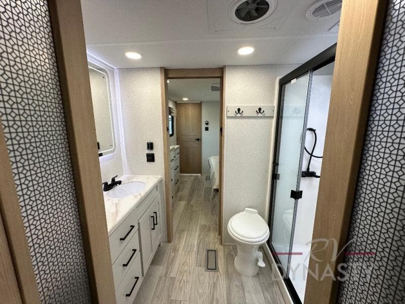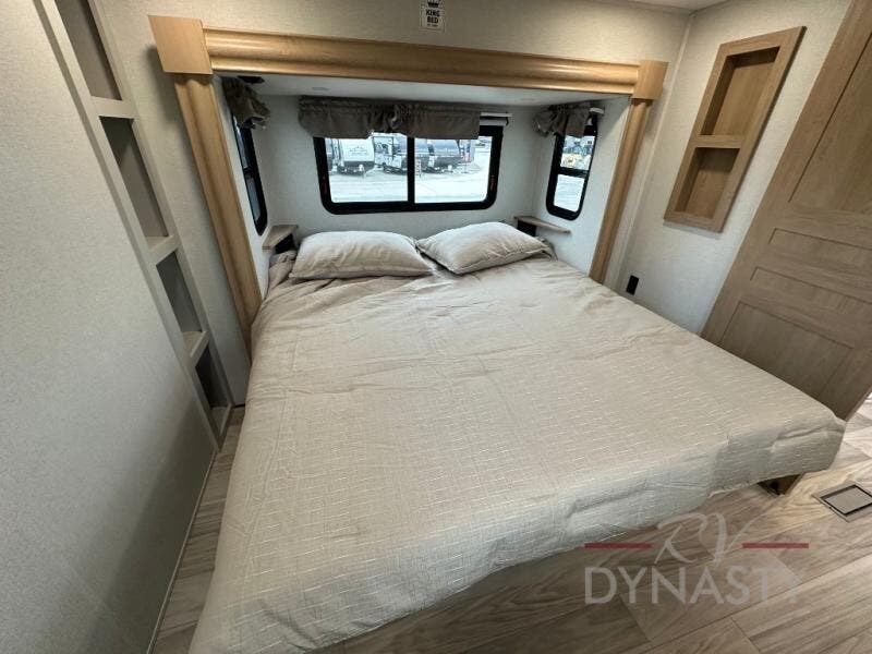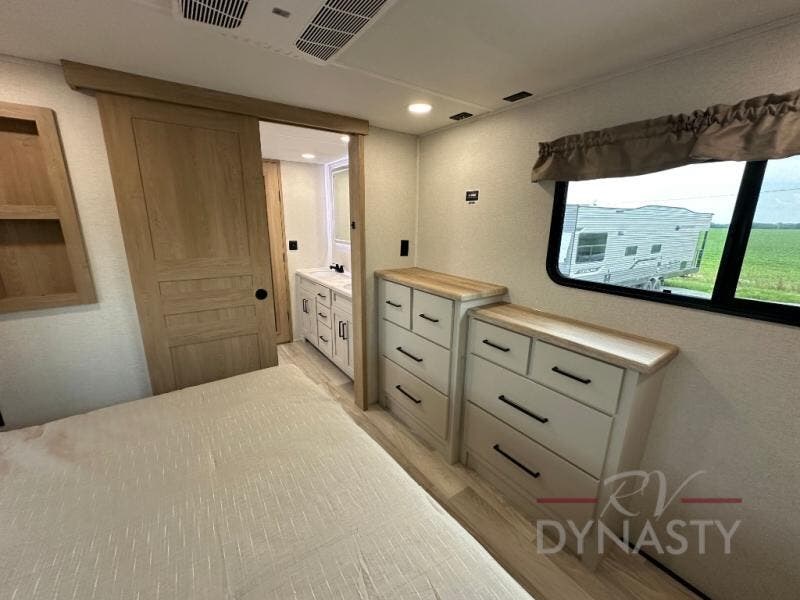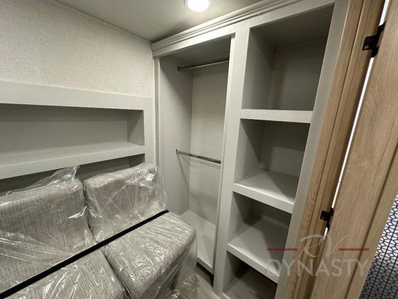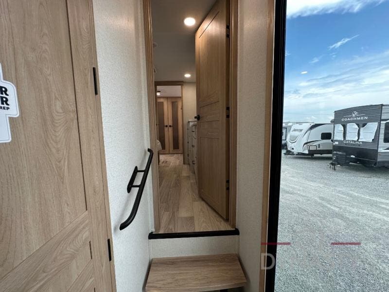 This fifth wheel is perfect for those seeking a comfortable, feature-rich home on wheels. Upon entering, you'll find a spacious rear living room, ideal for relaxation and entertainment. The room features a comfortable chase lounge, sofa, and an entertainment center with a cozy fireplace. For added convenience, there's a hidden pantry, desk with a chair, and a shelf and cabinet for storage. The kitchen is well-appointed with a stylish kitchen island featuring a beautiful waterfall edge. Overhead cabinets provide ample storage, while the microwave, 12V refrigerator, and four-burner cooktop make meal preparation a breeze. Plus, a butler pantry offers additional storage for kitchen essentials. A convenient half bath is located nearby, complete with a stackable washer and dryer prep if you want the option to add these appliances. The bedroom retreat features a comfortable king bed, a small dresser, and a tall dresser with a TV hookup. The adjacent walk-in bathroom closet boasts a one-piece fiberglass shower with a seat, dual sink, medicine cabinet, linen closet, and ample storage thanks to the various shelves, perfect for keeping your belongings organized. Exterior features include two awnings, one 12’ and the other 18’, providing ample shade and protection.
