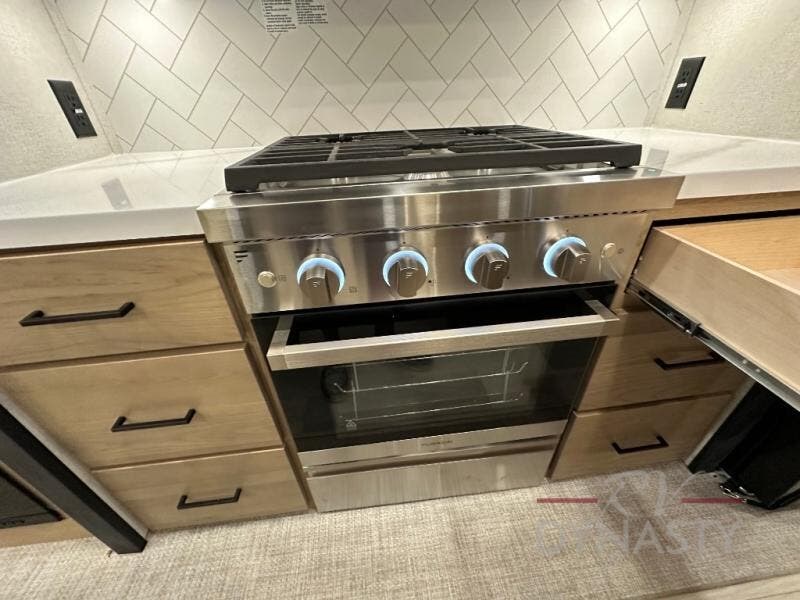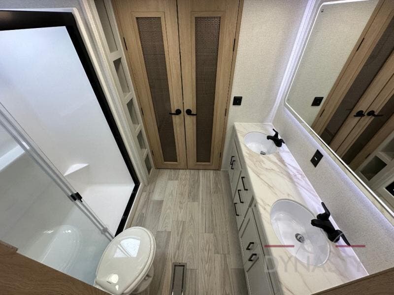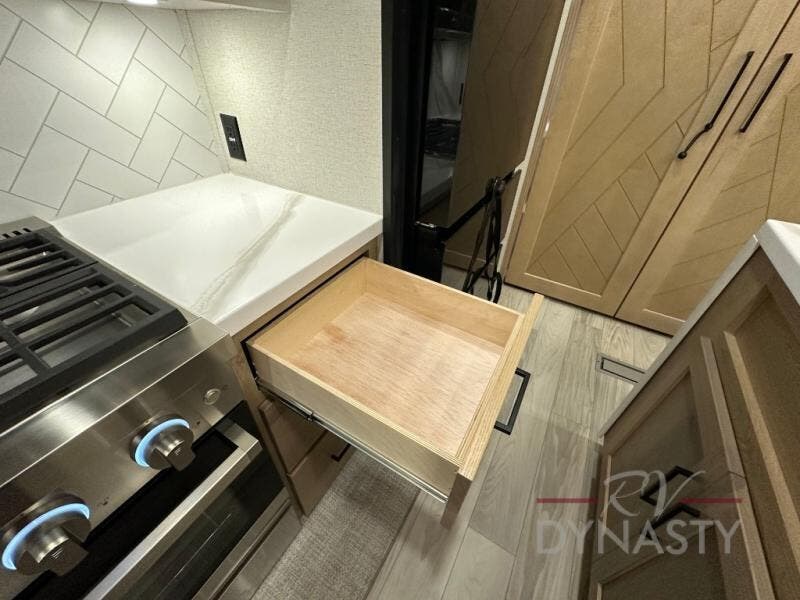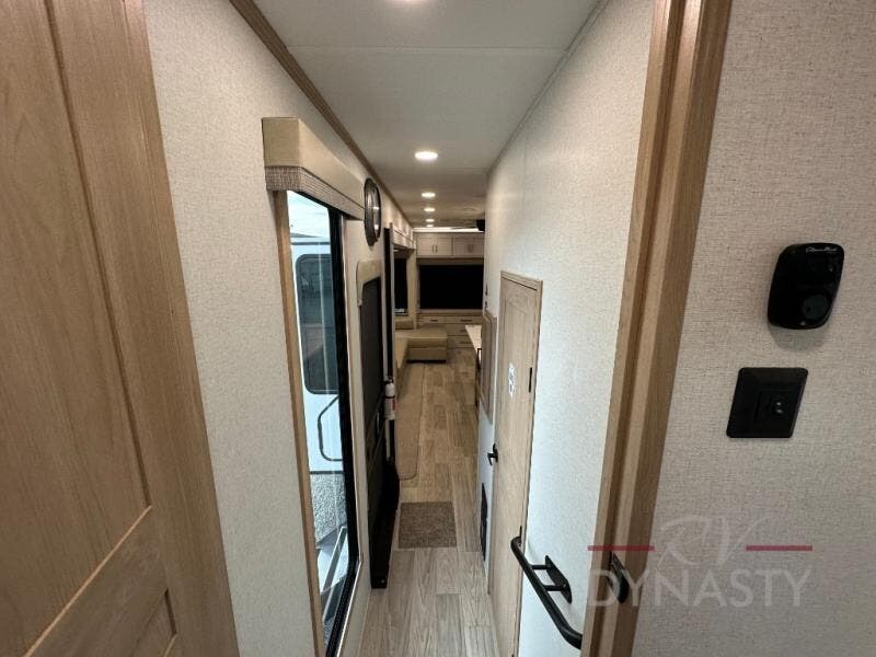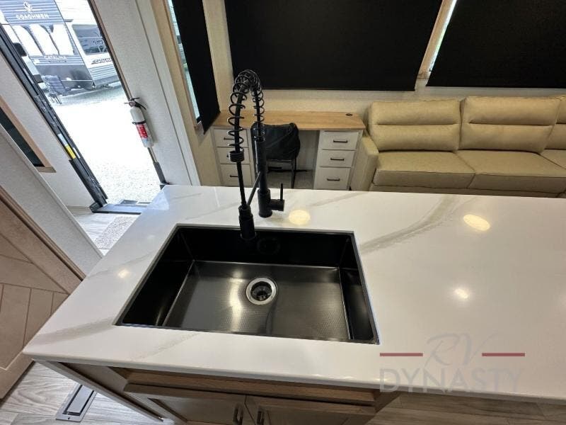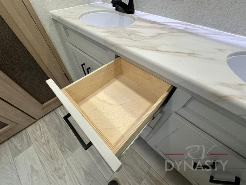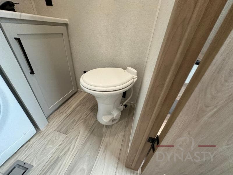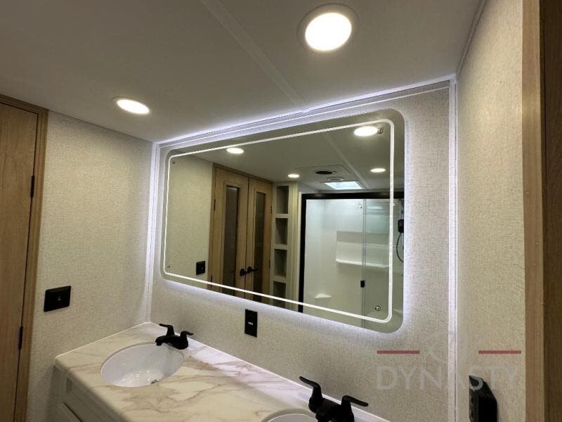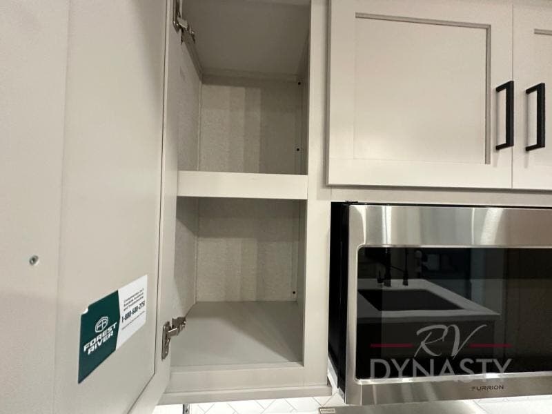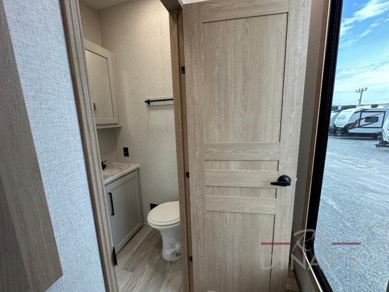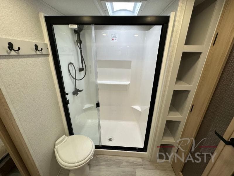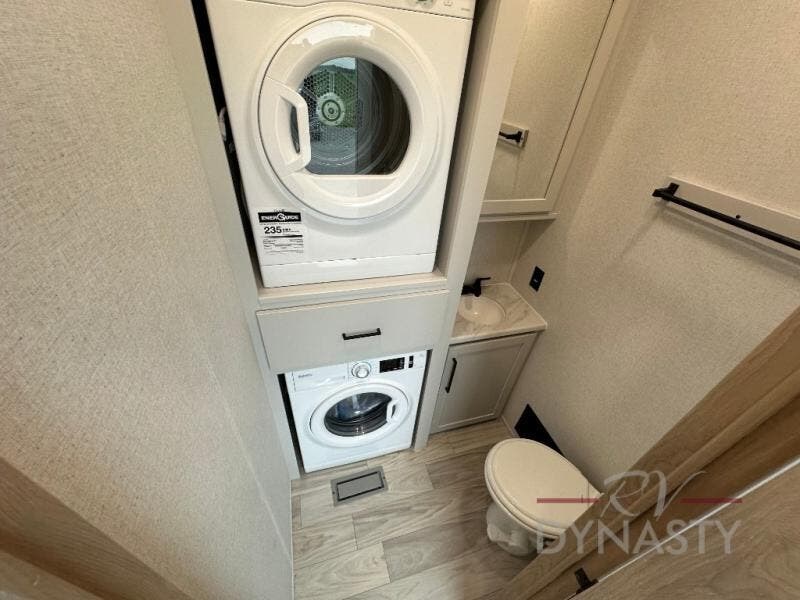 This fifth wheel is perfect for those seeking a comfortable, feature-rich home on wheels. Upon entering, you'll find a spacious rear living room, ideal for relaxation and entertainment. The room features a comfortable chase lounge, sofa, and an entertainment center with a cozy fireplace. For added convenience, there's a hidden pantry, desk with a chair, and a shelf and cabinet for storage. The kitchen is well-appointed with a stylish kitchen island featuring a beautiful waterfall edge. Overhead cabinets provide ample storage, while the microwave, 12V refrigerator, and four-burner cooktop make meal preparation a breeze. Plus, a butler pantry offers additional storage for kitchen essentials. A convenient half bath is located nearby, complete with a stackable washer and dryer prep if you want the option to add these appliances. The bedroom retreat features a comfortable king bed, a small dresser, and a tall dresser with a TV hookup. The adjacent walk-in bathroom closet boasts a one-piece fiberglass shower with a seat, dual sink, medicine cabinet, linen closet, and ample storage thanks to the various shelves, perfect for keeping your belongings organized. Exterior features include two awnings, one 12’ and the other 18’, providing ample shade and protection.