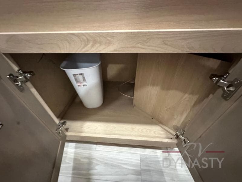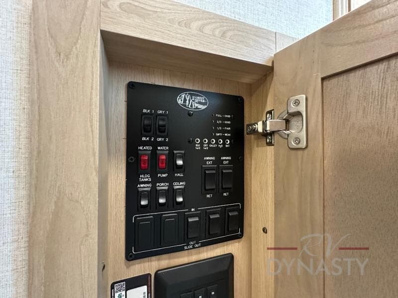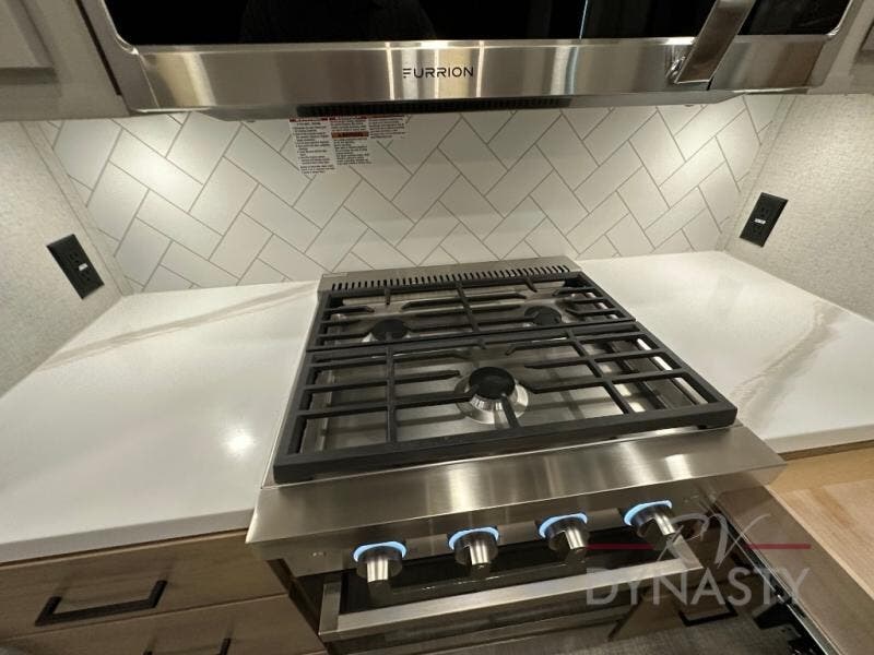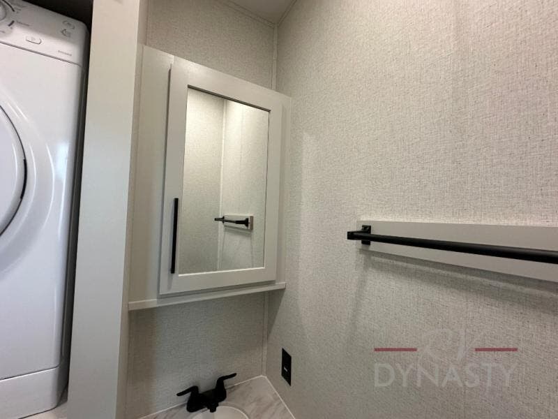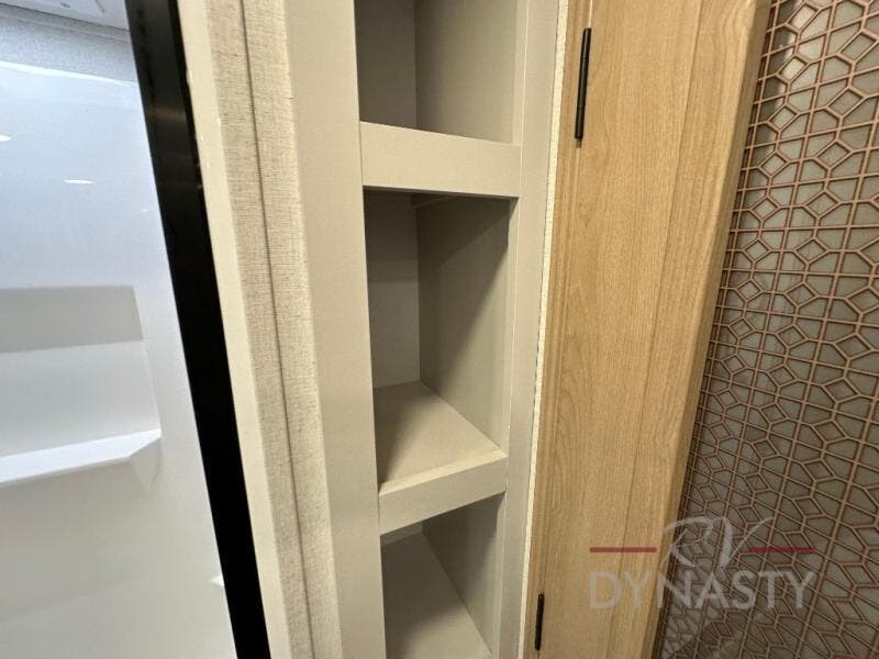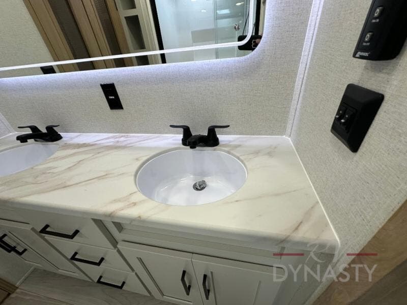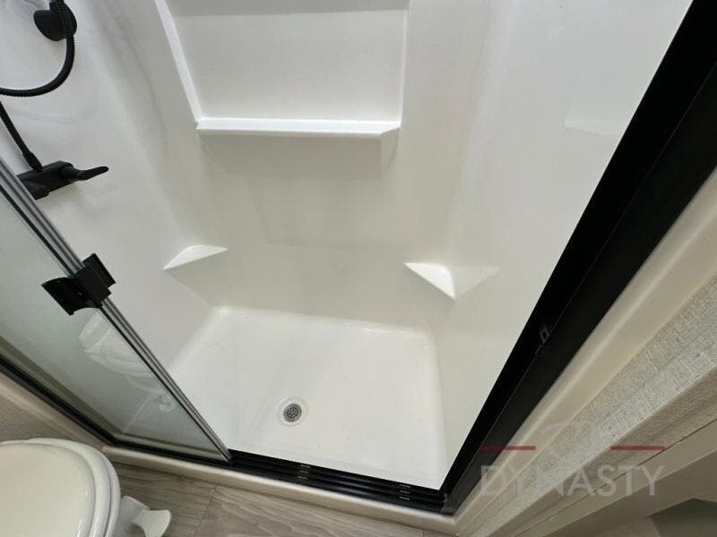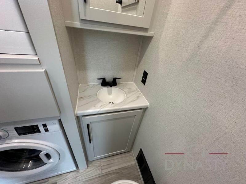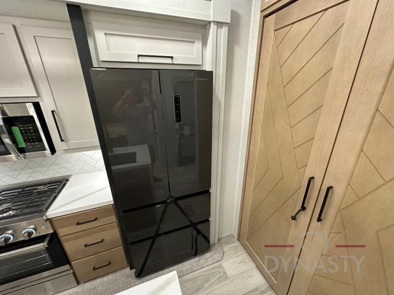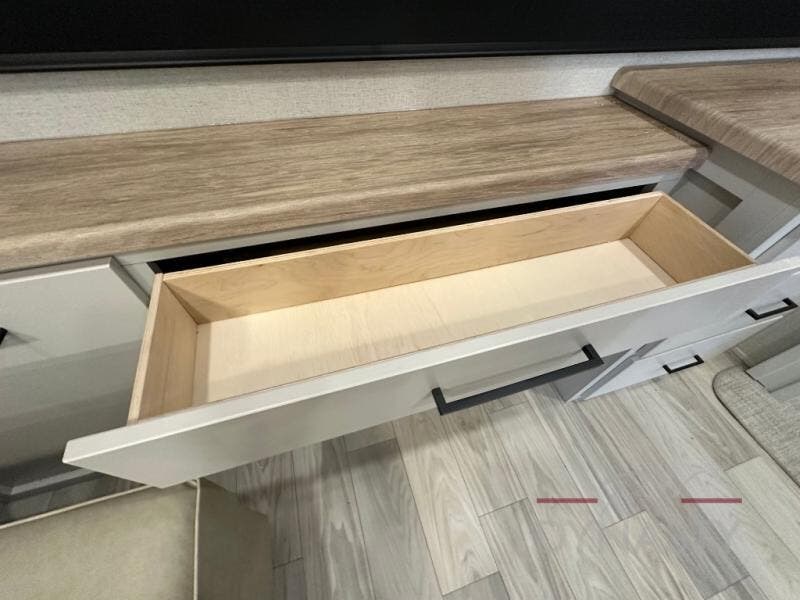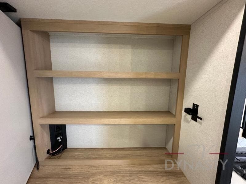 This fifth wheel is perfect for those seeking a comfortable, feature-rich home on wheels. Upon entering, you'll find a spacious rear living room, ideal for relaxation and entertainment. The room features a comfortable chase lounge, sofa, and an entertainment center with a cozy fireplace. For added convenience, there's a hidden pantry, desk with a chair, and a shelf and cabinet for storage. The kitchen is well-appointed with a stylish kitchen island featuring a beautiful waterfall edge. Overhead cabinets provide ample storage, while the microwave, 12V refrigerator, and four-burner cooktop make meal preparation a breeze. Plus, a butler pantry offers additional storage for kitchen essentials. A convenient half bath is located nearby, complete with a stackable washer and dryer prep if you want the option to add these appliances. The bedroom retreat features a comfortable king bed, a small dresser, and a tall dresser with a TV hookup. The adjacent walk-in bathroom closet boasts a one-piece fiberglass shower with a seat, dual sink, medicine cabinet, linen closet, and ample storage thanks to the various shelves, perfect for keeping your belongings organized. Exterior features include two awnings, one 12’ and the other 18’, providing ample shade and protection.