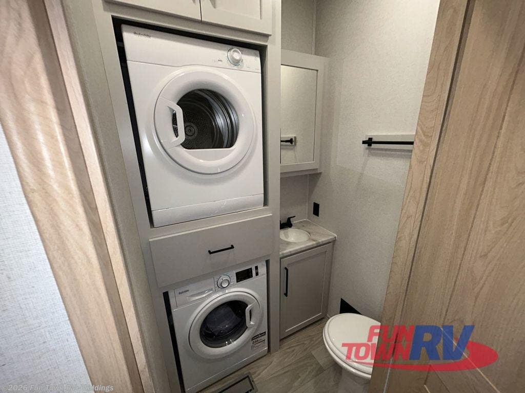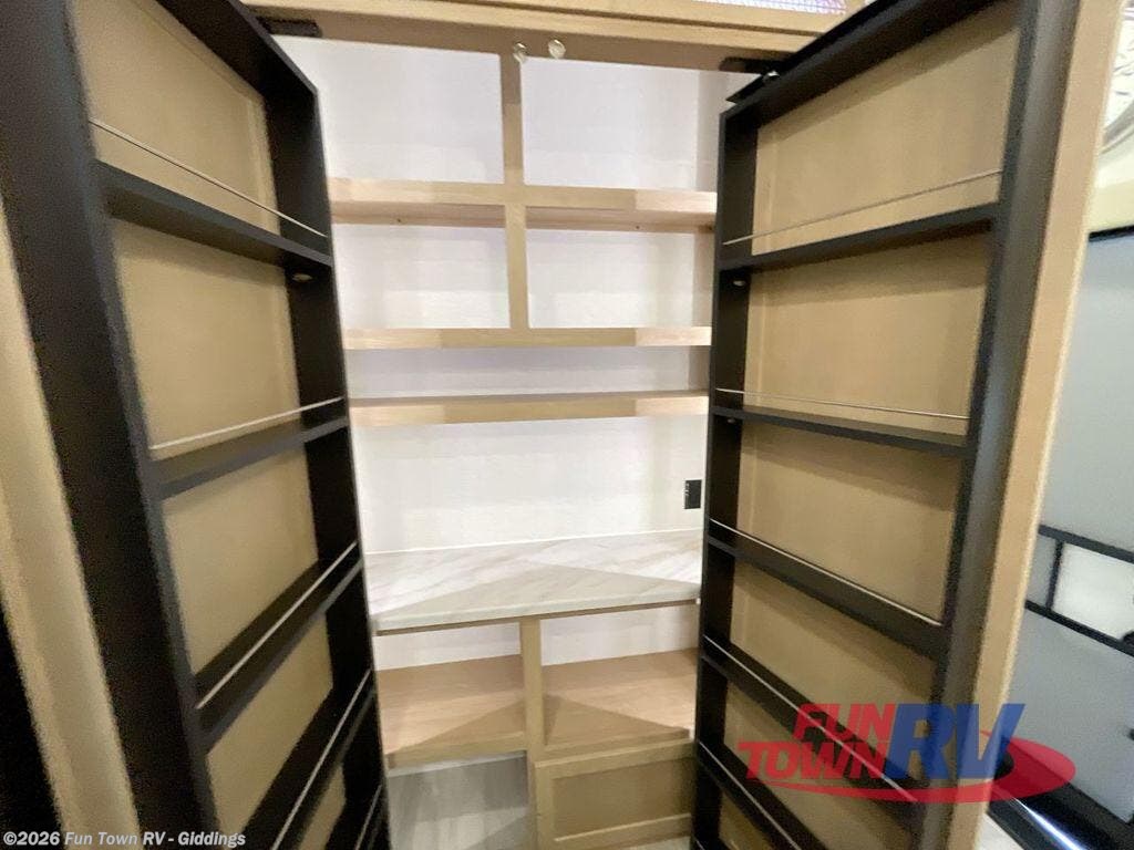 It will be easier than ever to enjoy camping trips in this triple slide out fifth wheel, or even go full-time! The combined kitchen and living area features dual opposing slides for ample space, an L-shaped sofa with a chaise lounge, and a fireplace with a hidden pantry behind for snacks! A desk with a chair and a USB port will provide a place to work if you need to send some emails, and the large kitchen island will give you ample room to prep dinner when you get hungry. There are also pendant lights here, along with a waterfall edge and barstools for dining space. The mid-coach half bath includes a toilet, sink, plus washer and dryer prep, giving you the option to make this the perfect laundry room! The master bedroom up front may be your favorite place to unwind in this unit. There is a king bed slide, a small dresser plus a tall dresser, and a TV hookup if you want the option to watch movies in bed. And you'll be wowed by the front master bedroom with its fiberglass shower with a seat, dual bath sinks, and large walk-in closet!