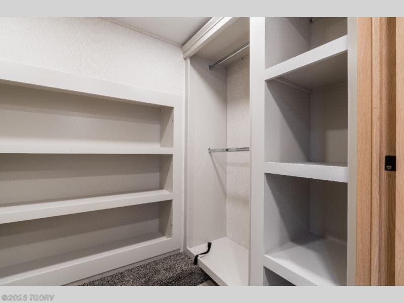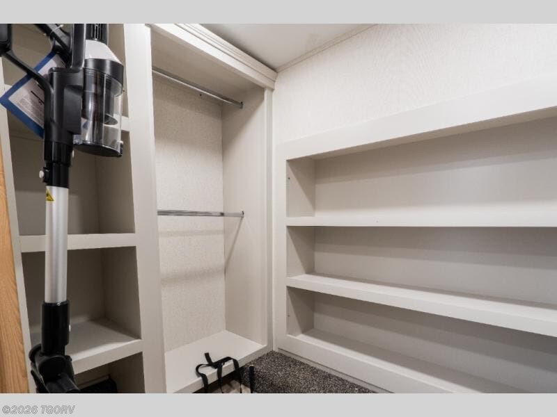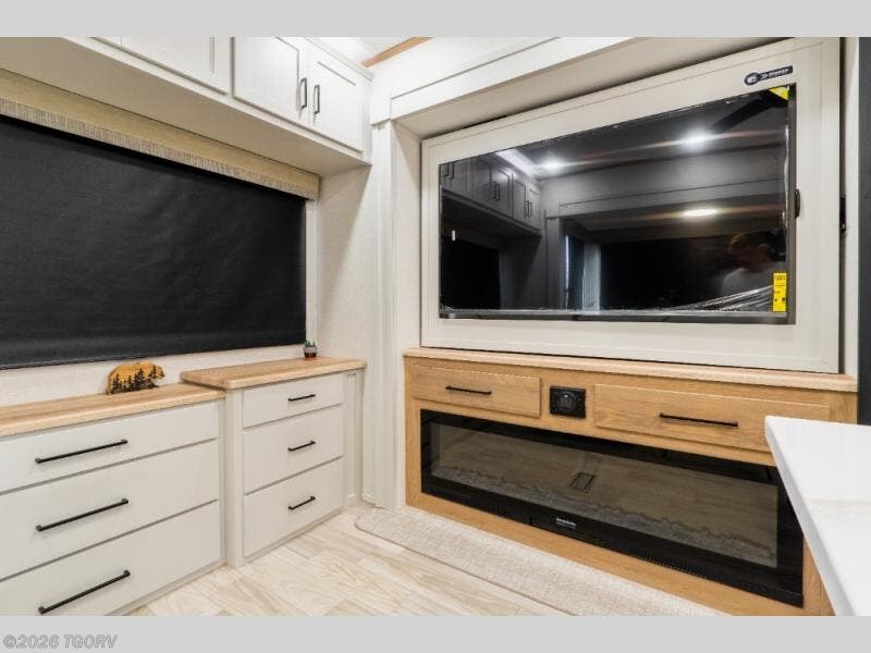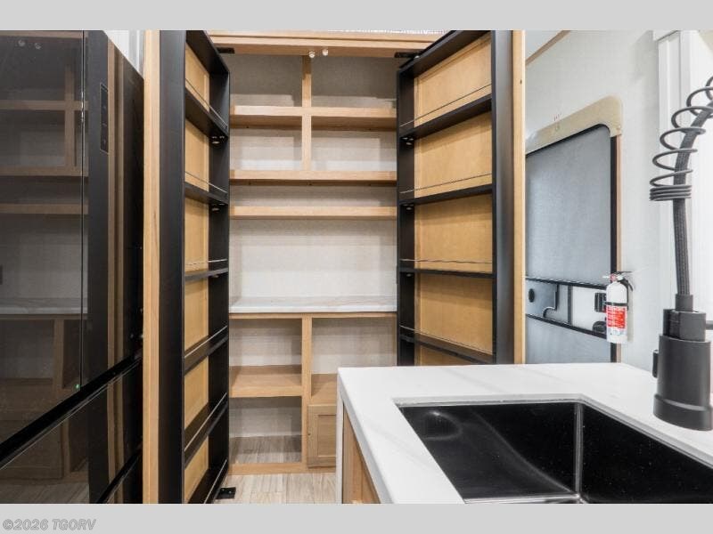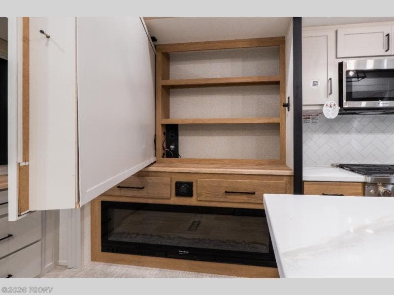 Step inside to a wide-open rear living area designed for relaxation and entertaining. The L-shaped sofa with chaise lounge pairs perfectly with the entertainment center and cozy fireplace, creating a true residential feel. A hidden pantry, desk with chair, and additional shelving provide convenient storage and workspace options.