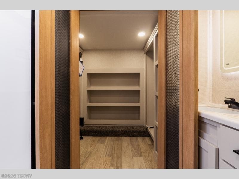 The bedroom retreat offers a king bed slide out, along with a small dresser and a tall dresser with TV hookup. The adjoining walk-in bathroom closet features a one-piece fiberglass shower, dual sinks, medicine cabinet, linen closet, and multiple shelves for organized storage. Outside, two awnings — one 12’ and one 18’ — provide generous shaded outdoor living space.
