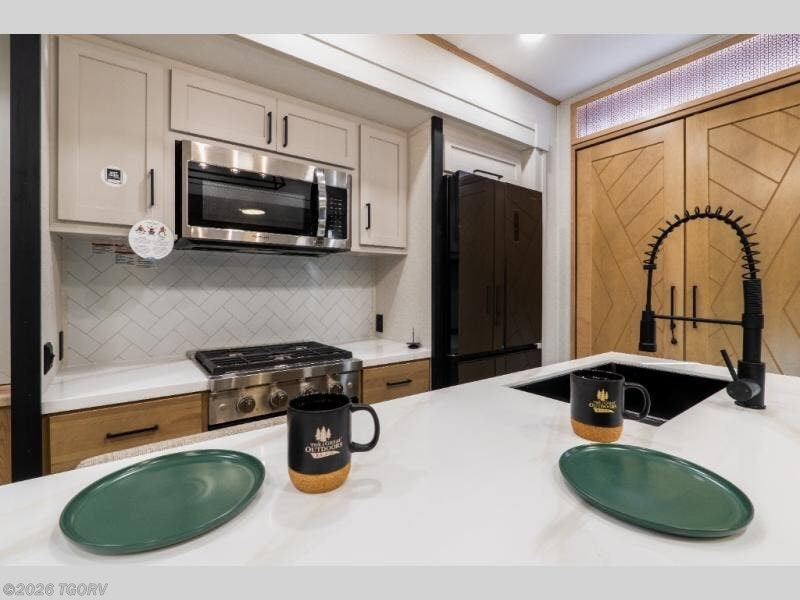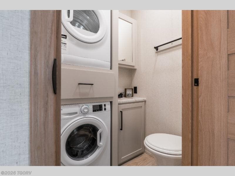 The kitchen is both stylish and functional, featuring a beautiful island with a waterfall edge, overhead cabinetry, 3 burner cooktop/oven combo, microwave, and 12V refrigerator. The butler pantry adds extra storage for kitchen essentials, keeping your main cooking space clean and organized. Just off the living area, the convenient bath and a half includes washer and dryer prep, making longer stays even more practical.