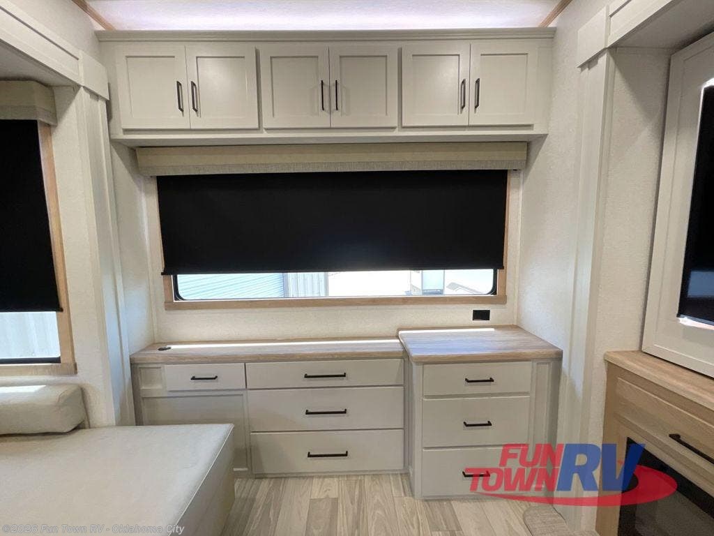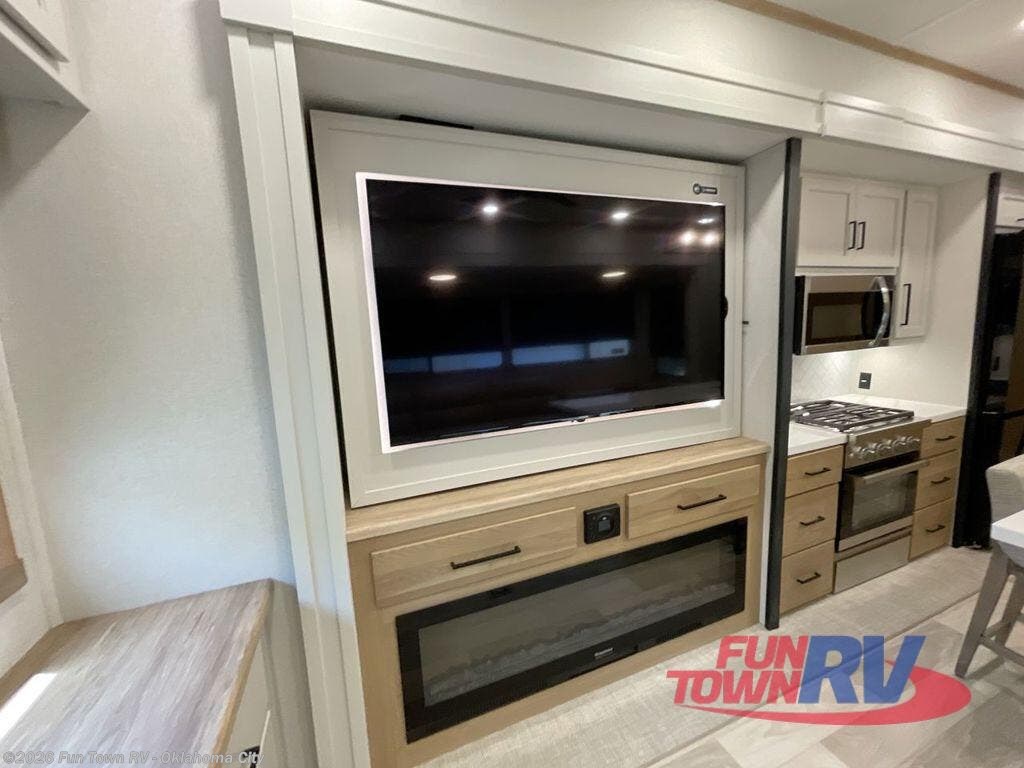 It will be easier than ever to enjoy camping trips in this triple slide out fifth wheel, or even go full-time! The combined kitchen and living area features dual opposing slides for ample space, an L-shaped sofa with a chaise lounge, and a fireplace with a hidden pantry behind for snacks! A desk with a chair and a USB port will provide a place to work if you need to send some emails, and the large kitchen island will give you ample room to prep dinner when you get hungry. There are also pendant lights here, along with a waterfall edge and barstools for dining space. The mid-coach half bath includes a toilet, sink, plus washer and dryer prep, giving you the option to make this the perfect laundry room! The master bedroom up front may be your favorite place to unwind in this unit. There is a king bed slide, a small dresser plus a tall dresser, and a TV hookup if you want the option to watch movies in bed. And you'll be wowed by the front master bedroom with its fiberglass shower with a seat, dual bath sinks, and large walk-in closet!