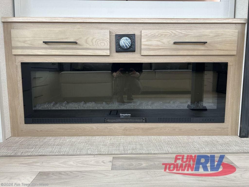 It will be easier than ever to enjoy camping trips in this triple slide out fifth wheel, or even go full-time! The combined kitchen and living area features dual opposing slides for ample space, an L-shaped sofa with a chaise lounge, and a fireplace with a hidden pantry behind for snacks! A desk with a chair and a USB port will provide a place to work if you need to send some emails, and the large kitchen island will give you ample room to prep dinner when you get hungry. There are also pendant lights here, along with a waterfall edge and barstools for dining space. The mid-coach half bath includes a toilet, sink, plus washer and dryer prep, giving you the option to make this the perfect laundry room! The master bedroom up front may be your favorite place to unwind in this unit. There is a king bed slide, a small dresser plus a tall dresser, and a TV hookup if you want the option to watch movies in bed. And you'll be wowed by the front master bedroom with its fiberglass shower with a seat, dual bath sinks, and large walk-in closet!