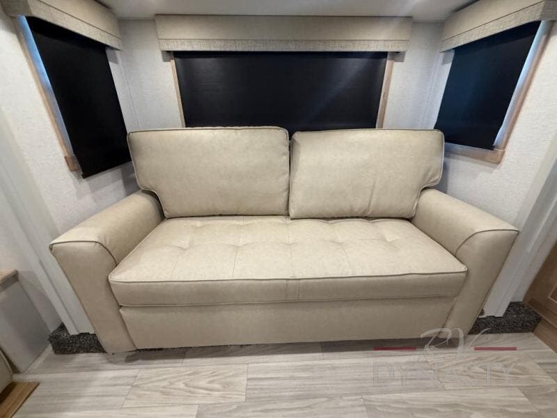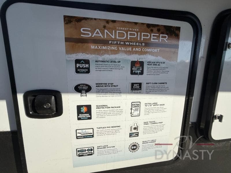 You will find the perfect balance of size, space, features, and luxury with any one of these Forest River Sandpiper fifth wheels! They are constructed with a welded aluminum framed vacuum bonded laminated superstructure, a cambered powder coated frame with rust prohibitor, and a fully enclosed underbelly for added protection against the elements. The large tinted windows come with a 80/20 UV prohibitor or you can choose the optional dual pane windows. Some hassle-free amenities include a 60k BTU on-demand water heater, full coach water filter system, tire pressure monitor system, and an electric leveling system! Inside, you'll enjoy stainless steel appliances, solid surface countertops, Beachside Sundance linoleum, recessed residential lighting, and many more comforts!