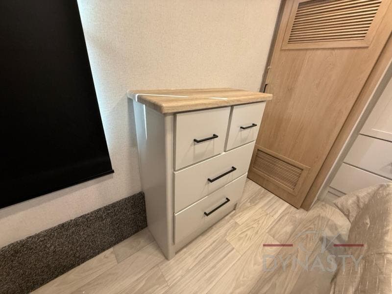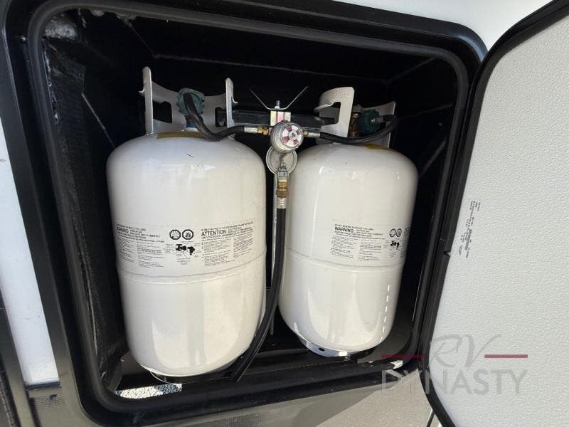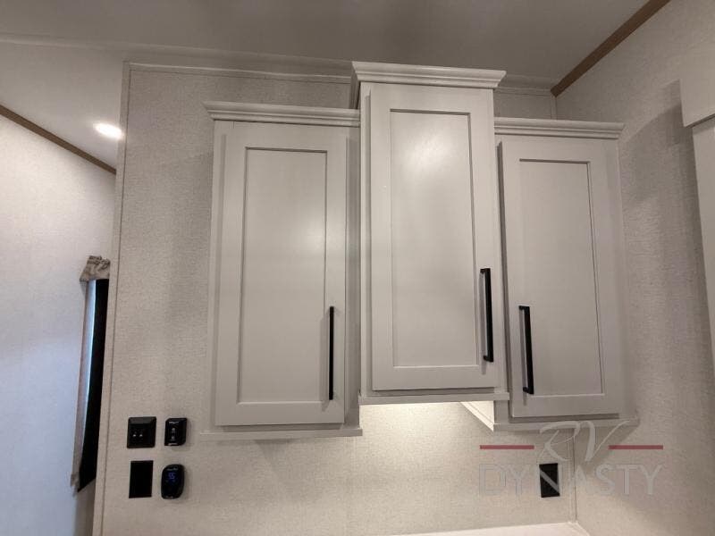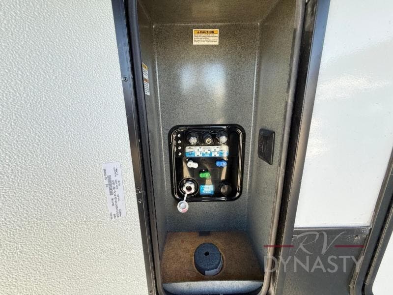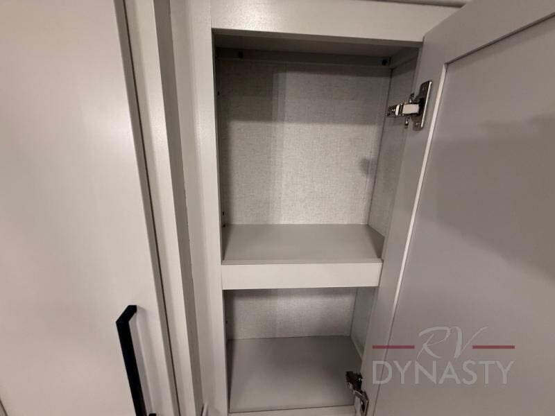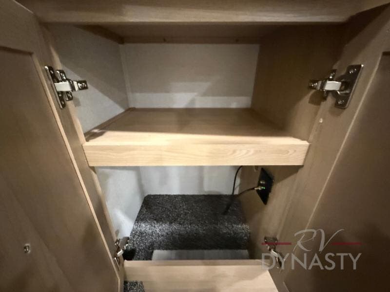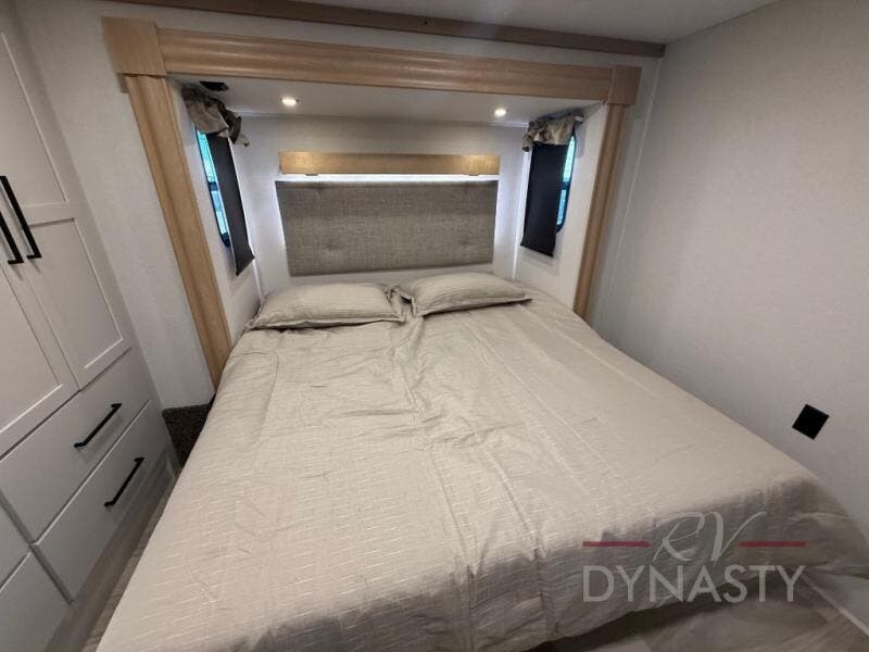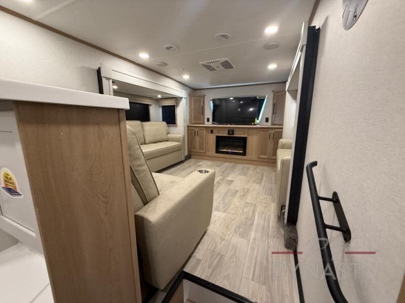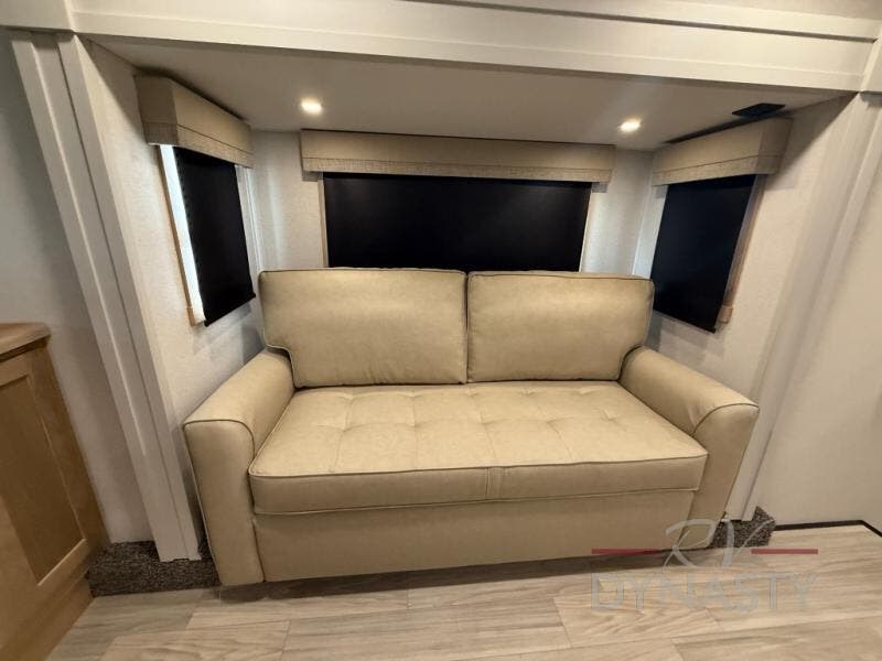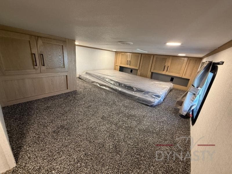 Wow! Check out this fifth wheel with a full loft for the little ones with two bunk mats, two wardrobe bookcases and a wardrobe/cabinet for ample storage. The main floor includes five slides for maximum space, a front living area with dual hide-a-bed sofas, plus an entertainment center with a 50" flat screen TV for movie nights! Once your guests have converted the living room to their bedroom at night, you can take the rear private bedroom. There is a king bed slide out here, a wardrobe, plus a closet with washer and dryer prep for full-time living. The full bath is easily accessible for everyone, and the middle kitchen will be a favorite with the chef of your group. Here, you'll find a 12V refrigerator, an island, tons of counter space, plus a hutch to display nice dishes, and a pantry for dry goods. Don't let this fifth wheel slip away!