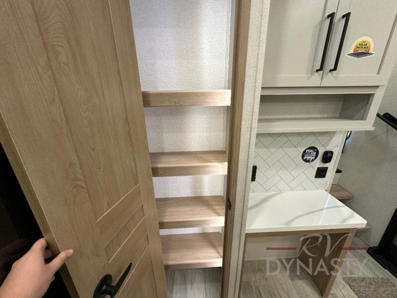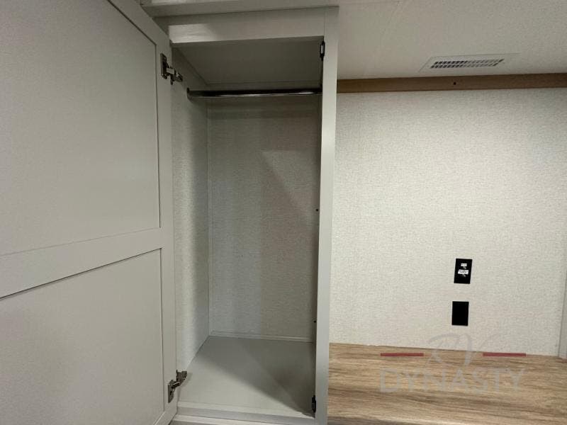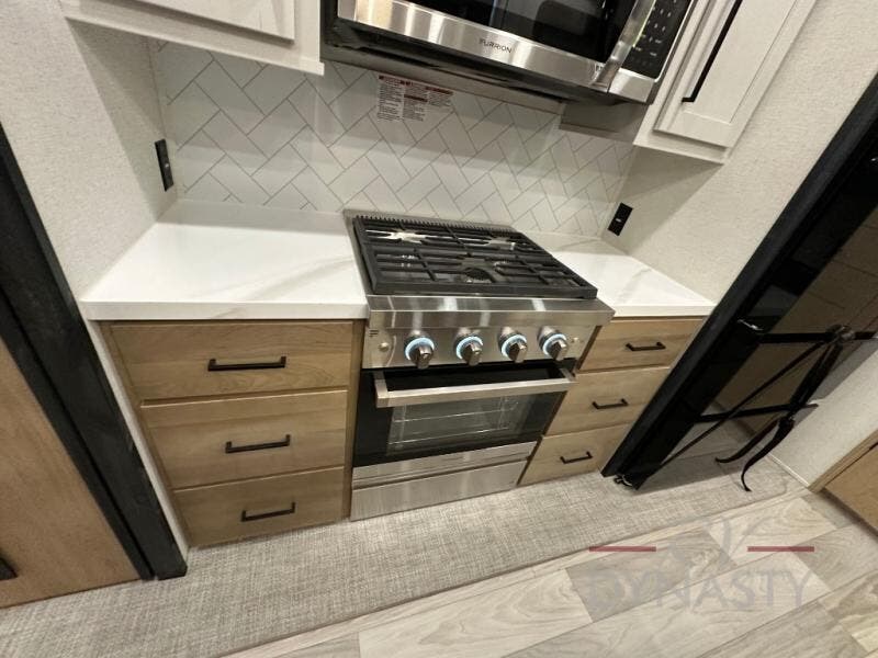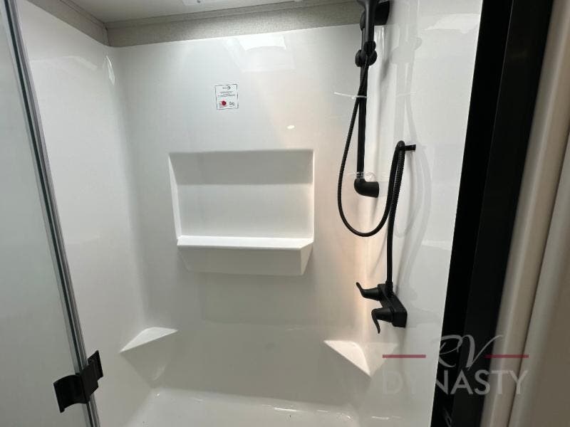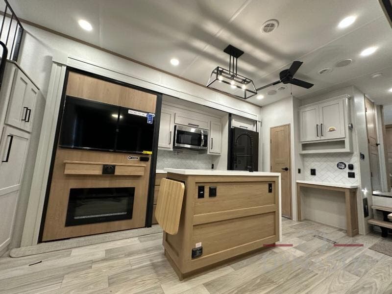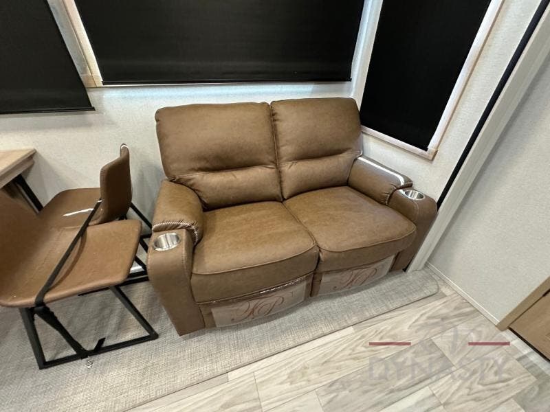 Weekend camping trips and full-time RV living is made complete in this quad slide out fifth wheel. Your crew can relax under the two power awnings, or head inside to enjoy the fireplace. There is also a 50" flat screen TV across from the theater seating, plus a free-standing dinette to dine at. There are two full baths with the front bath including a walk-in shower with a seat for your comfort, and the front private bedroom will feel just like home with its queen bed and large front wardrobe. There is even washer and dryer prep to make laundry day easier than ever. The master bedroom in back includes a second queen bed slide out, and the rear full bath has another convenience with it's exterior entry door, and
