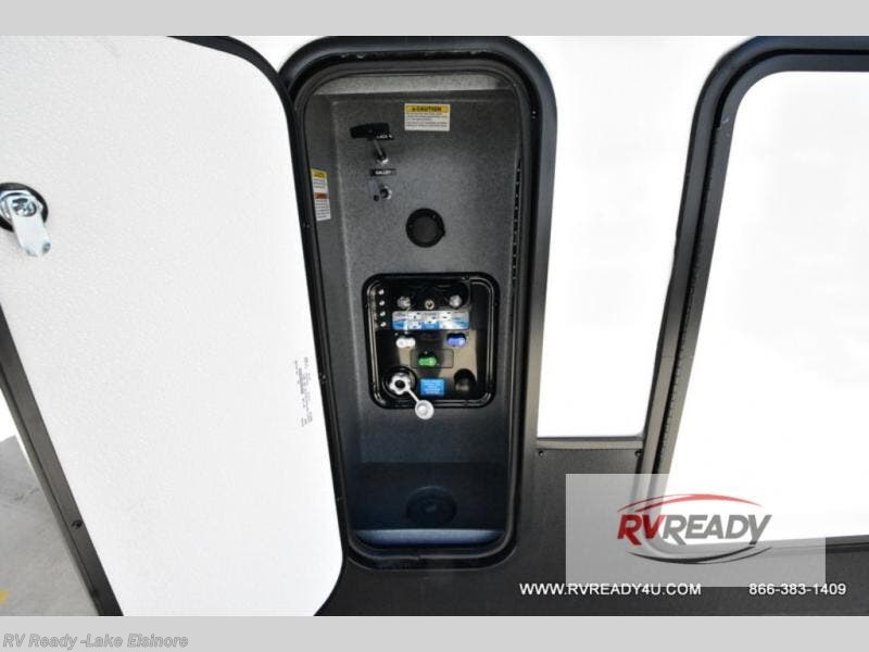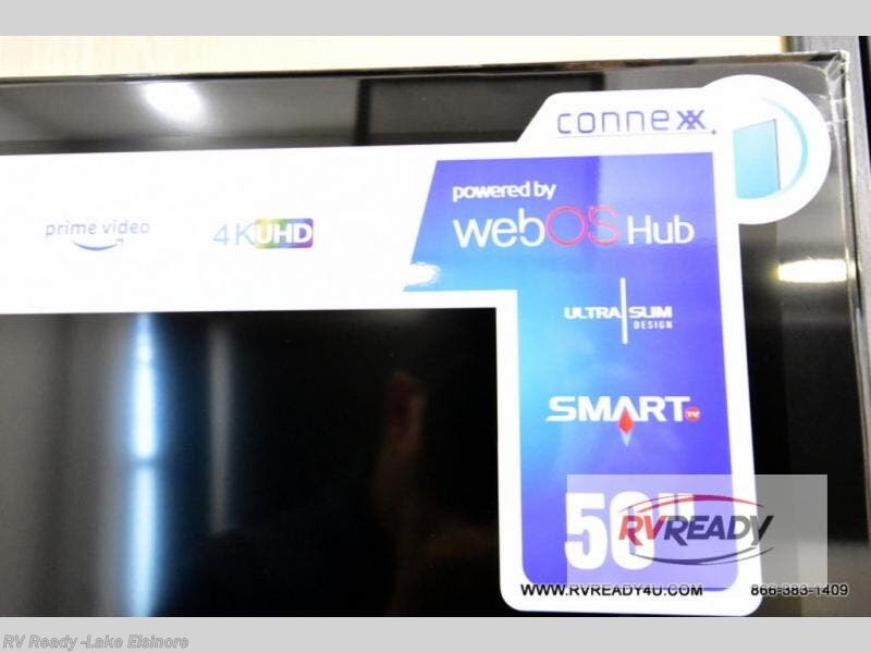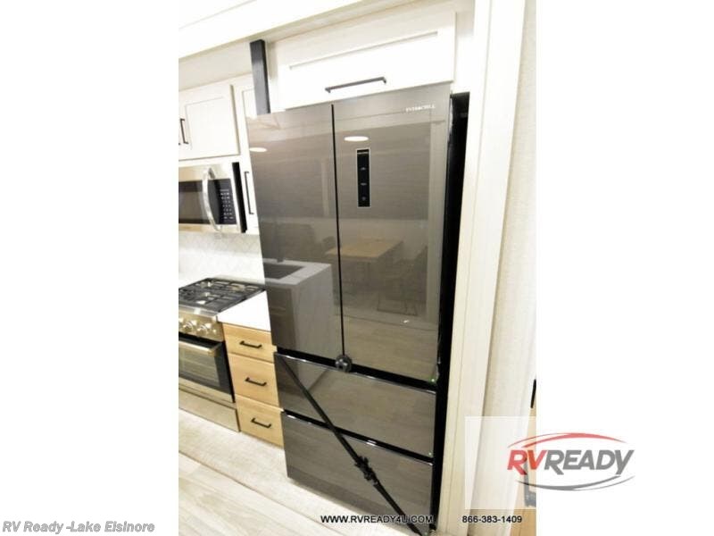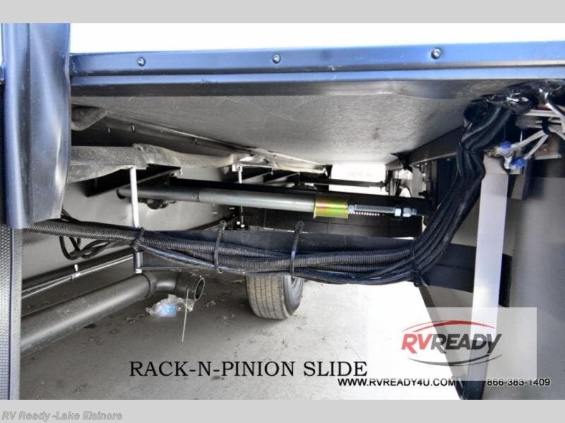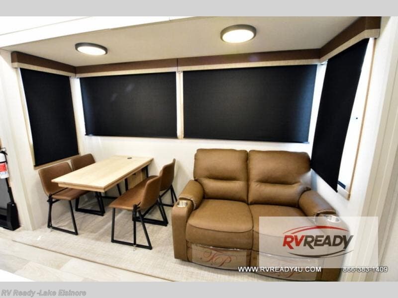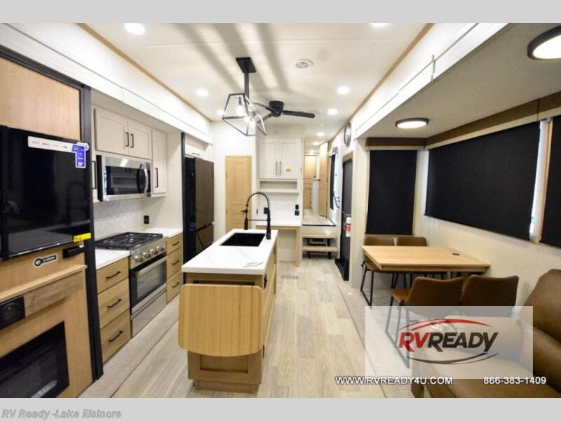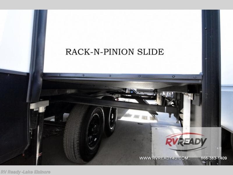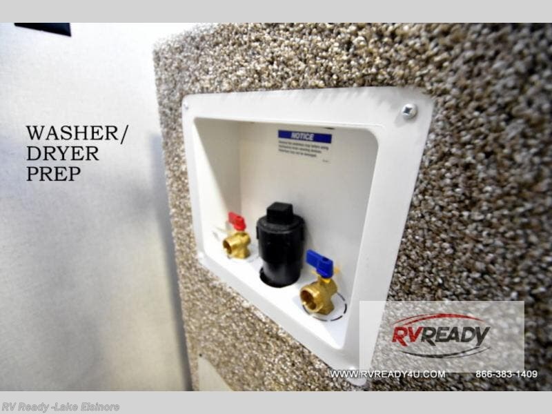 Weekend camping trips and full-time RV living is made complete in this quad slide out fifth wheel. Your crew can relax under the two power awnings, or head inside to enjoy the fireplace. There is also a 50" flat screen TV across from the theater seating, plus a free-standing dinette to dine at. There are two full baths with the front bath including a walk-in shower with a seat for your comfort, and the front private bedroom will feel just like home with its queen bed and large front wardrobe. There is even washer and dryer prep to make laundry day easier than ever. The master bedroom in back includes a second queen bed slide out, and the rear full bath has another convenience with it's exterior entry door, and