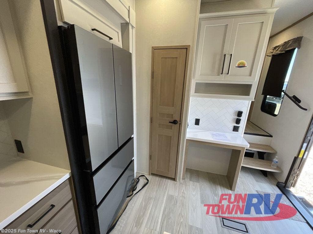 Enjoy a home on wheels with this fifth wheel! There are two bedrooms to choose from plus an upper loft with two 32" x 74" bunk mats, cabinets, and TV prep. The front private bedroom has a queen bed slide across from a dresser and next to a front wardrobe that is prepped to add an optional washer and dryer. The second bedroom has a queen bed slide across from a dresser with wardrobes on either side, plus it's very own full rear bathroom which has a tub and a rear entry/exit door to the unit. The second full bathroom has a one-piece fiberglass shower so everyone can get ready quickly in the morning. Prepare your best home cooked meals with the kitchen island and three burner cooktop then enjoy it at the free-standing dinette. Relax in true comfort each night in the theater seating across from the fireplace and 50" TV at the entertainment center!