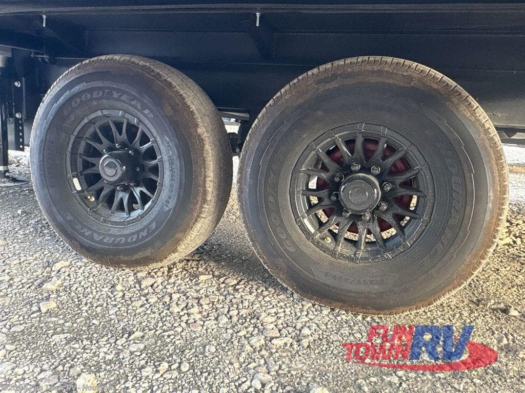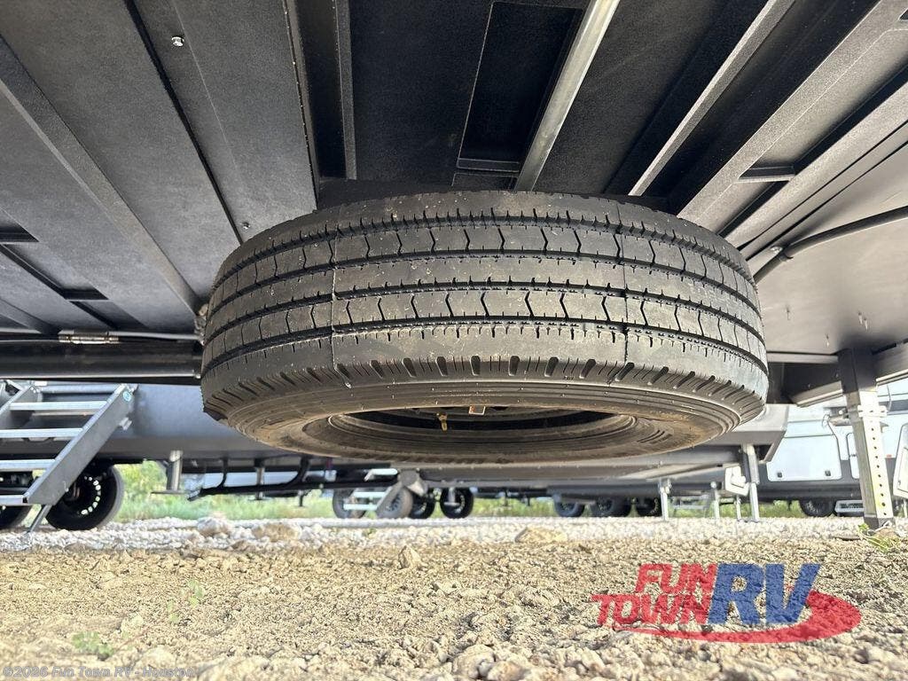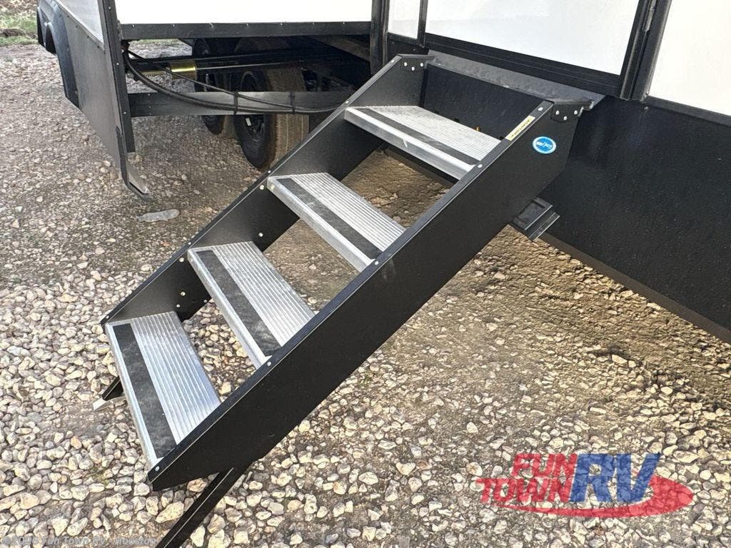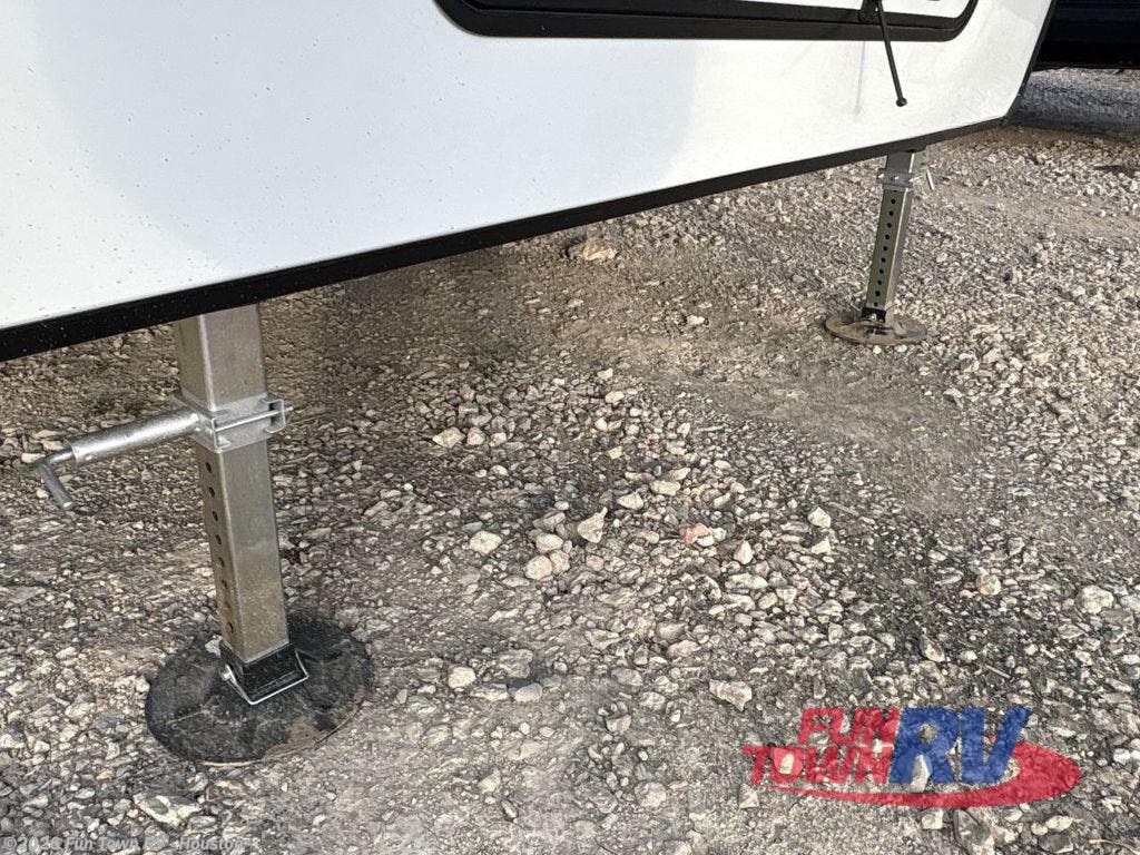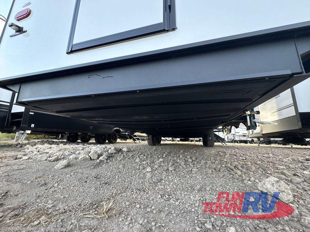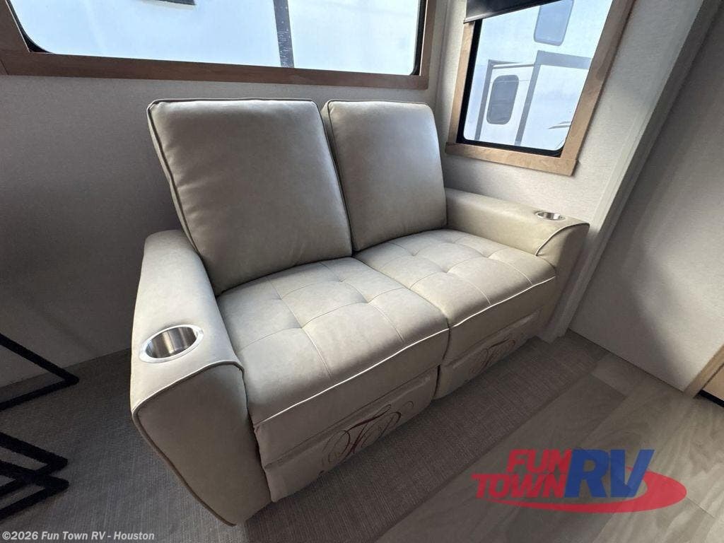 Enjoy a home on wheels with this fifth wheel! There are two bedrooms to choose from plus an upper loft with two 32" x 74" bunk mats, cabinets, and TV prep. The front private bedroom has a queen bed slide across from a dresser and next to a front wardrobe that is prepped to add an optional washer and dryer. The second bedroom has a queen bed slide across from a dresser with wardrobes on either side, plus it's very own full rear bathroom which has a tub and a rear entry/exit door to the unit. The second full bathroom has a one-piece fiberglass shower so everyone can get ready quickly in the morning. Prepare your best home cooked meals with the kitchen island and three burner cooktop then enjoy it at the free-standing dinette. Relax in true comfort each night in the theater seating across from the fireplace and 50" TV at the entertainment center!