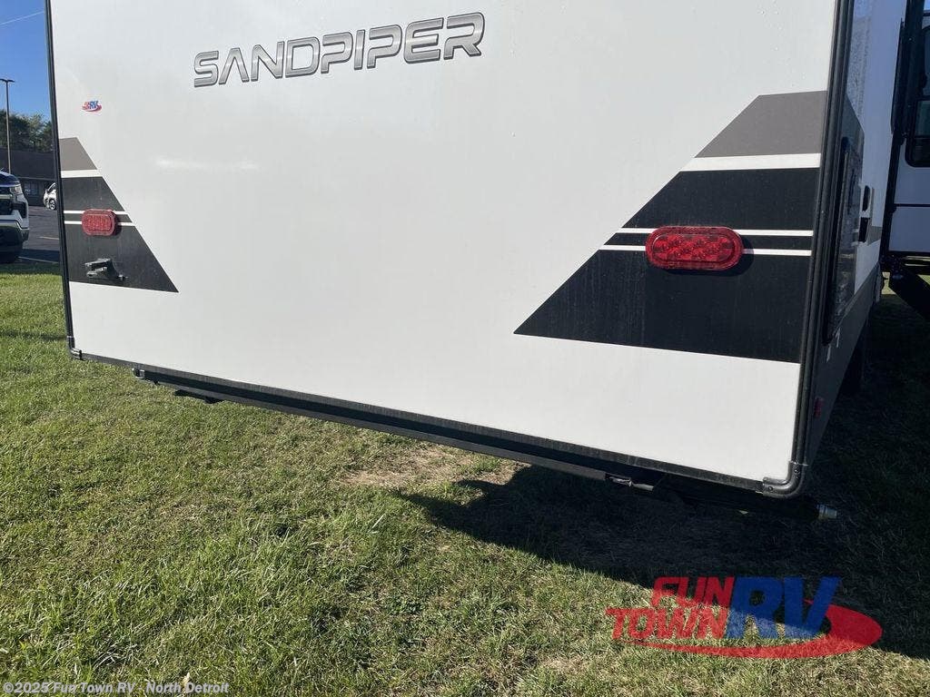 With each Sandpiper Destination Trailer by Forest River you will enjoy many luxurious features, such as crown molding over the kitchen cabinets, solid surface kitchen countertops, a memory foam mattress, plus so much more. The extra large picture windows throughout let natural light in and provide beautiful outdoor views, and each model includes three or more slides for added interior space. You'll find many exterior conveniences, like the porch light with an interior switch, the rain gutters with extra long drip spouts to prevent black streaking, and an electric awning with LED light strip, plus more! You will stay comfortable year around with dual 15,000 A/C units plus each model is constructed with an Underbelly Armor for better protection and insulation!