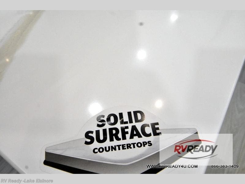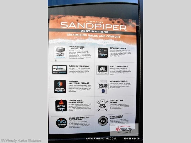 With each Sandpiper Destination Trailer by Forest River you will enjoy many luxurious features, such as crown molding over the kitchen cabinets, solid surface kitchen countertops, a memory foam mattress, plus so much more. The extra large picture windows throughout let natural light in and provide beautiful outdoor views, and each model includes three or more slides for added interior space. You'll find many exterior conveniences, like the porch light with an interior switch, the rain gutters with extra long drip spouts to prevent black streaking, and an electric awning with LED light strip, plus more! You will stay comfortable year around with dual 15,000 A/C units plus each model is constructed with an Underbelly Armor for better protection and insulation!