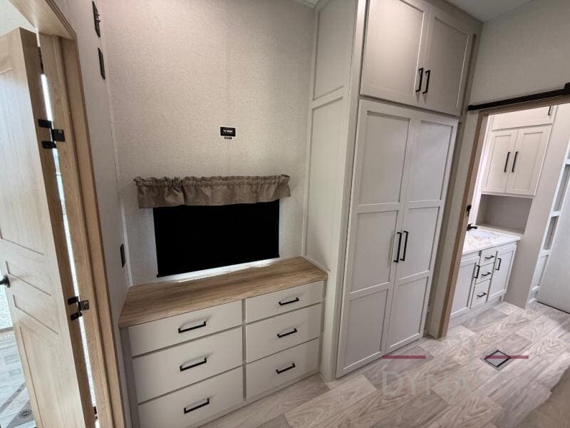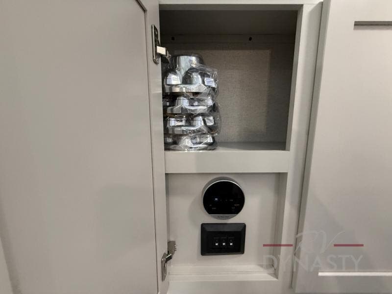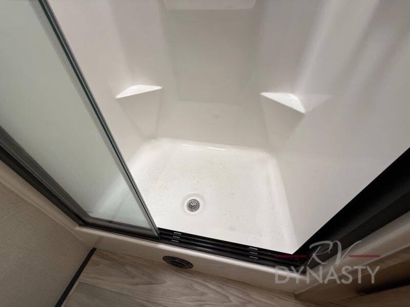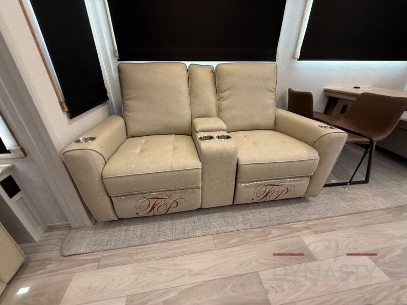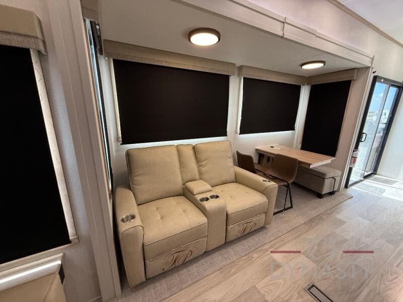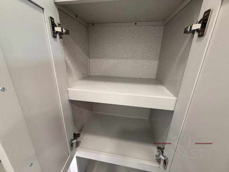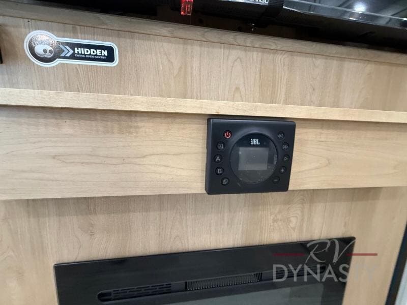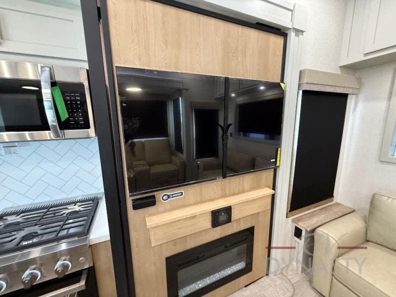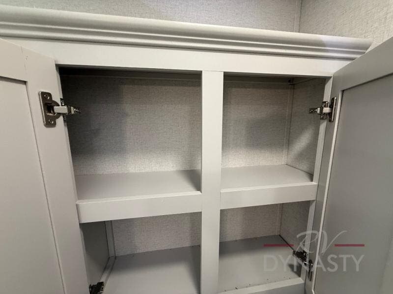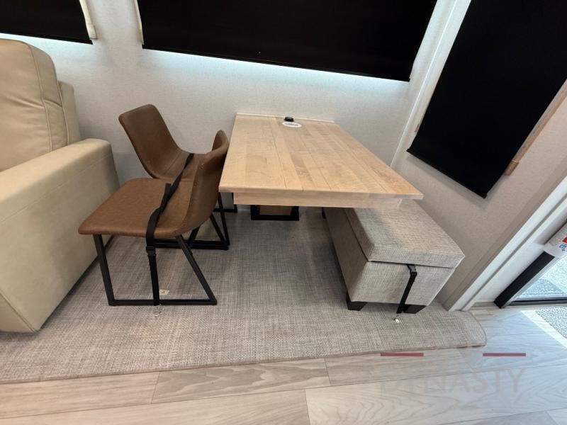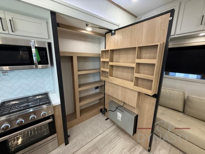 Enjoy extended stays in this triple slide out destination trailer! Once you unload your bags, you can put out the 19' awning with LED lights and relax in your camp chairs. The Chef Collection three burner range will let you make lunch for your crew when you head inside, and there is a free-standing dinette with a bench and two chairs to dine at. After your meal, you can relax on the theater seating across from the entertainment center with a hidden pantry behind it. There is also a front tri-fold hide-a-bed sofa to let guests sleep over. The mid-coach half bath will be easily accessible to use, and the full rear bath will create a master bedroom you are sure to love. There is a king bed slide out here, a dresser with TV prep, and two wardrobes to keep your things tidy!