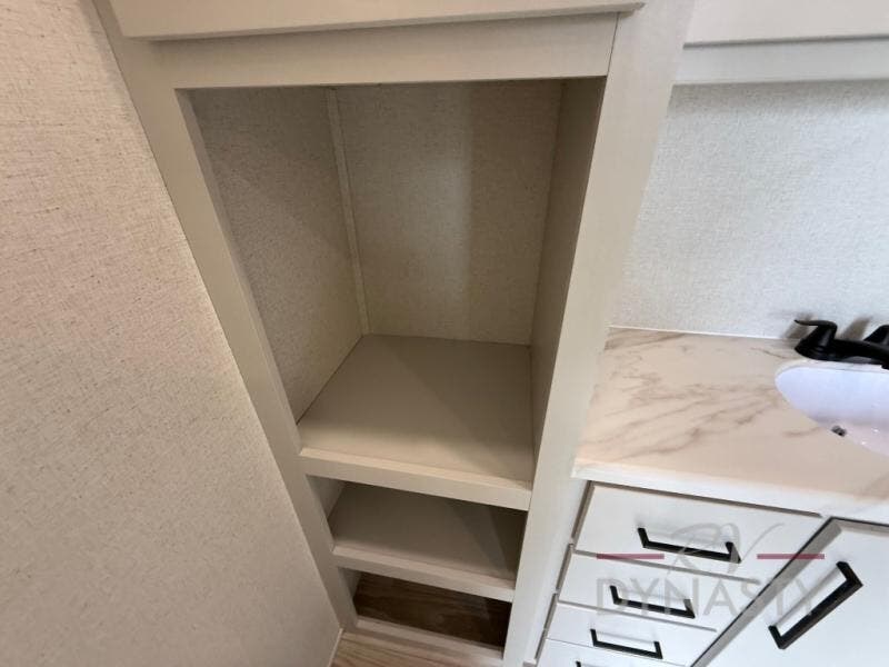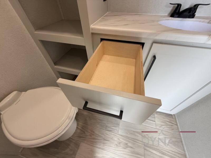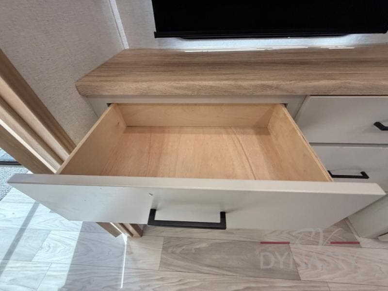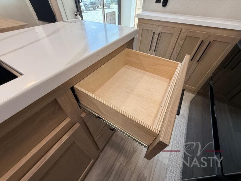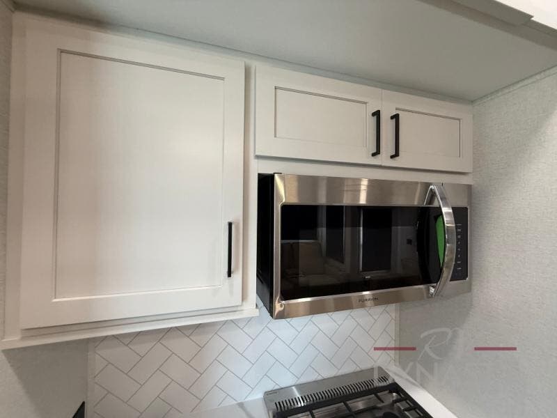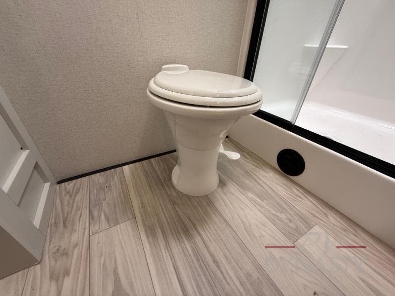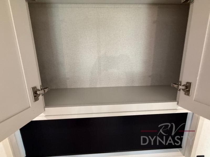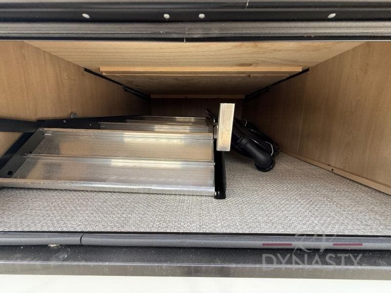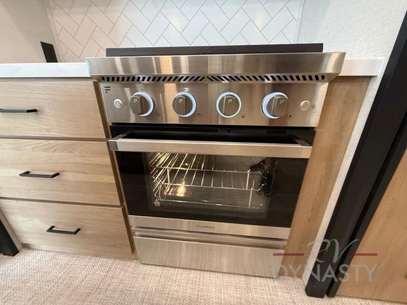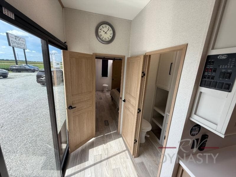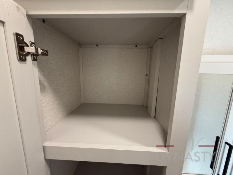 Enjoy extended stays in this triple slide out destination trailer! Once you unload your bags, you can put out the 19' awning with LED lights and relax in your camp chairs. The Chef Collection three burner range will let you make lunch for your crew when you head inside, and there is a free-standing dinette with a bench and two chairs to dine at. After your meal, you can relax on the theater seating across from the entertainment center with a hidden pantry behind it. There is also a front tri-fold hide-a-bed sofa to let guests sleep over. The mid-coach half bath will be easily accessible to use, and the full rear bath will create a master bedroom you are sure to love. There is a king bed slide out here, a dresser with TV prep, and two wardrobes to keep your things tidy!