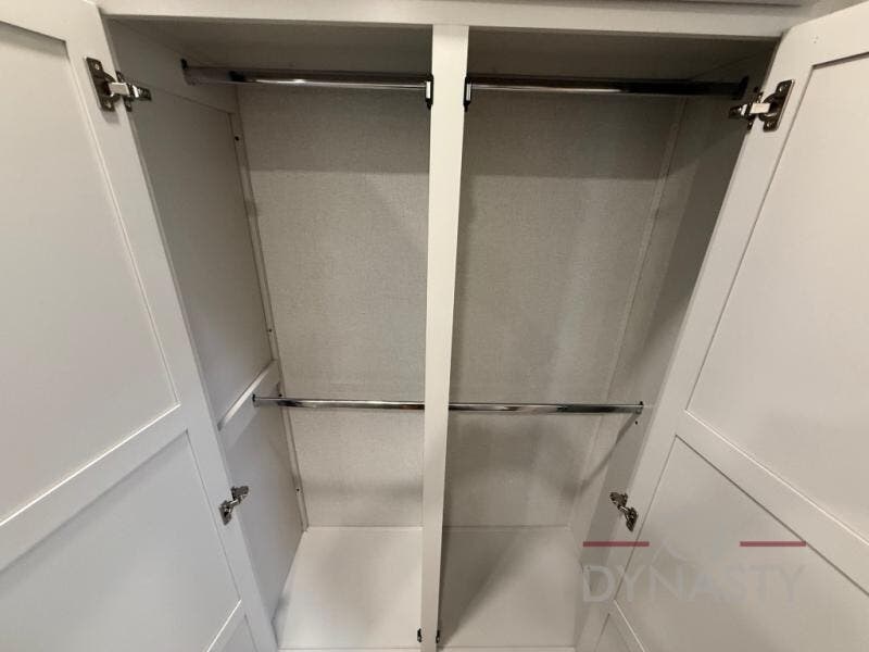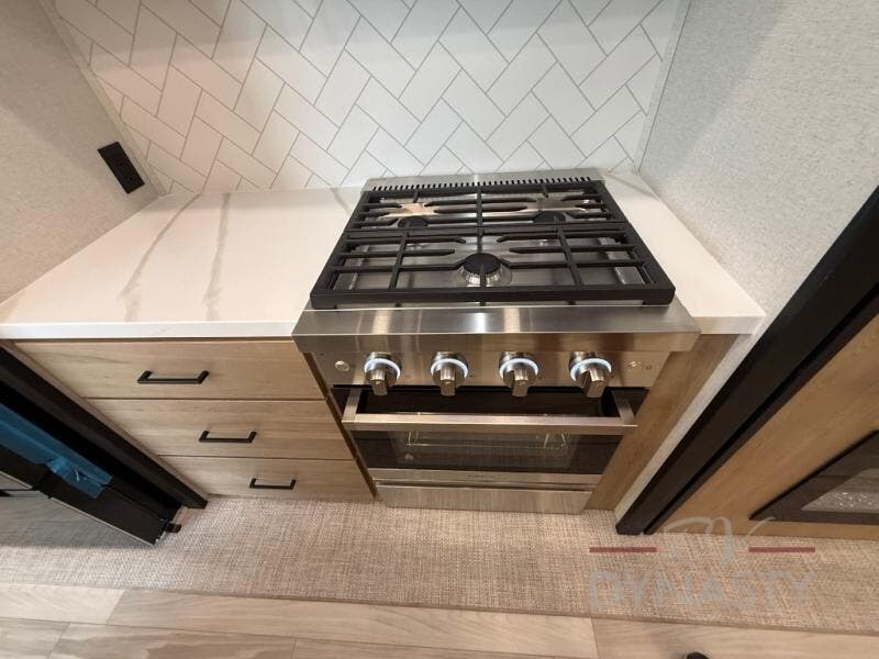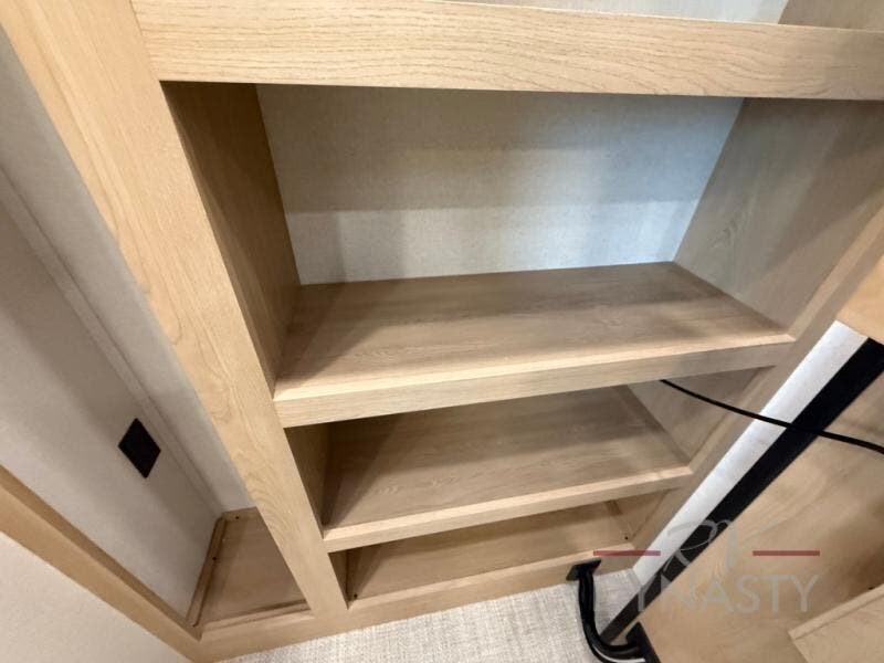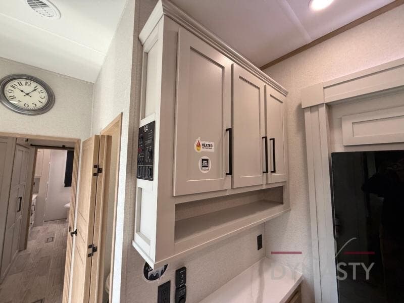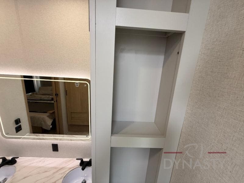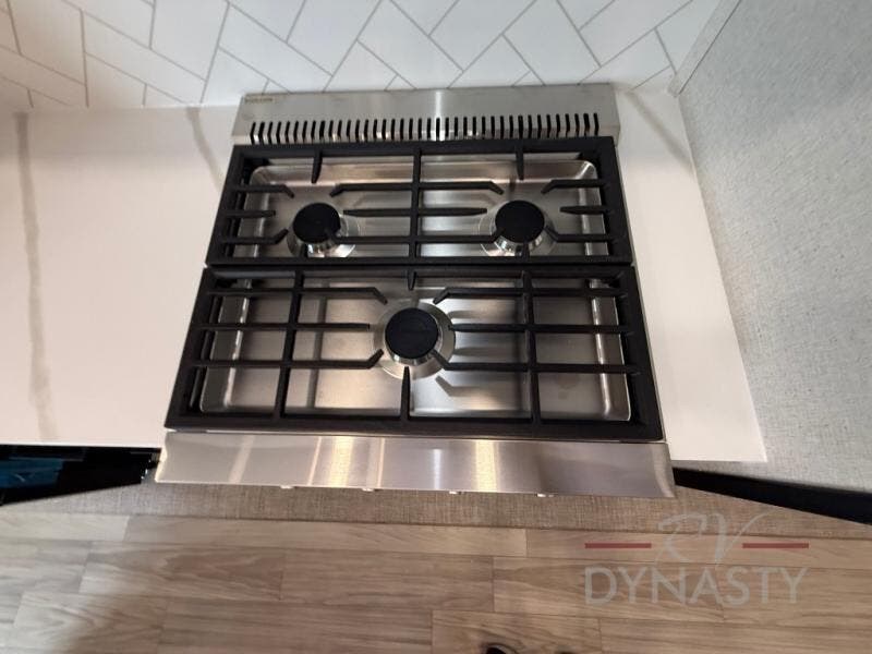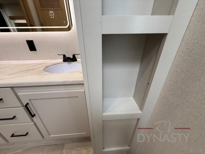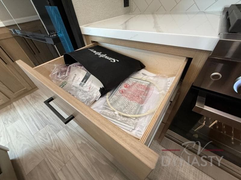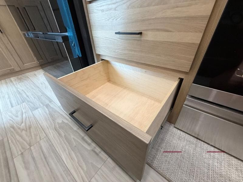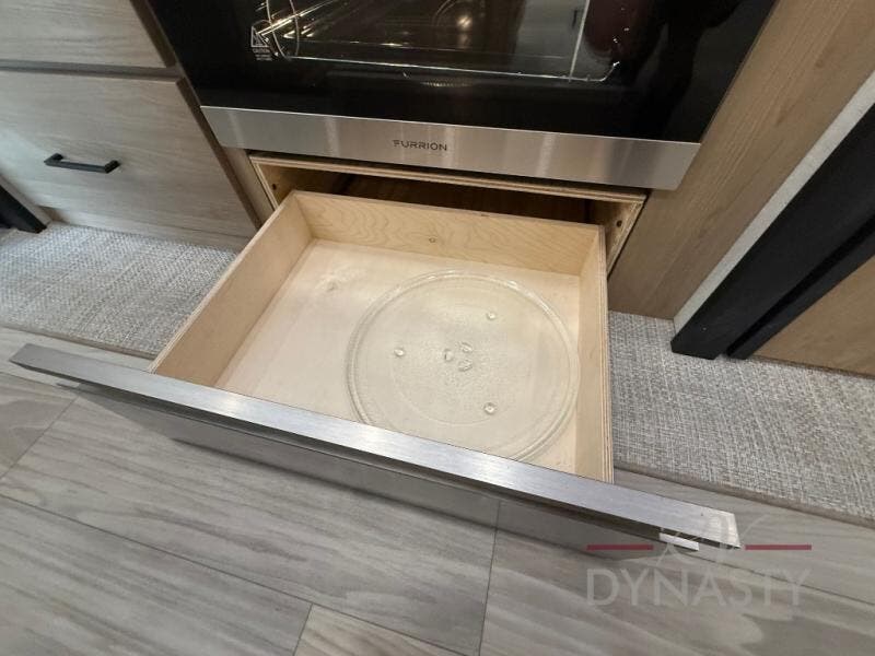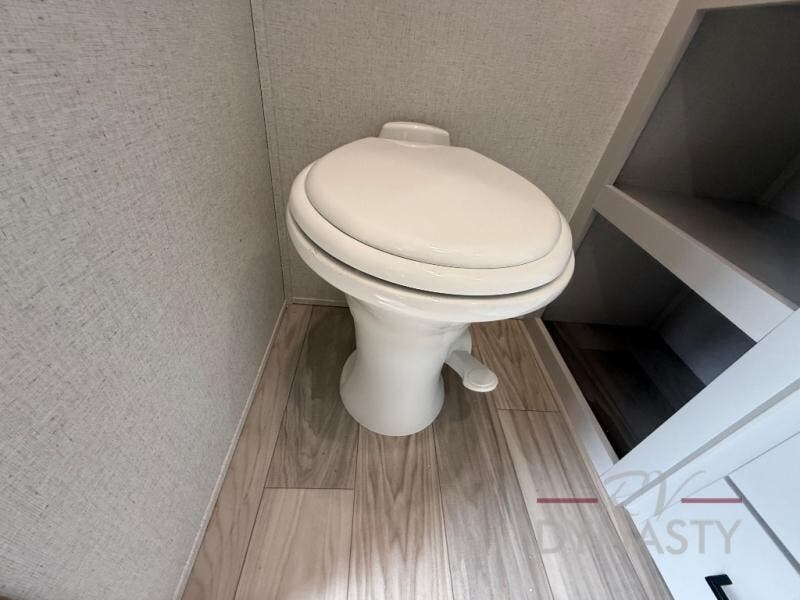 Enjoy extended stays in this triple slide out destination trailer! Once you unload your bags, you can put out the 19' awning with LED lights and relax in your camp chairs. The Chef Collection three burner range will let you make lunch for your crew when you head inside, and there is a free-standing dinette with a bench and two chairs to dine at. After your meal, you can relax on the theater seating across from the entertainment center with a hidden pantry behind it. There is also a front tri-fold hide-a-bed sofa to let guests sleep over. The mid-coach half bath will be easily accessible to use, and the full rear bath will create a master bedroom you are sure to love. There is a king bed slide out here, a dresser with TV prep, and two wardrobes to keep your things tidy!