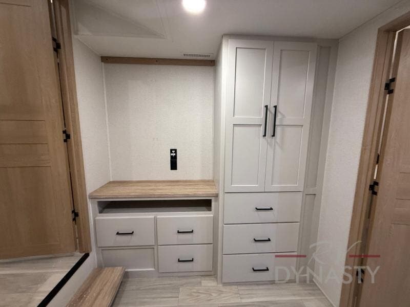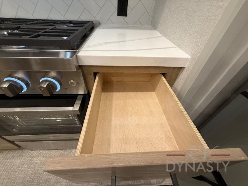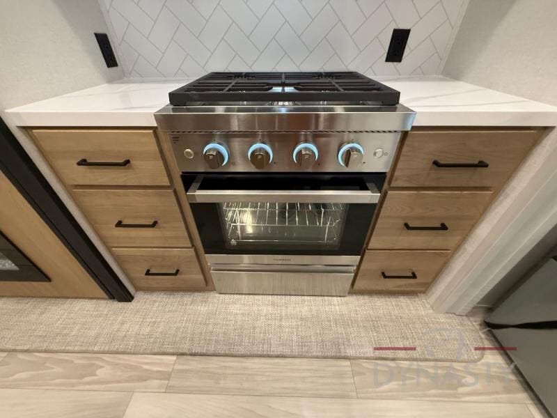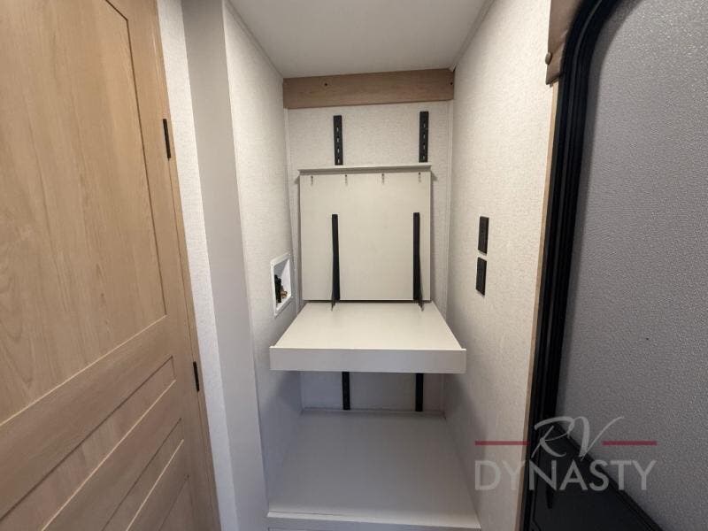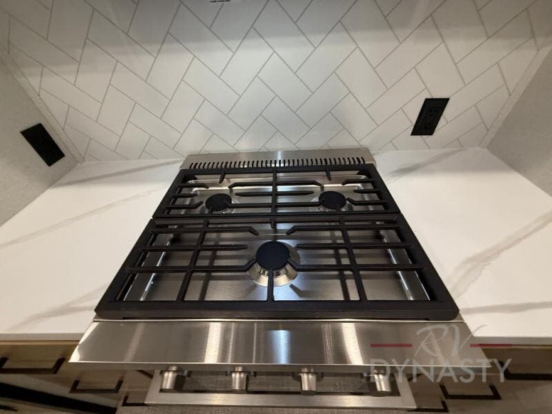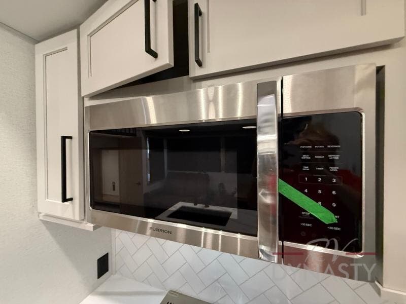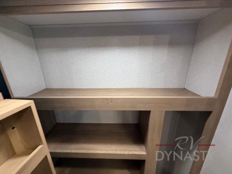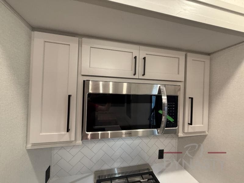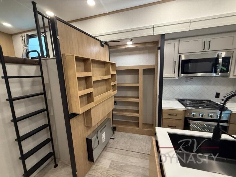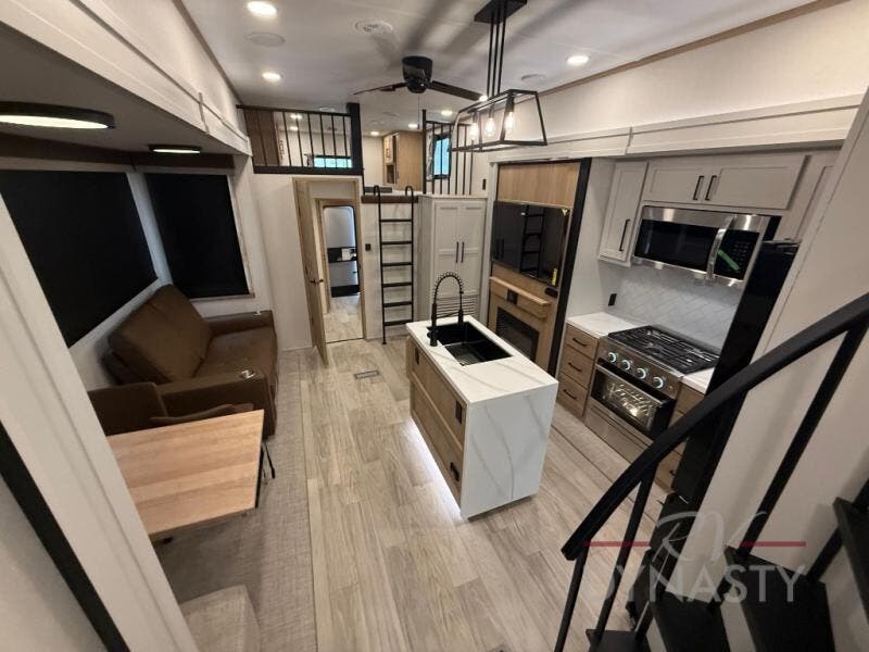 You won't believe the comfort and convenience found in this destination trailer. There are two private bedrooms; one up front with a queen bed slide out and storage space, and one in back with a queen bed slide out and a half bath! There is even washer and dryer prep here if you want to add those appliances and the second entry door is also found in this location so you can easily slip out in the morning. Above each of these rooms is a loft providing three total bunk mats for sleeping, storage cabinets, and TV prep if you want to add entertainment. Everyone can meet in the combined kitchen and living room that includes dual opposing slides, a 60" theater seating across from a 50" flat screen TV and fireplace, plus a free-standing table with chairs and a bench to dine at. The chef of your group will love the large kitchen island, Chef Collection three burner range, and a 16.2 cu. ft. refrigerator for food storage.