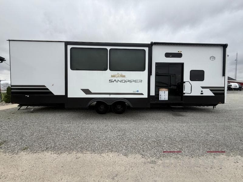 With each Sandpiper Destination Trailer by Forest River you will enjoy many luxurious features, such as crown molding over the kitchen cabinets, solid surface kitchen countertops, a memory foam mattress, plus so much more. The extra large picture windows throughout let natural light in and provide beautiful outdoor views, and each model includes three or more slides for added interior space. You'll find many exterior conveniences, like the porch light with an interior switch, the rain gutters with extra long drip spouts to prevent black streaking, and an electric awning with LED light strip, plus more! You will stay comfortable year around with dual 15,000 A/C units plus each model is constructed with an Underbelly Armor for better protection and insulation!