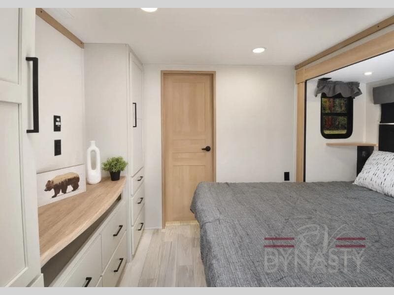 One look at this destination trailer and you'll be sold! You'll love waking up each morning in the master bedroom with a king bed slide out, dual nightstands, and a dresser to keep clothes organized. There is also a spacious front bathroom with a walk-in closet! As you walk to the main living area, you'll find the half bath with washer and dryer prep if you plan to add these appliances. A tri-fold hide-a-bed sofa and theater seating in the living area will let you relax each day, and the bar with stools overlooks the kitchen so you can visit with the chef while dinner is being made.