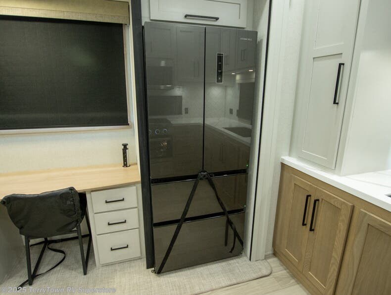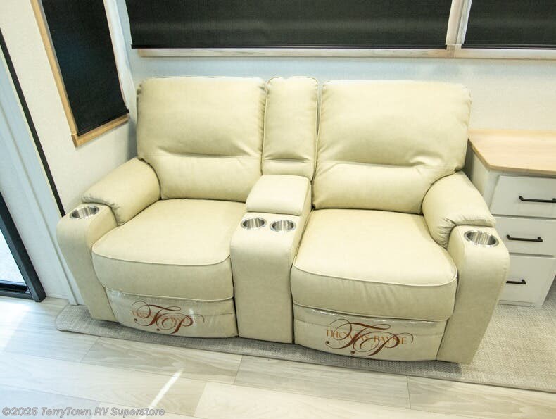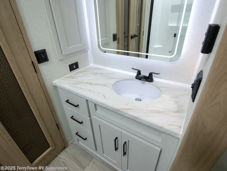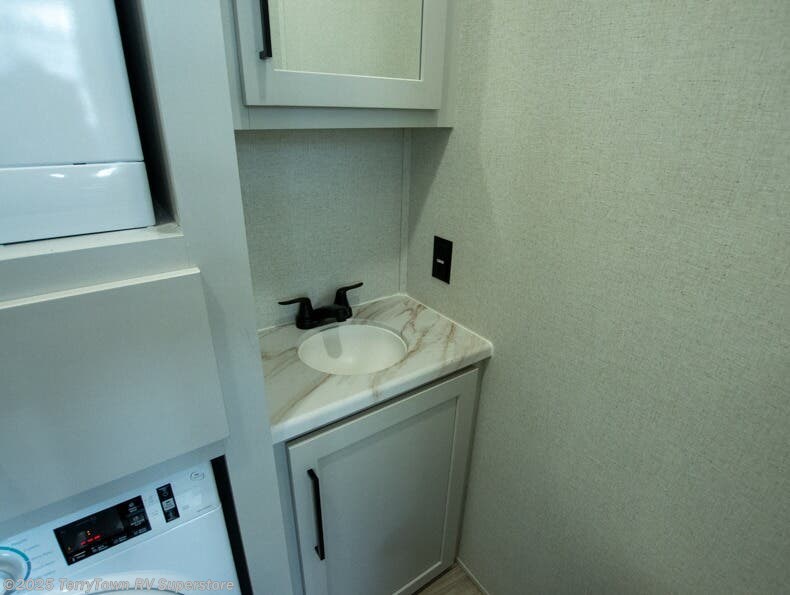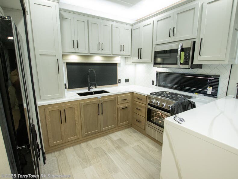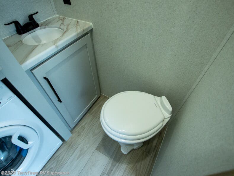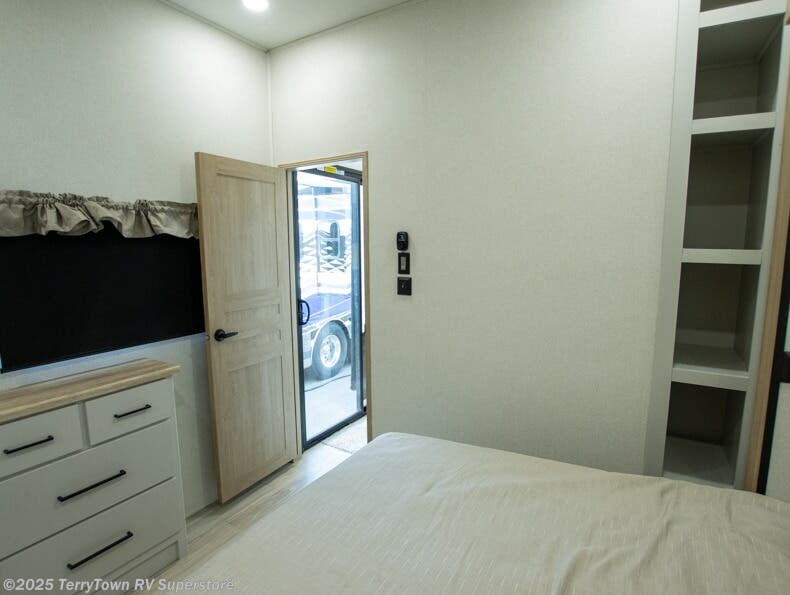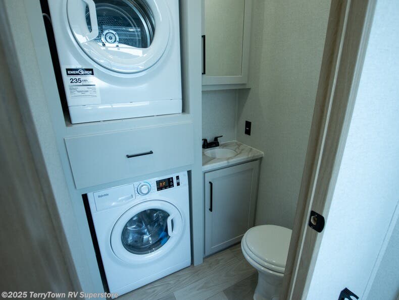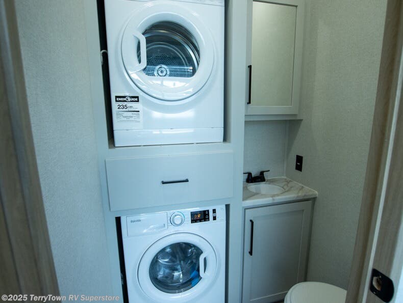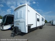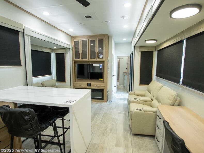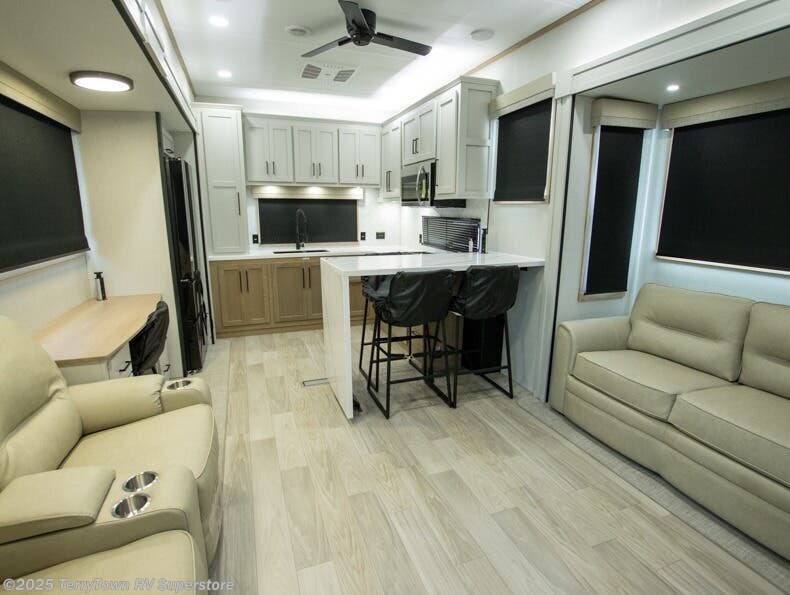 One look at this destination trailer and you'll be sold! You'll love waking up each morning in the master bedroom with a king bed slide out, dual nightstands, and a dresser to keep clothes organized. There is also a spacious front bathroom with a walk-in closet! As you walk to the main living area, you'll find the half bath with washer and dryer prep if you plan to add these appliances. A tri-fold hide-a-bed sofa and theater seating in the living area will let you relax each day, and the bar with stools overlooks the kitchen so you can visit with the chef while dinner is being made.