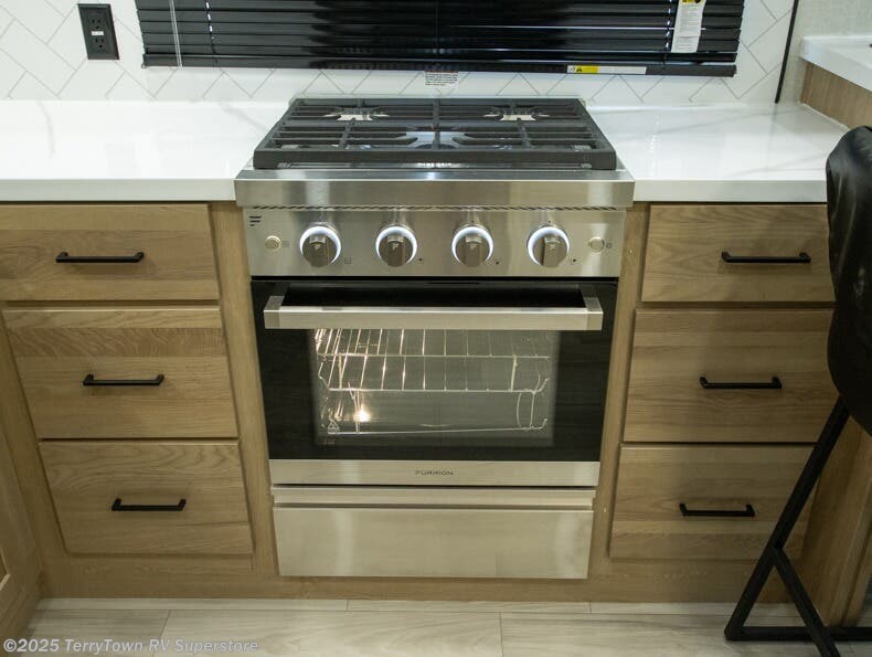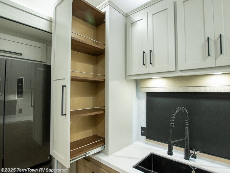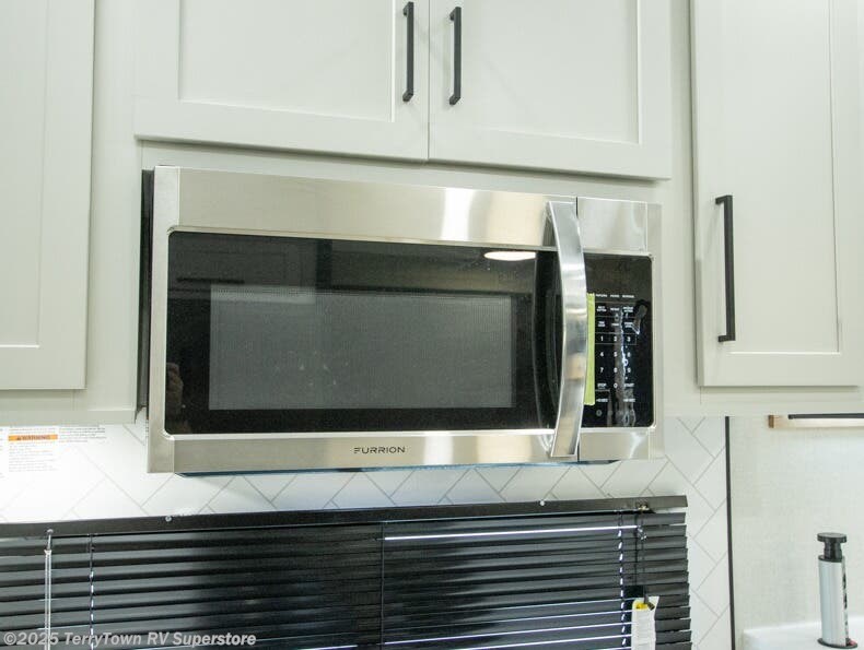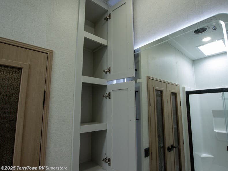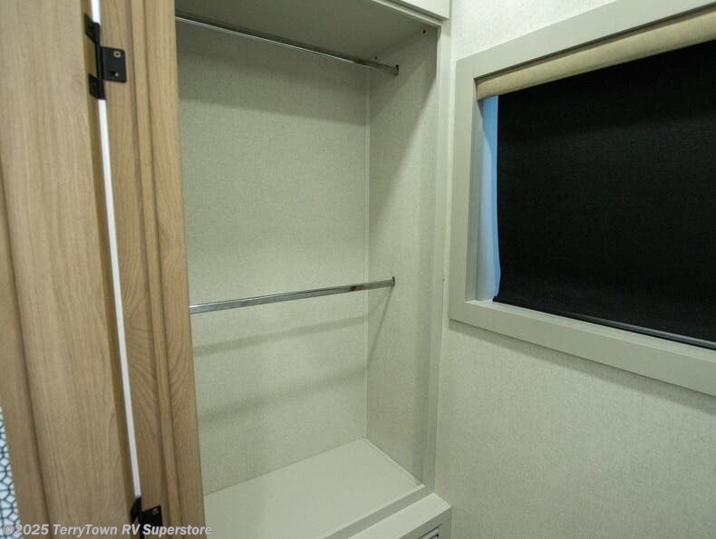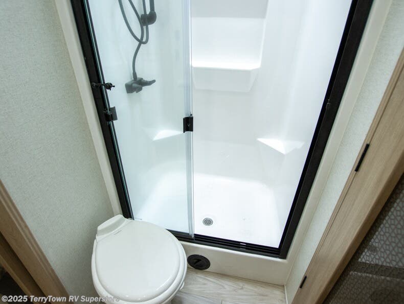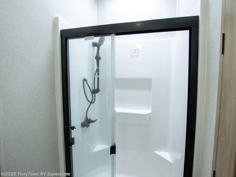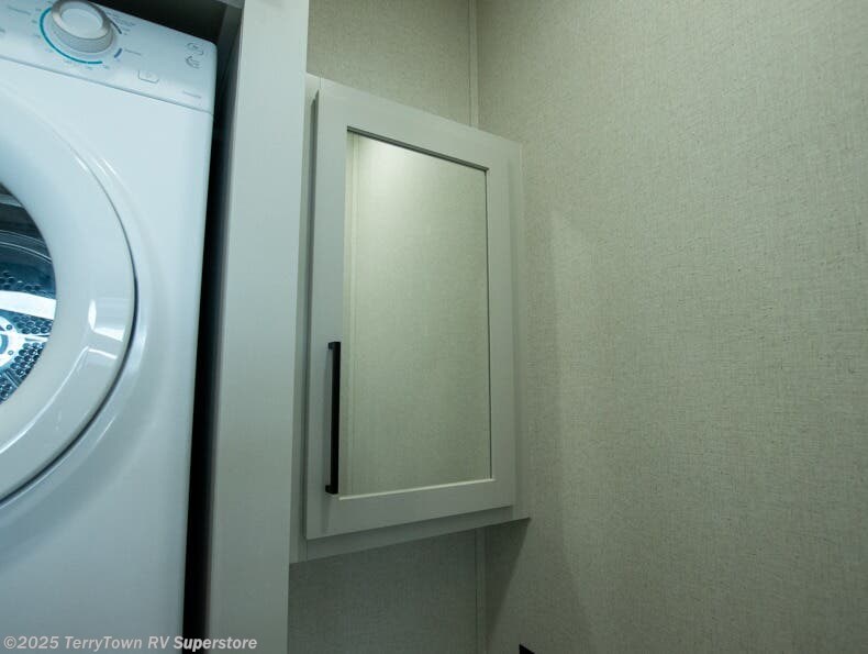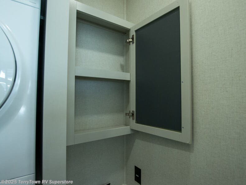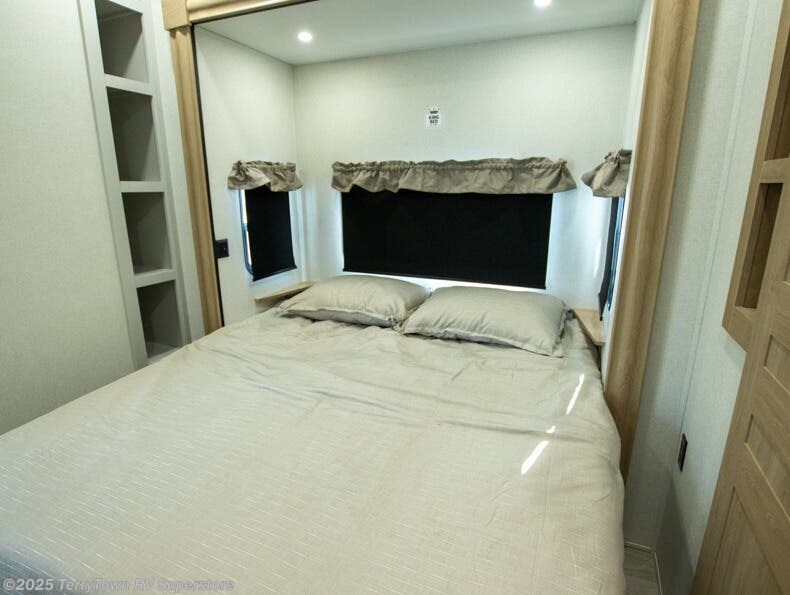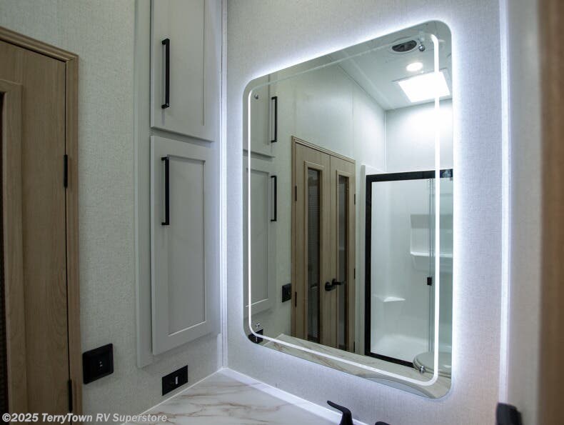 One look at this destination trailer and you'll be sold! You'll love waking up each morning in the master bedroom with a king bed slide out, dual nightstands, and a dresser to keep clothes organized. There is also a spacious front bathroom with a walk-in closet! As you walk to the main living area, you'll find the half bath with washer and dryer prep if you plan to add these appliances. A tri-fold hide-a-bed sofa and theater seating in the living area will let you relax each day, and the bar with stools overlooks the kitchen so you can visit with the chef while dinner is being made.