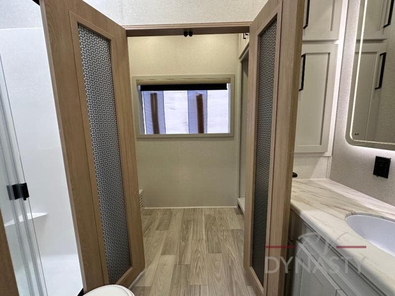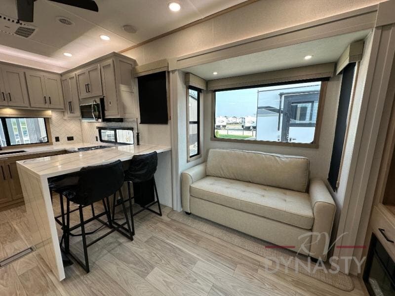 One look at this destination trailer and you'll be sold! You'll love waking up each morning in the master bedroom with a king bed slide out, dual nightstands, and a dresser to keep clothes organized. There is also a spacious front bathroom with a walk-in closet! As you walk to the main living area, you'll find the half bath with washer and dryer prep if you plan to add these appliances. A tri-fold hide-a-bed sofa and theater seating in the living area will let you relax each day, and the bar with stools overlooks the kitchen so you can visit with the chef while dinner is being made.