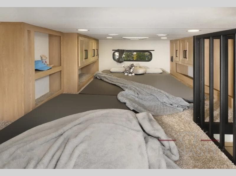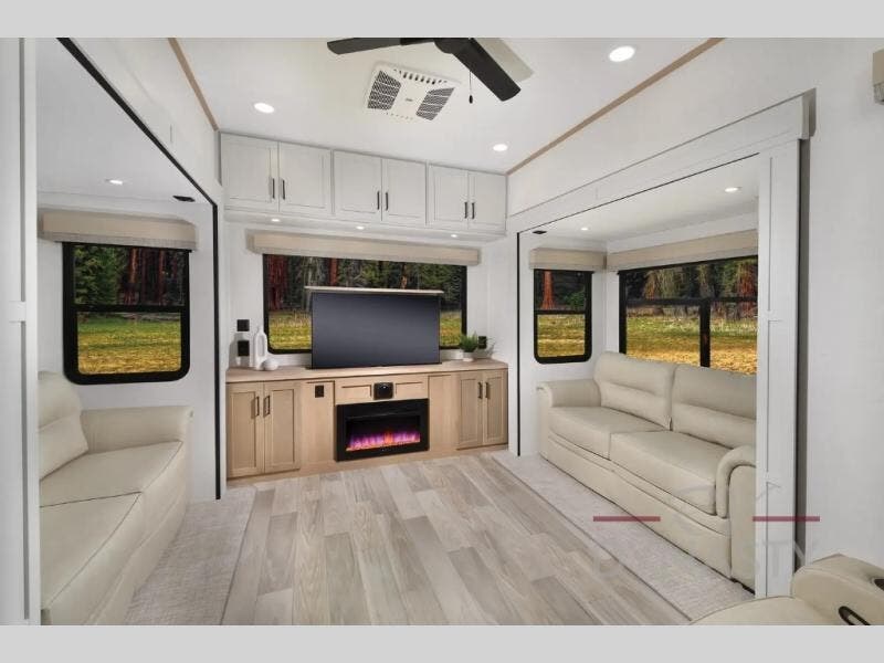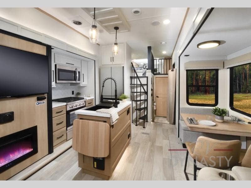 You won't believe the comfort and convenience found in this destination trailer. There are two private bedrooms; one up front with a queen bed slide out and storage space, and one in back with a queen bed slide out and a half bath! There is even washer and dryer prep here if you want to add those appliances and the second entry door is also found in this location so you can easily slip out in the morning. Above each of these rooms is a loft providing three total bunk mats for sleeping, storage cabinets, and TV prep if you want to add entertainment. Everyone can meet in the combined kitchen and living room that includes dual opposing slides, a 60" theater seating across from a 50" flat screen TV and fireplace, plus a free-standing table with chairs and a bench to dine at. The chef of your group will love the large kitchen island, Chef Collection three burner range, and a 16.2 cu. ft. refrigerator for food storage.