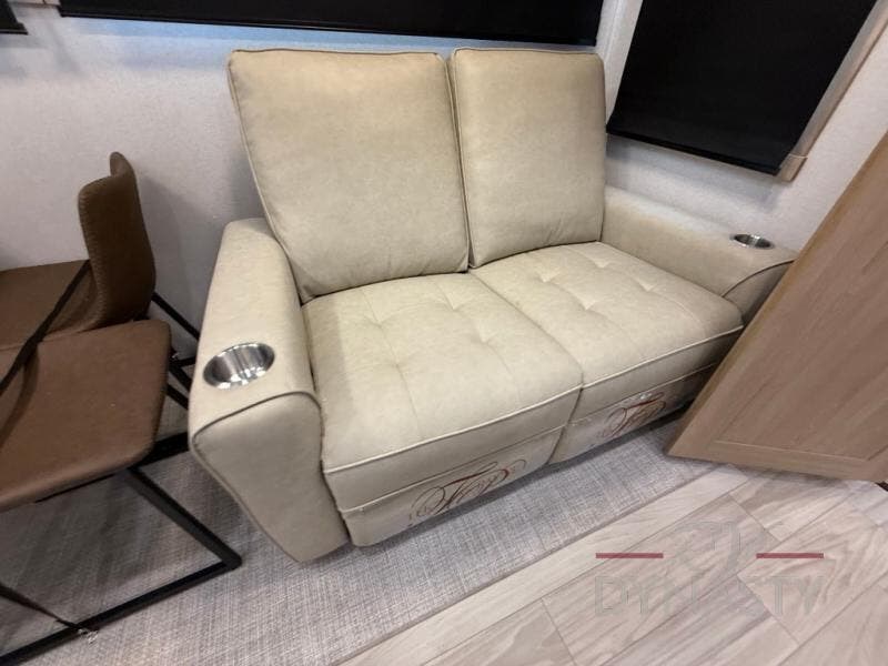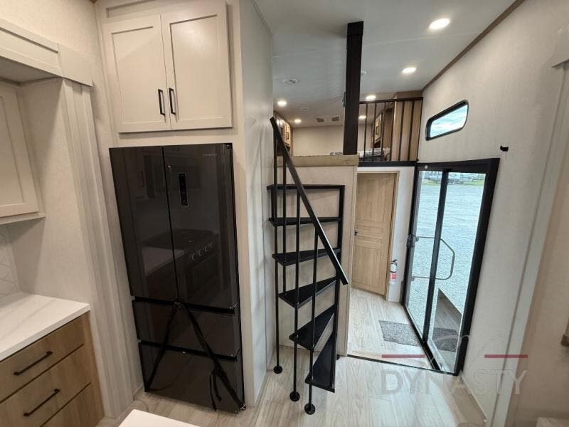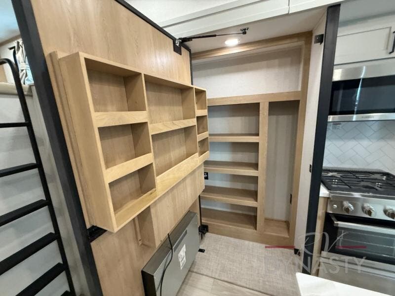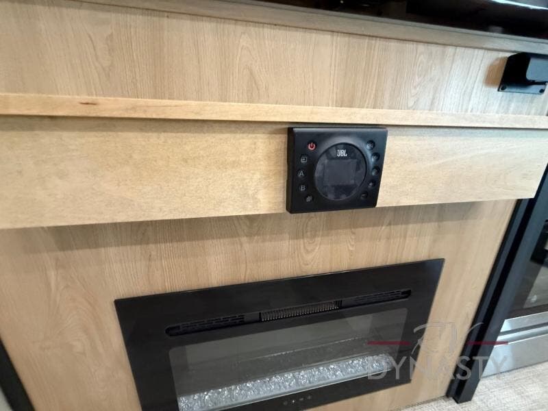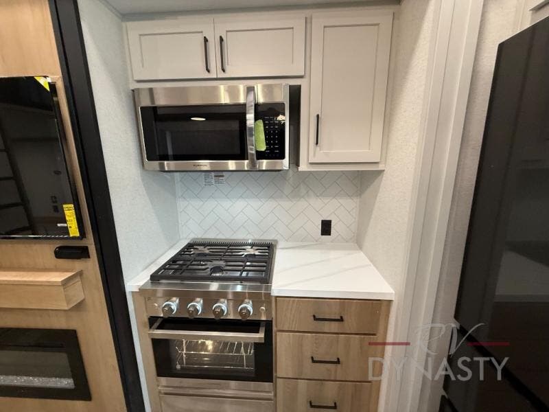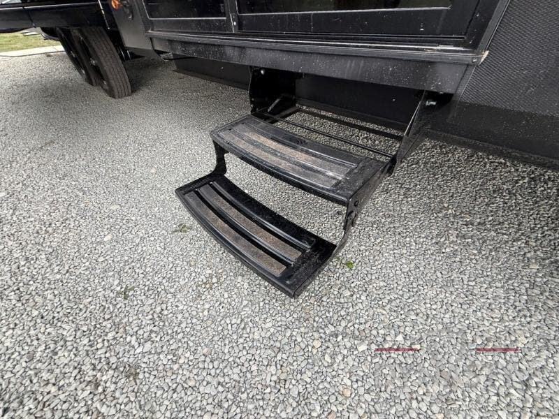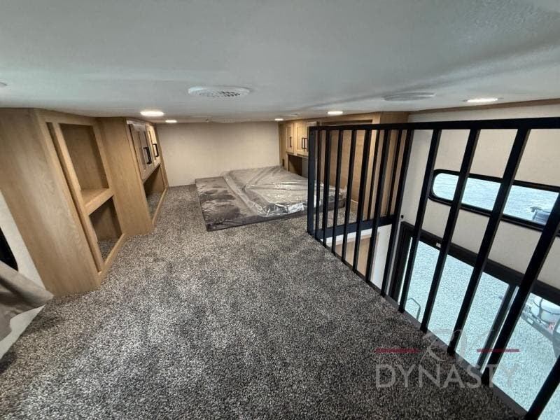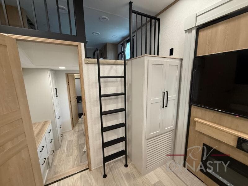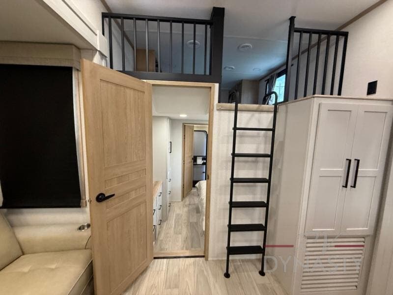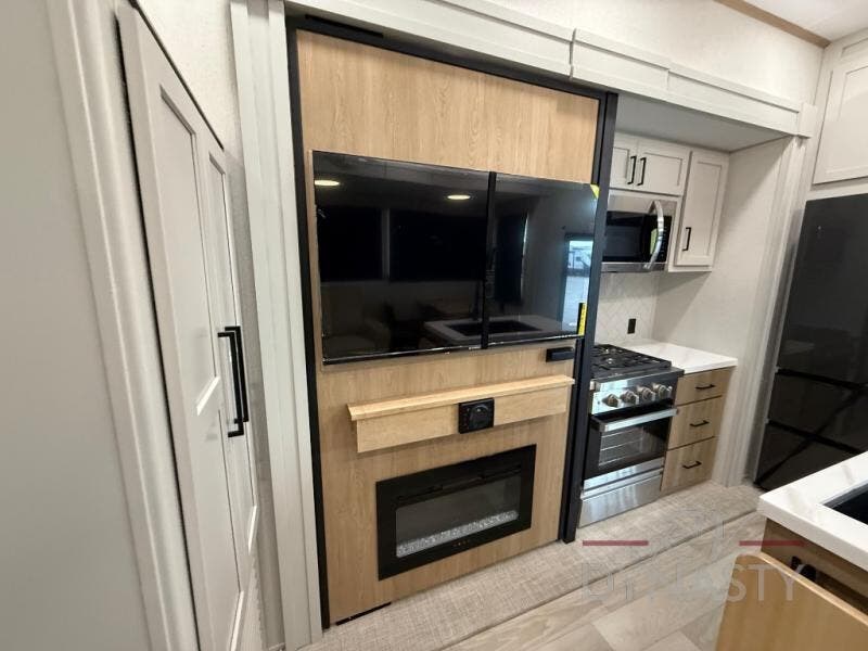 You won't believe the comfort and convenience found in this destination trailer. There are two private bedrooms; one up front with a queen bed slide out and storage space, and one in back with a queen bed slide out and a half bath! There is even washer and dryer prep here if you want to add those appliances and the second entry door is also found in this location so you can easily slip out in the morning. Above each of these rooms is a loft providing three total bunk mats for sleeping, storage cabinets, and TV prep if you want to add entertainment. Everyone can meet in the combined kitchen and living room that includes dual opposing slides, a 60" theater seating across from a 50" flat screen TV and fireplace, plus a free-standing table with chairs and a bench to dine at. The chef of your group will love the large kitchen island, Chef Collection three burner range, and a 16.2 cu. ft. refrigerator for food storage.