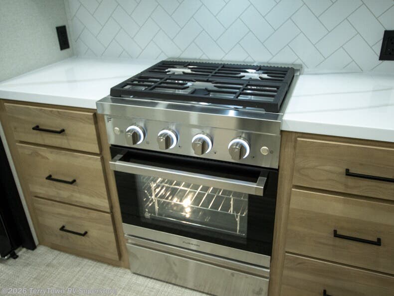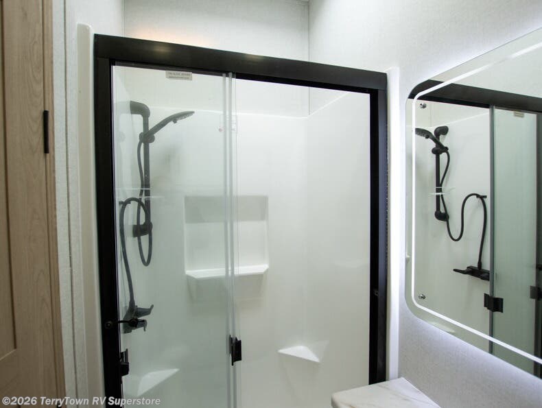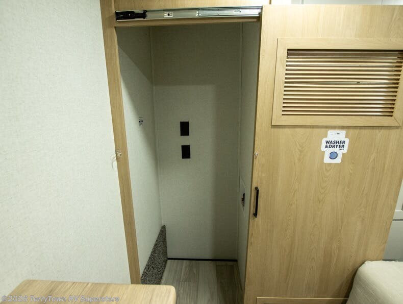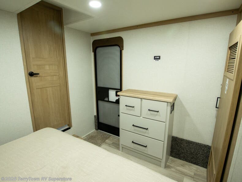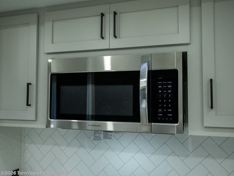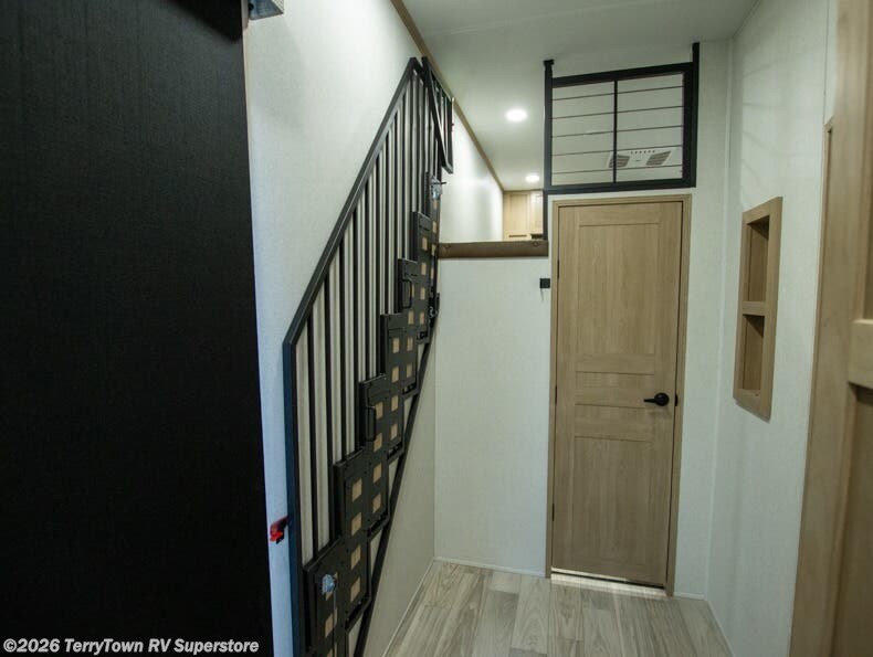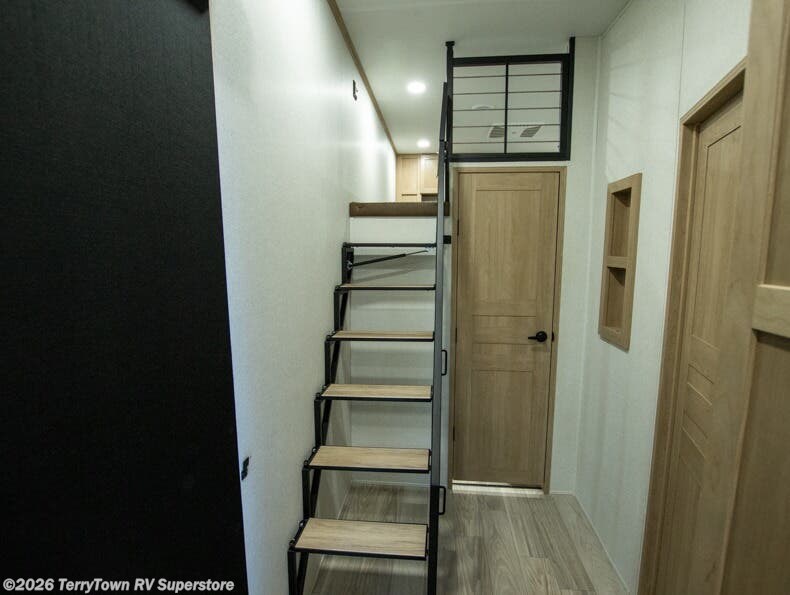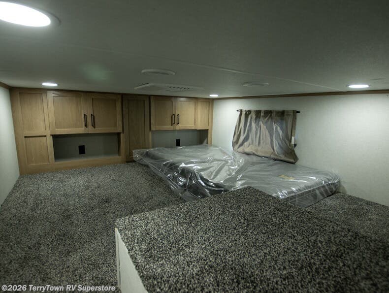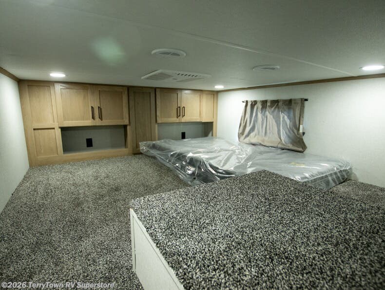This incredible destination trailer has everything you need to live life to the fullest. Imagine retreating to a peaceful rear bedroom, complete with a king bed slide, spacious wardrobe, plus a closet with washer and dryer prep. Unwind and pamper yourself in style in the incredible full bathroom, featuring a linen closet, medicine cabinets, and a fiberglass shower with a seat. The living room is the heart of the home, boasting a comfortable sectional sofa, ottoman, and entertainment center perfect for gathering with family or friends and creating unforgettable memories. The loft is a cozy retreat for kids or guests, featuring two bunk mats, and a dual wardrobe/bookcases for their things. The front kitchen has a 19 cu. ft. refrigerator, overhead cabinet, microwave, three-burner cooktop, and free-standing dinette with a waterfall edge, and the pantry provides ample storage for all your favorite foods. Finally, step outside and enjoy the shade and protection of the two awnings and the two entry and two exit doors will make it easy to come and go.