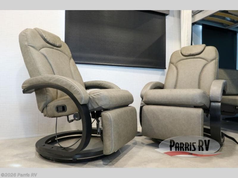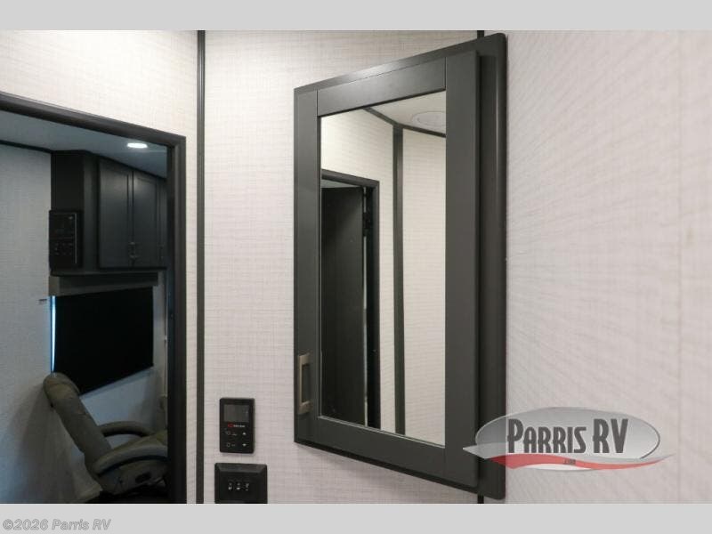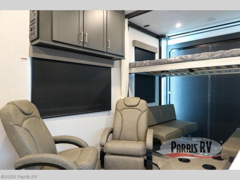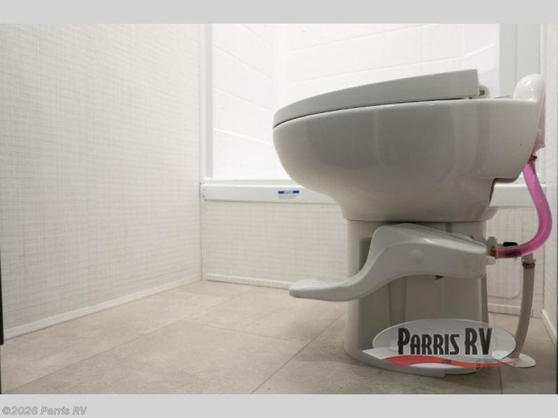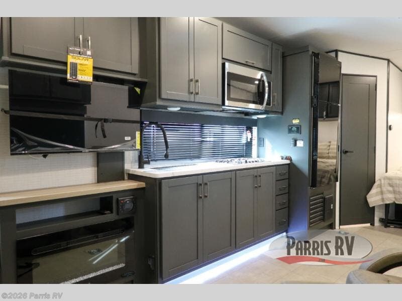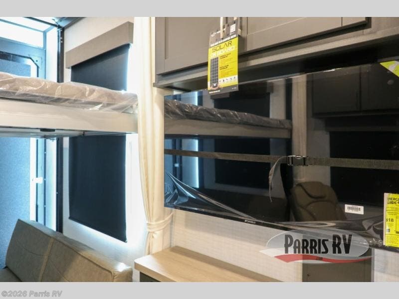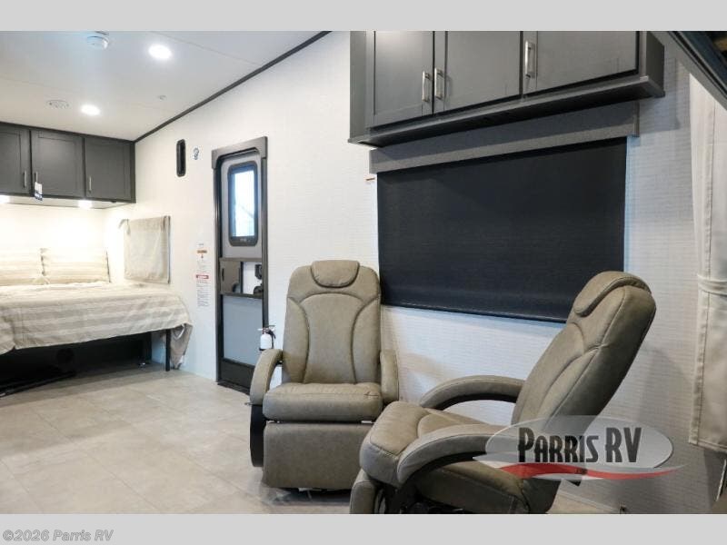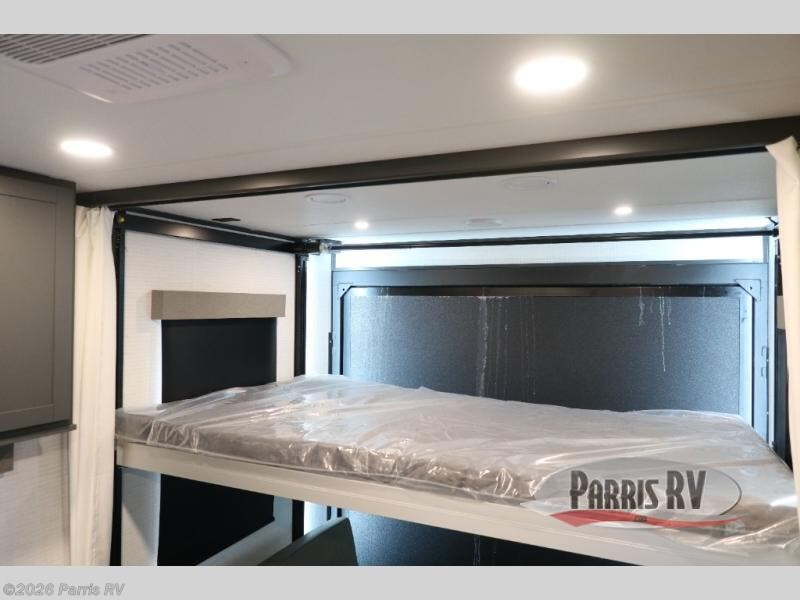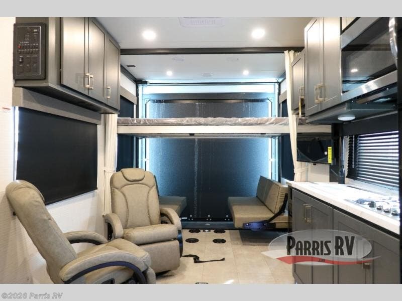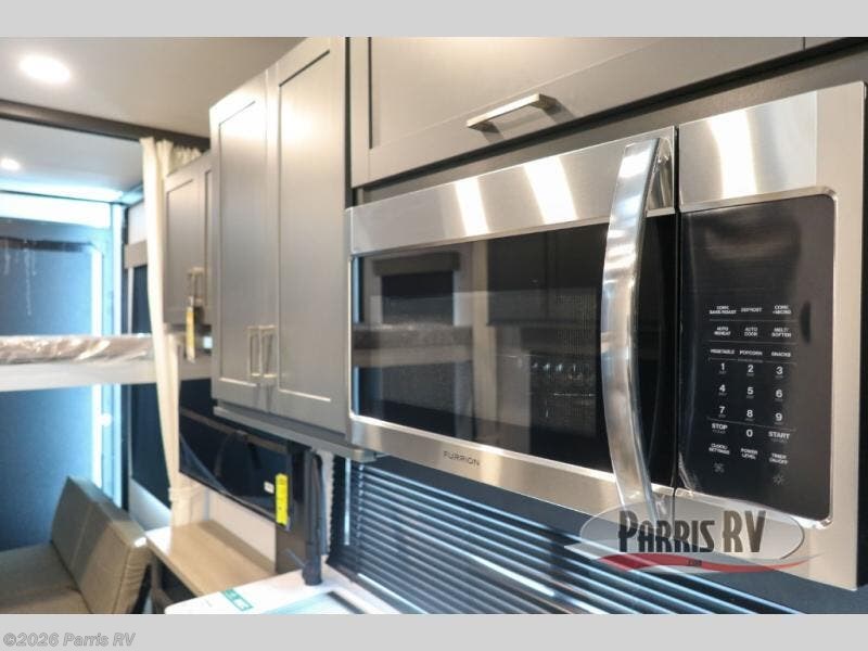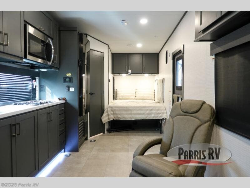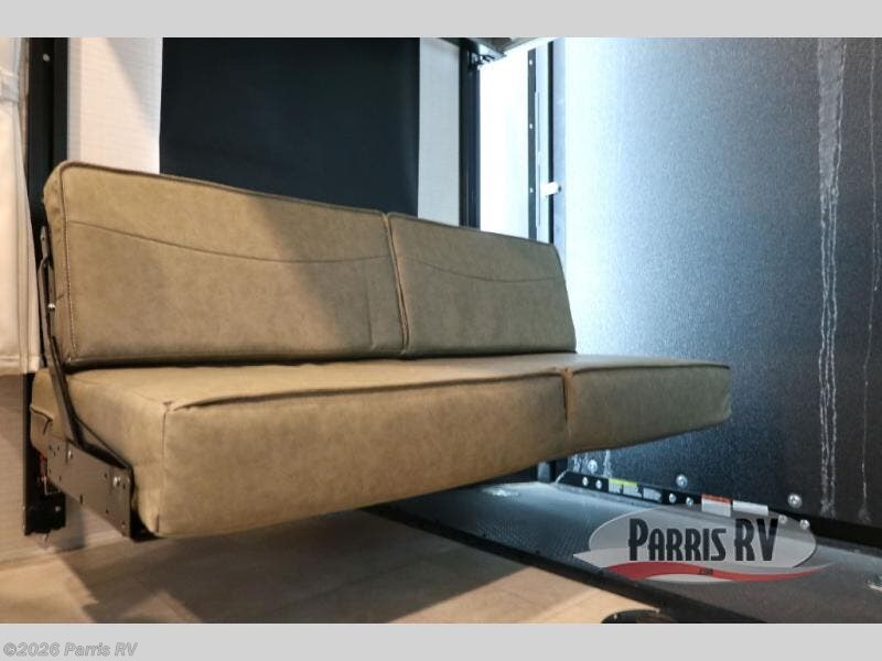 At the front, you’ll find a comfortable 54" x 74" Murphy bed that provides a cozy place to get a great night’s rest, conveniently paired with a dresser below to keep your clothing and essentials neatly stored. In the opposite front corner, a full bathroom offers the comfort and privacy of home, so there’s no need to rely on campsite facilities. Moving toward the center, an impressive garage that expands up to 21' delivers exceptional storage space, giving you plenty of room for your toys and gear without worrying about fit. The living area features a well-equipped kitchen with the essentials to prepare meals on the road, including a convection microwave and a spacious 10.7 cu. ft. refrigerator. At the rear, the electric pass-through dinette creates the perfect spot to dine or enjoy board games, then easily converts into additional sleeping space, complemented by a 54" x 80"electric bed to comfortably accommodate guests.