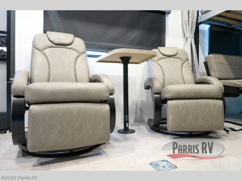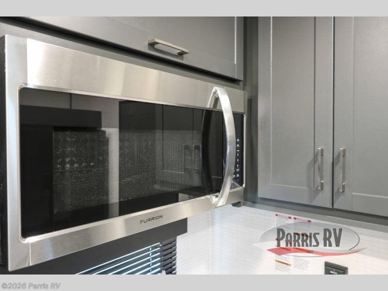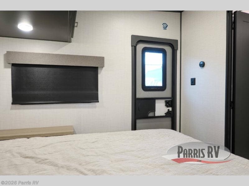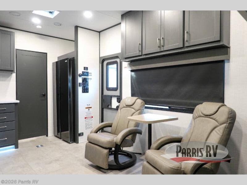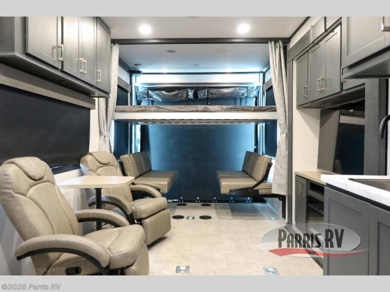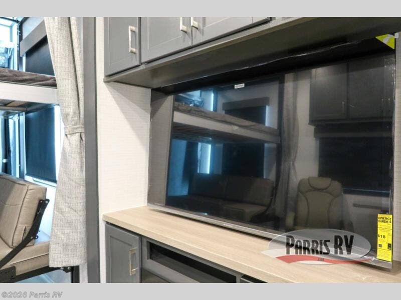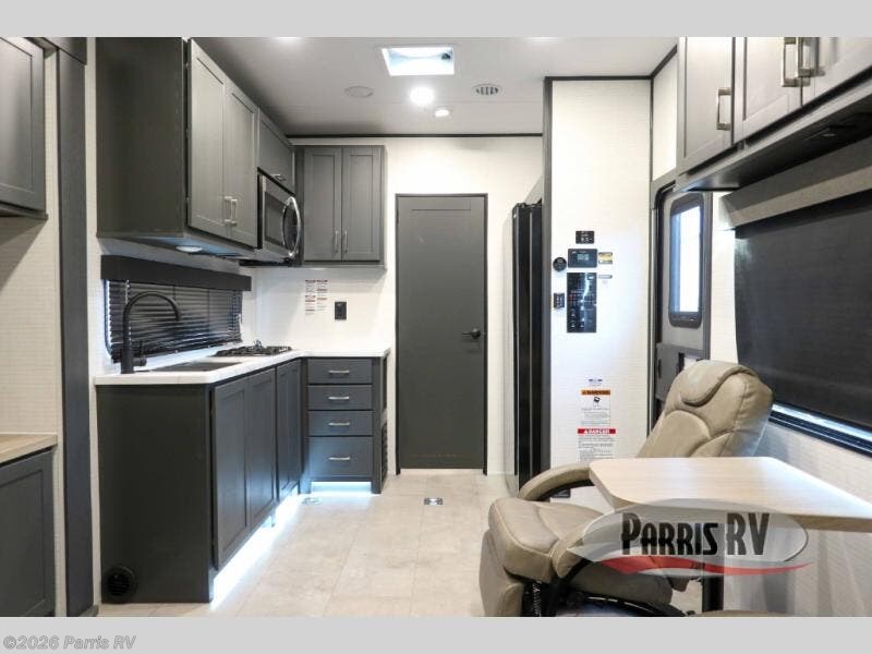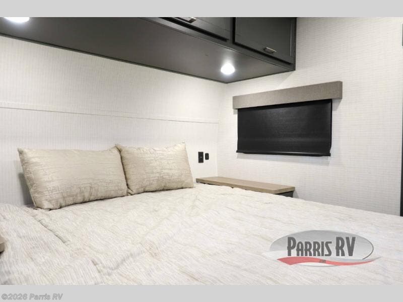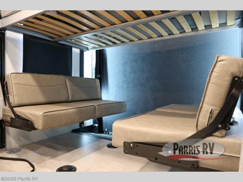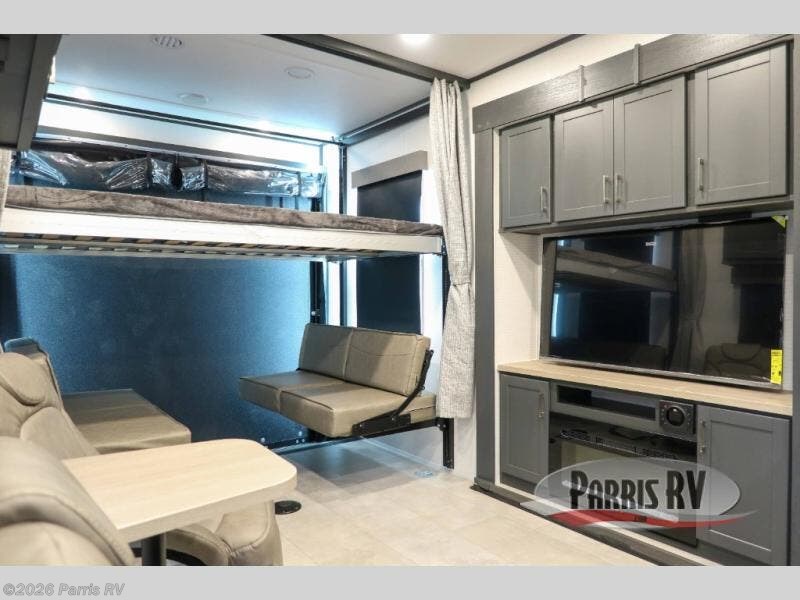 Are you looking for a travel trailer that can haul your favorite riding toys and still provide at-home comforts? This toy hauler is the one with 15' 1" total garage space, a front master bedroom with a king bed and dresser slide out, and a walk-through bath! The main living area also includes many comforts, like the dual lounge chairs, entertainment center slide out with a fireplace, and full kitchen. Your guests will find their beds on the electric pass-thru dinette or the drop-down electric bed!