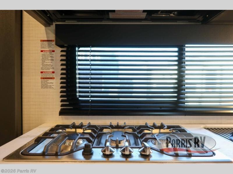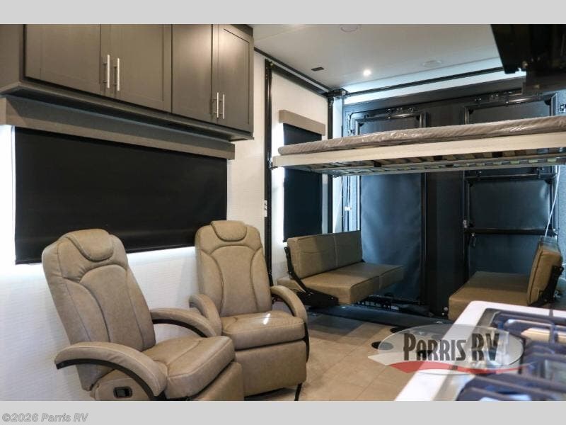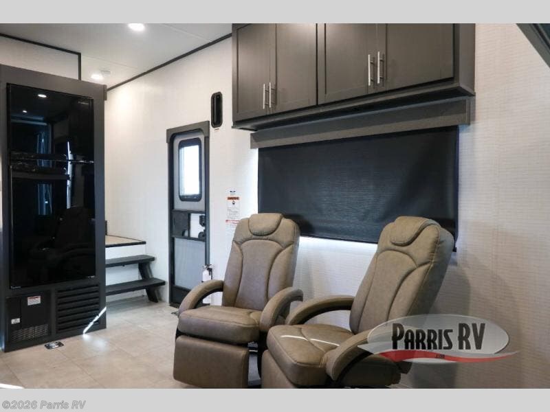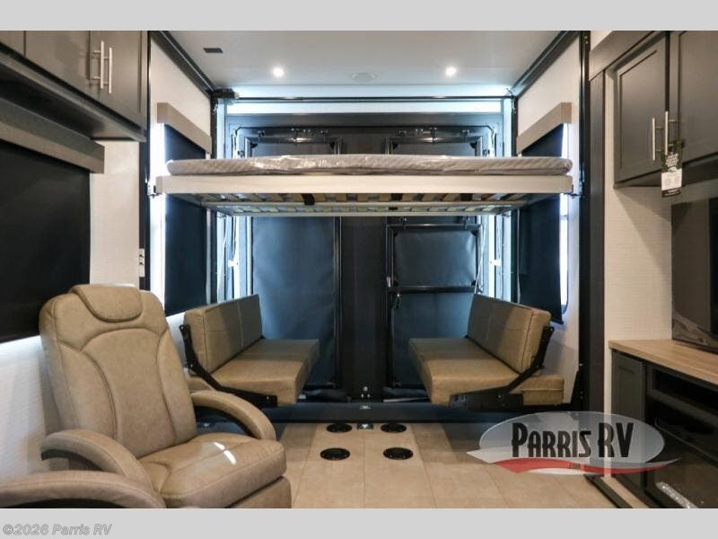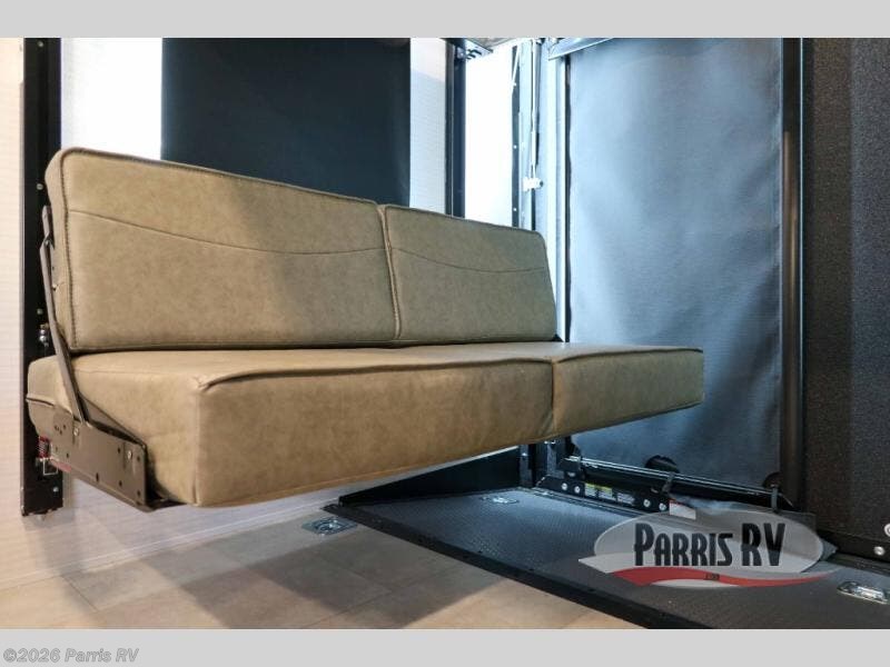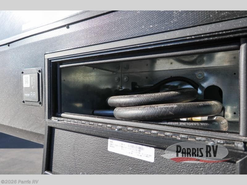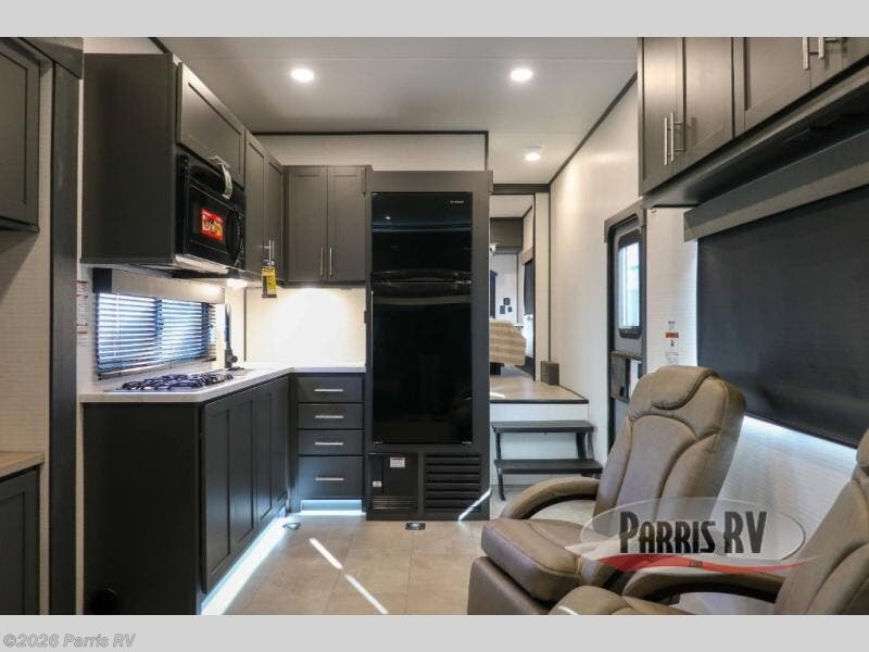 This toy hauler features 15' 7" of total garage space so you can easily fit your toys in! Once they're unloaded, you can relax on the electric pass-thru dinette or dual lounge chairs. There is also an entertainment center slide here. You'll find a cooktop and convection microwave in the kitchen to make meals each day. The full bath will let you clean up after trail riding, and the front private bedroom with a king bed is sure to bring a great night's rest. There is also a dresser slide out in the bedroom for added storage and space!